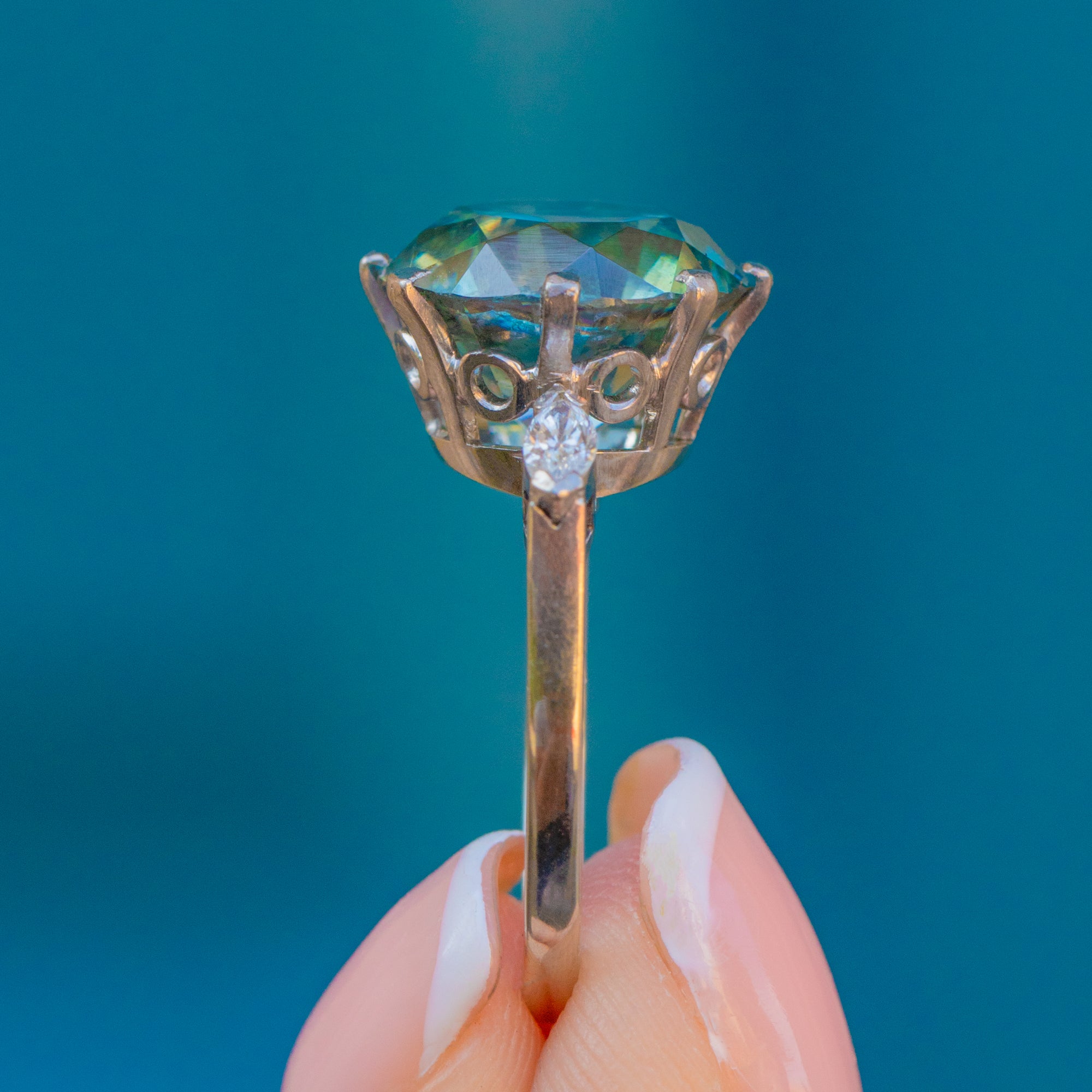 This Art Deco 14ct Gold and Platinum Blue Zircon Diamond ring is a phenomenal find! This lively blue Zircon ring leaves little to the imagination, with its 7.70ct blue Zircon gemstone taking centre stage.