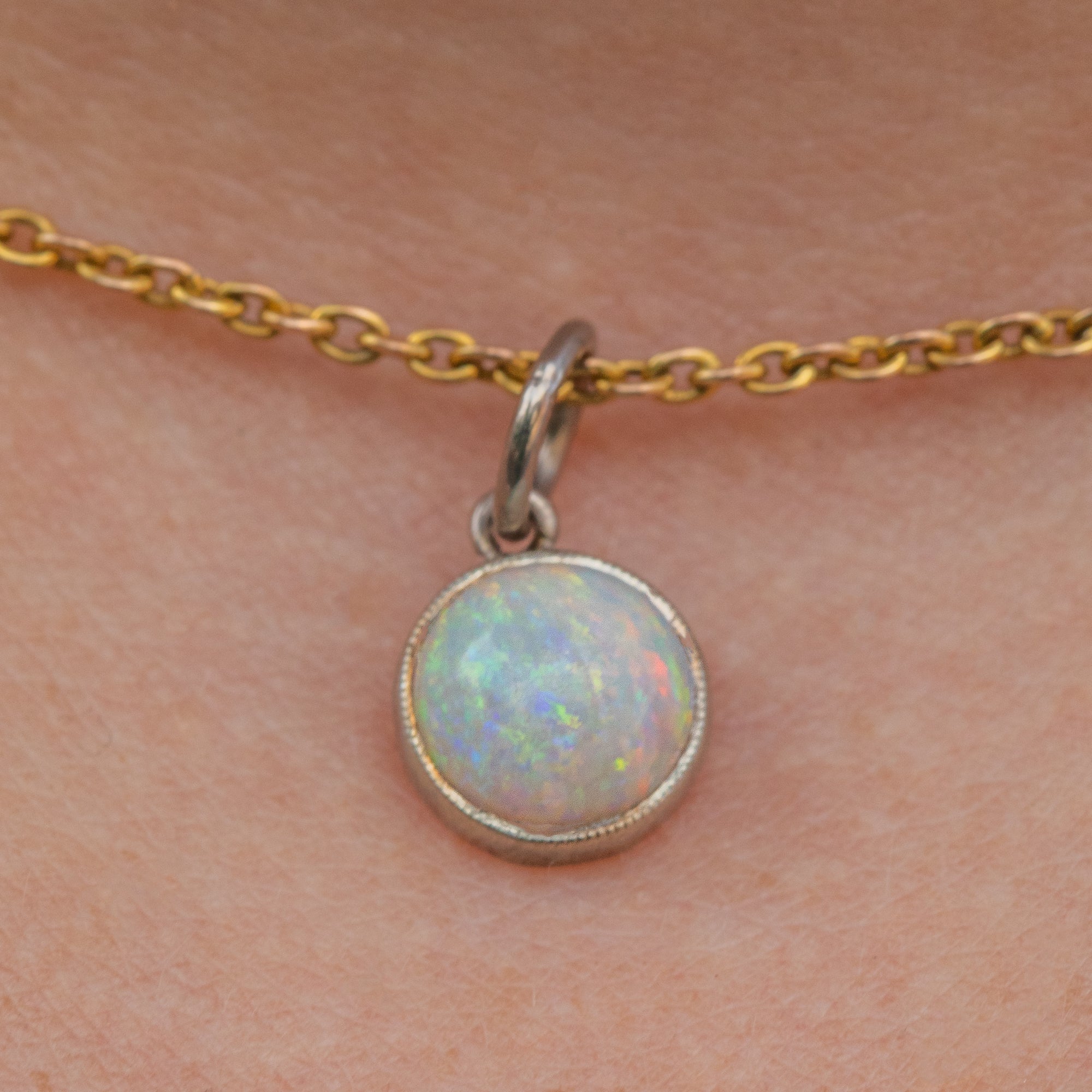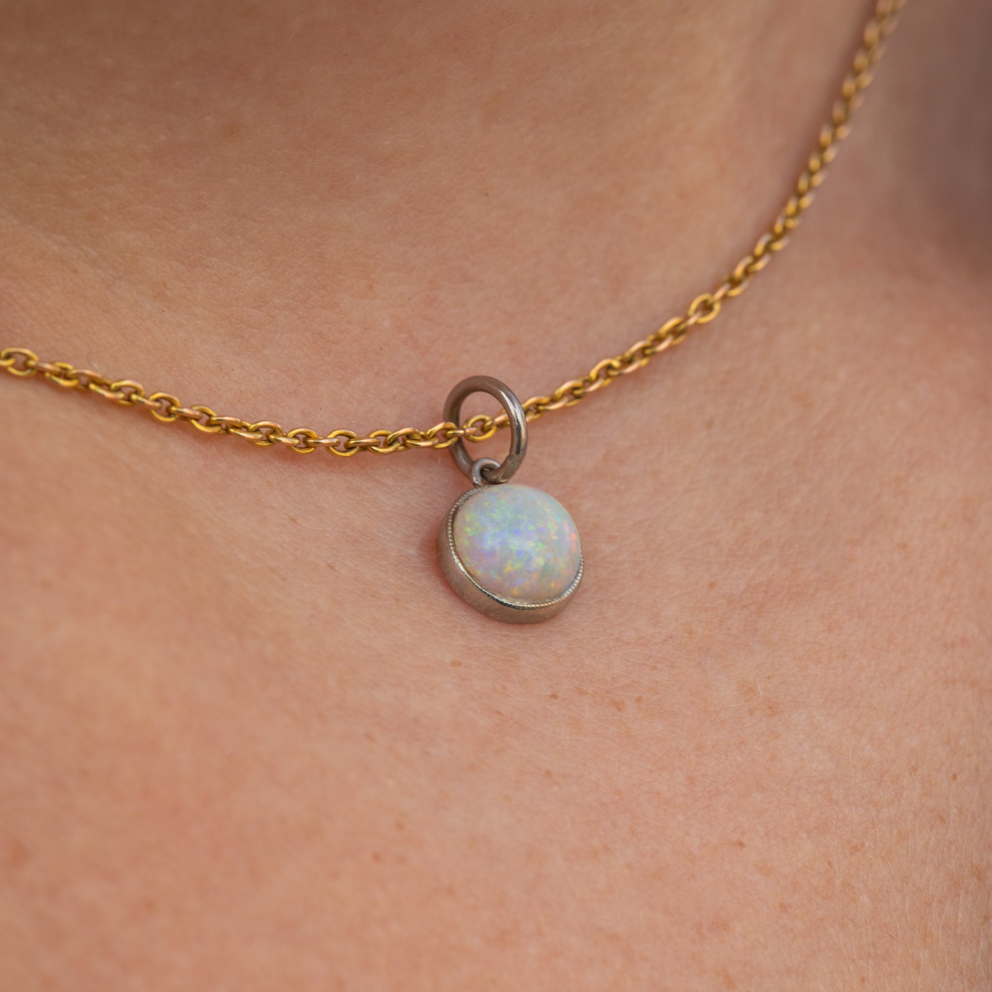 The lustrous 14ct white Gold bezel setting adds a luxurious finish to this Art Deco pendant and holds the Opal securely in place. The perfect pick to add a touch of antique charm to any outfit!