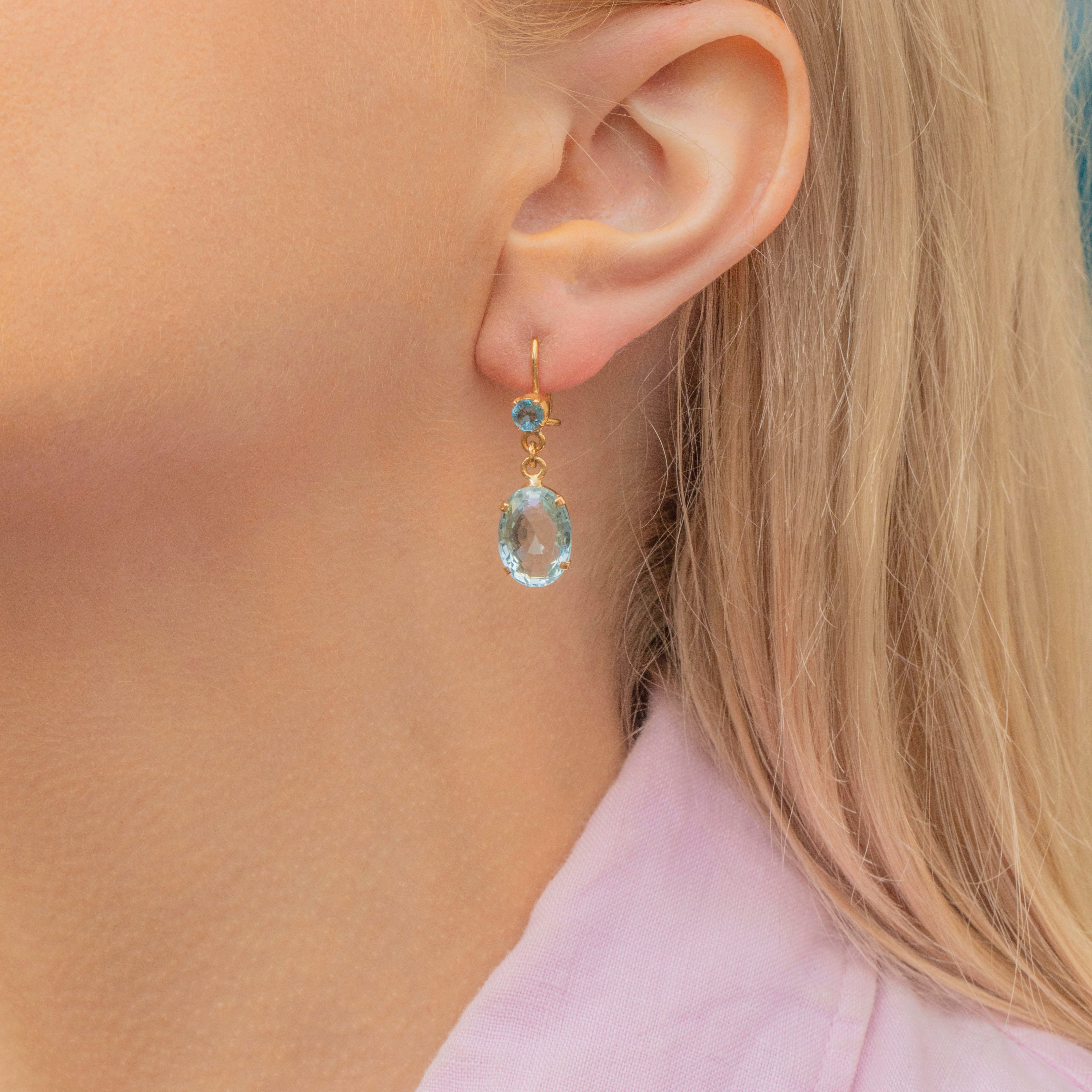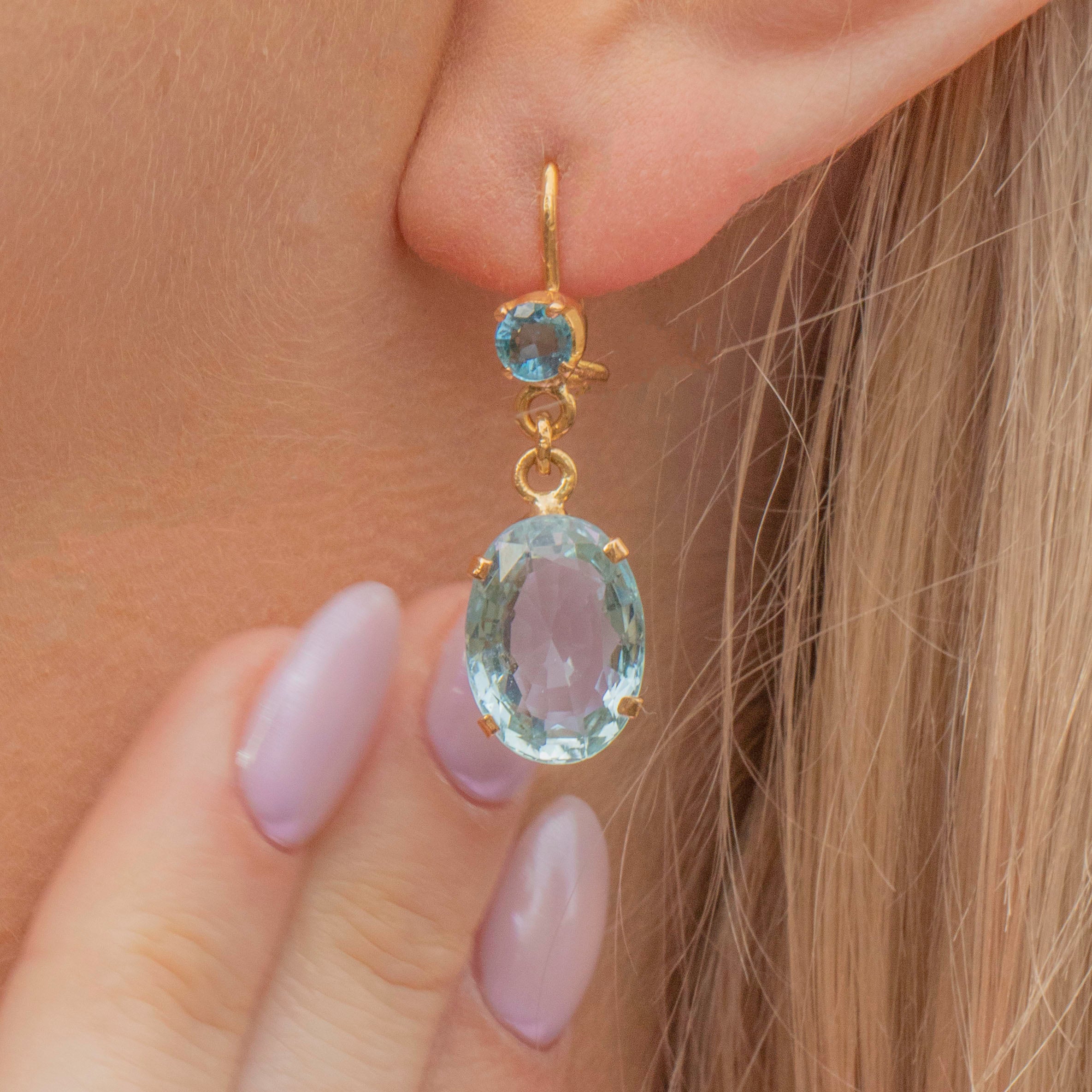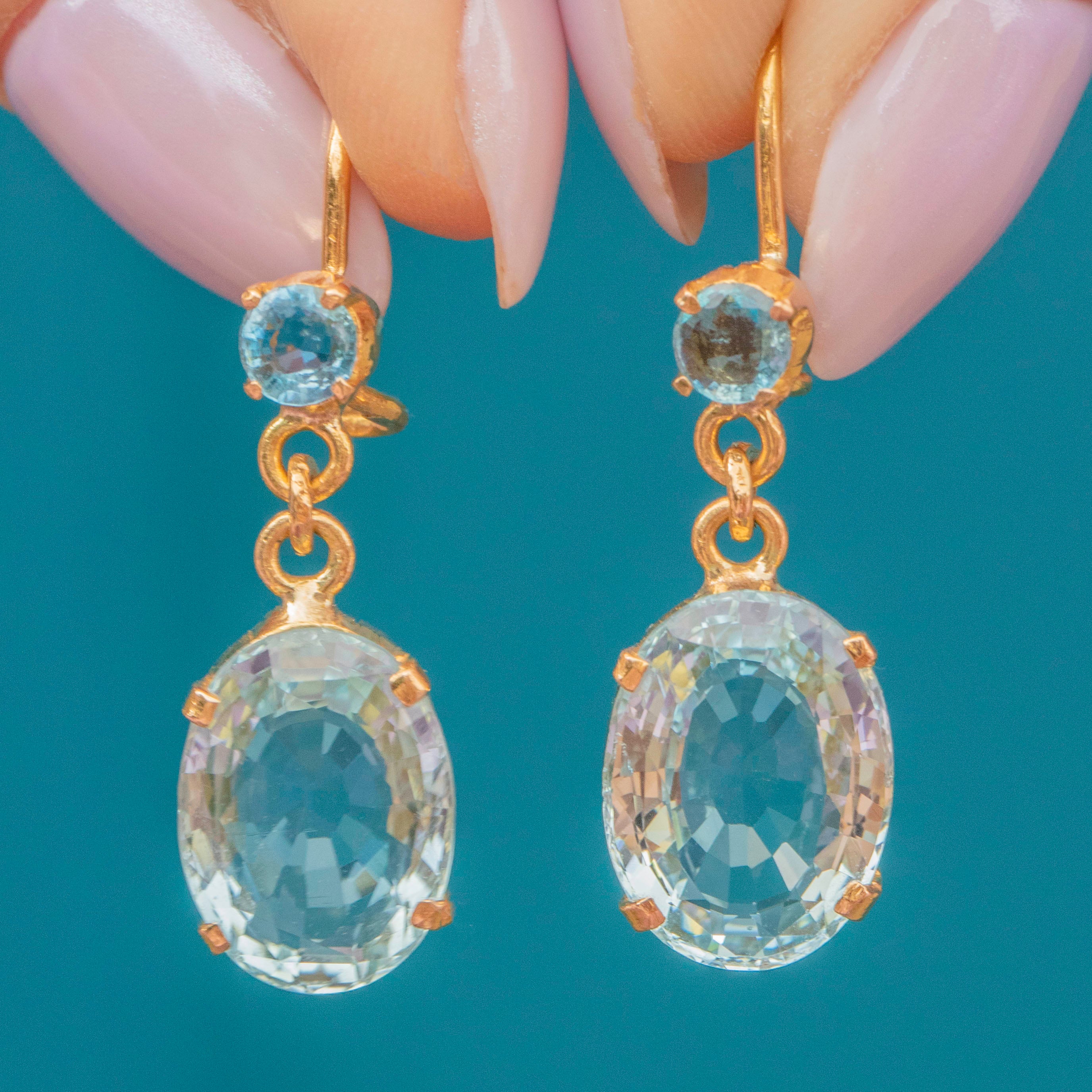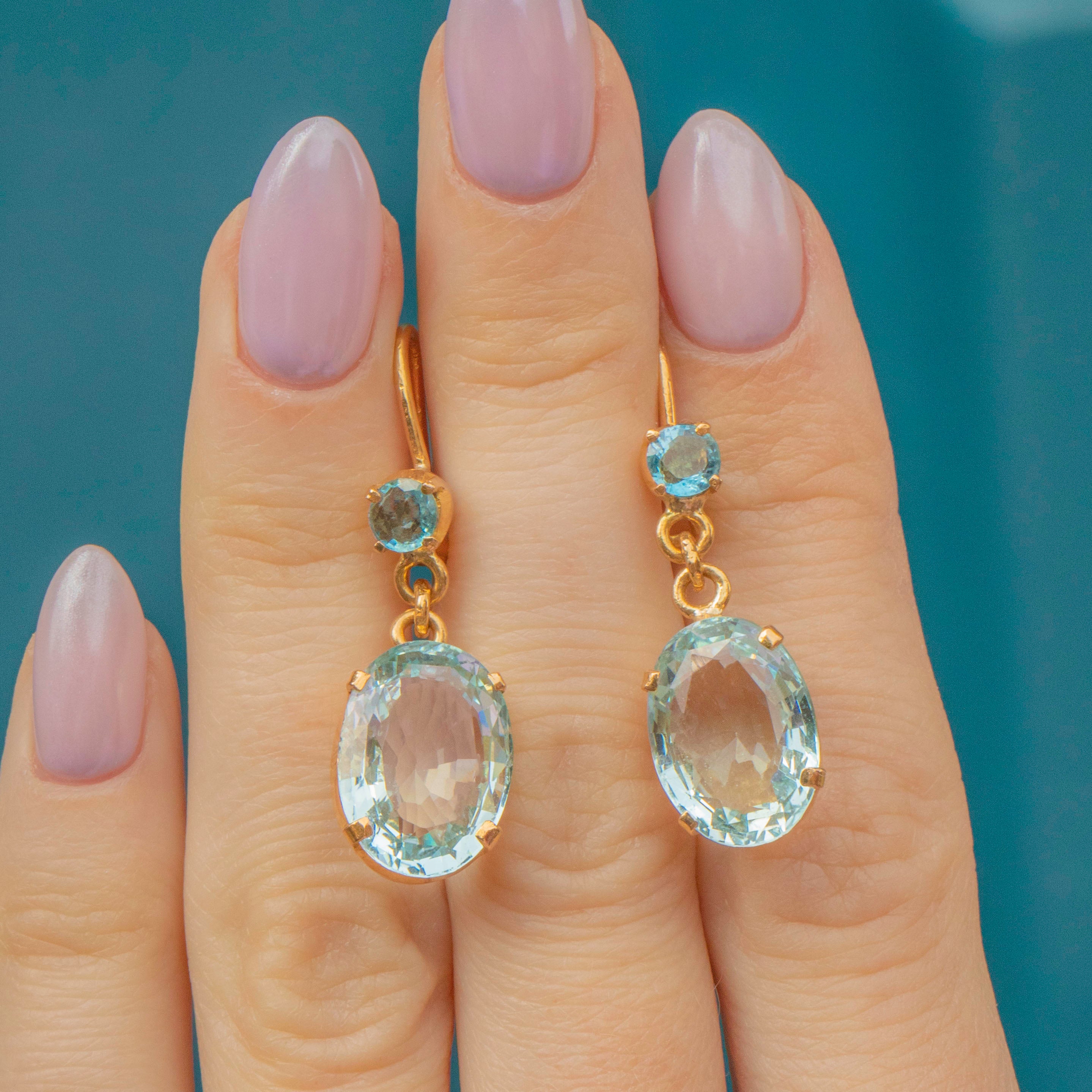 VERY GOOD. These Art Deco 18ct Gold Aquamarine drop earrings are in very good overall condition. The earrings are each set with two Aquamarines, the bottom ones a plump oval, together totalling 5.80ct. The earring hooks go into the lobe with ease and can be worn comfortably all day long, hooking into a c-clasp back for added security.