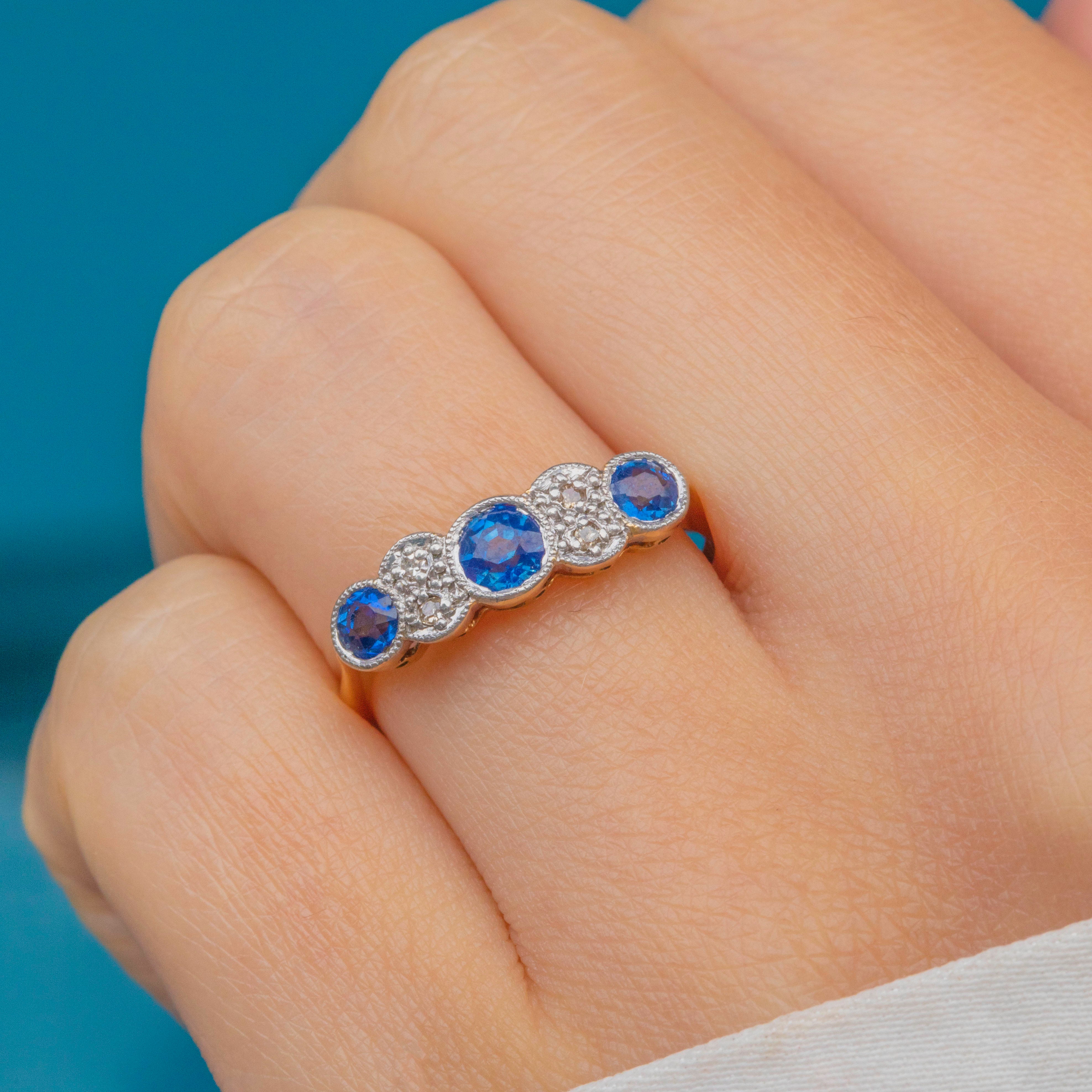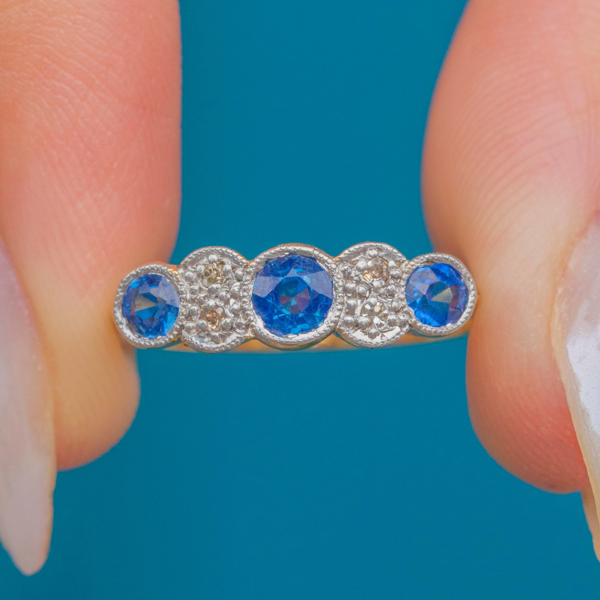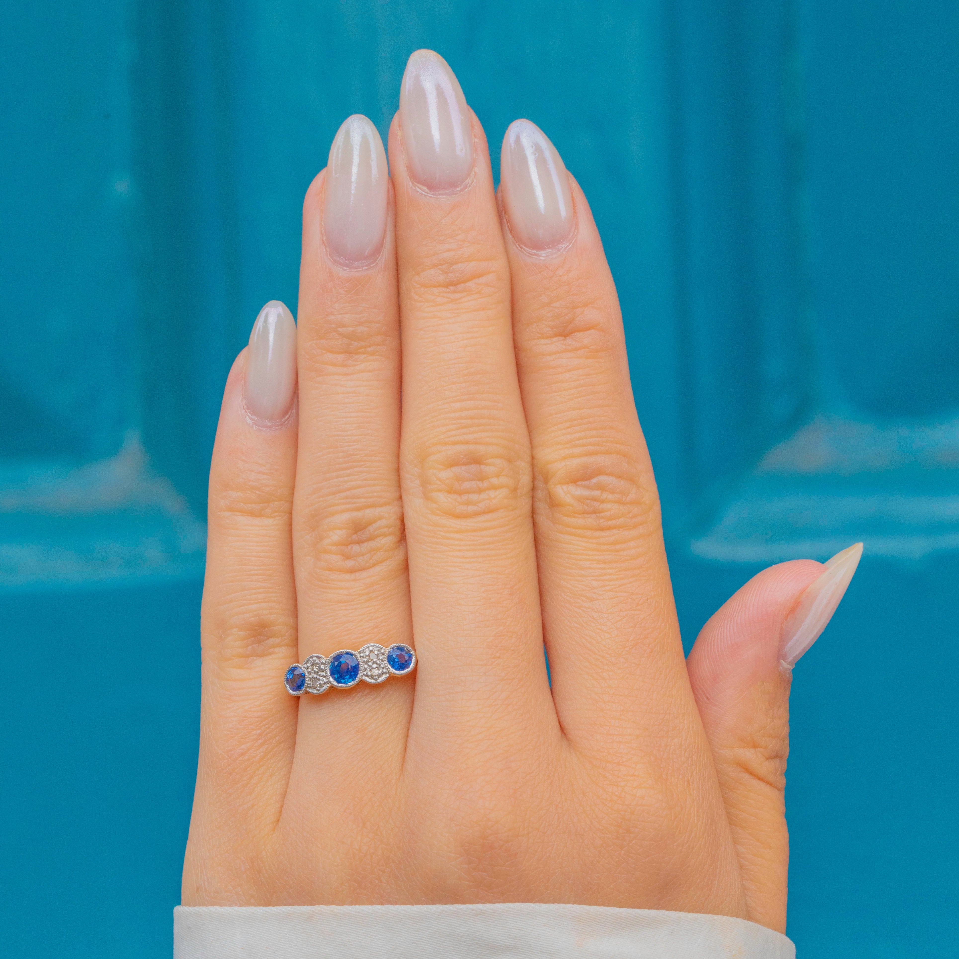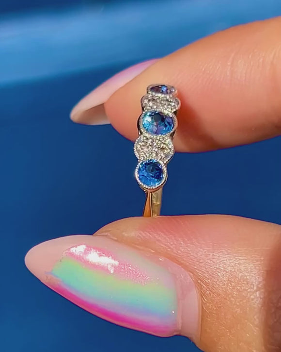 This elegant Art Deco ring showcases three round-cut Sapphires, with a rich royal blue hue, set alongside four bright, twinkling Diamonds.