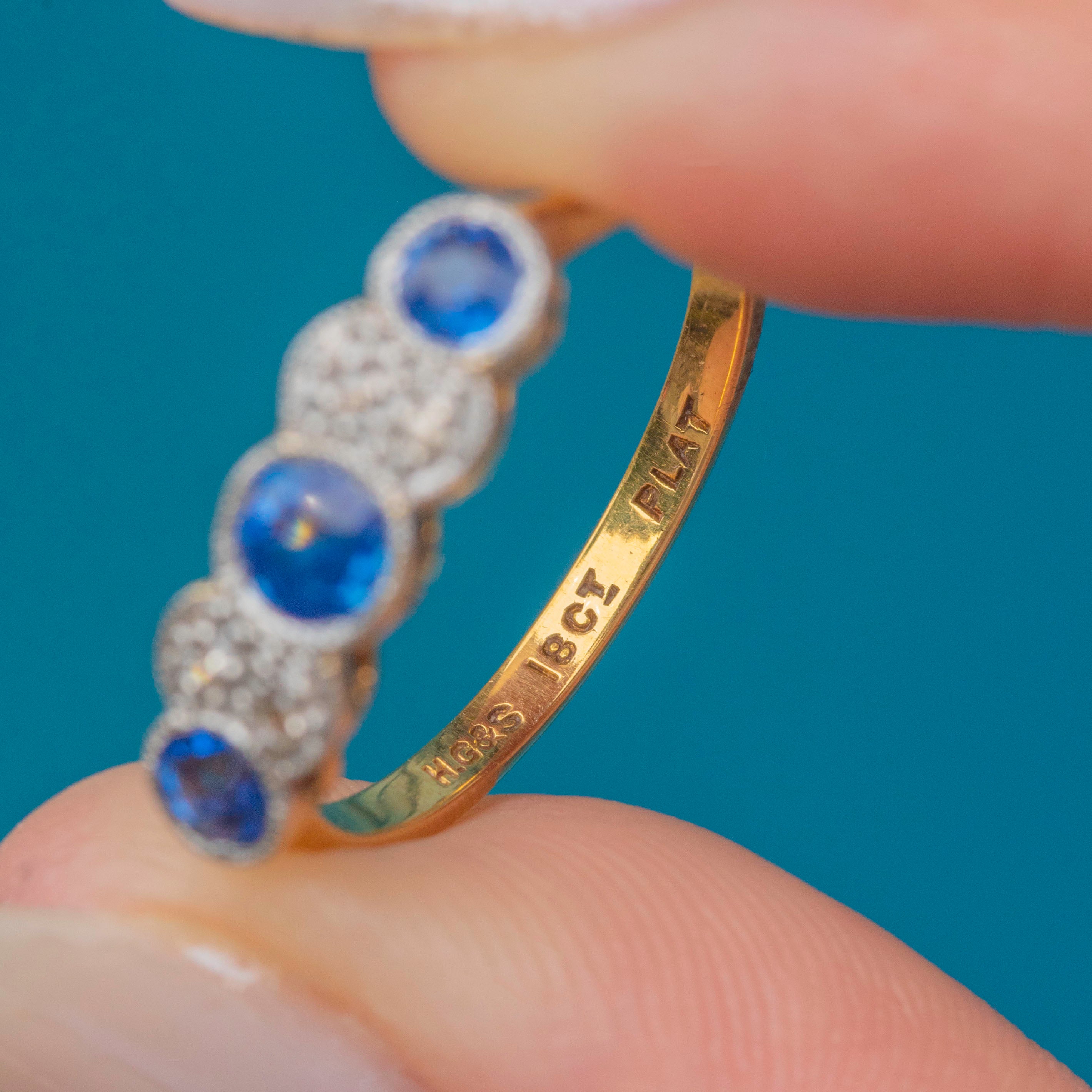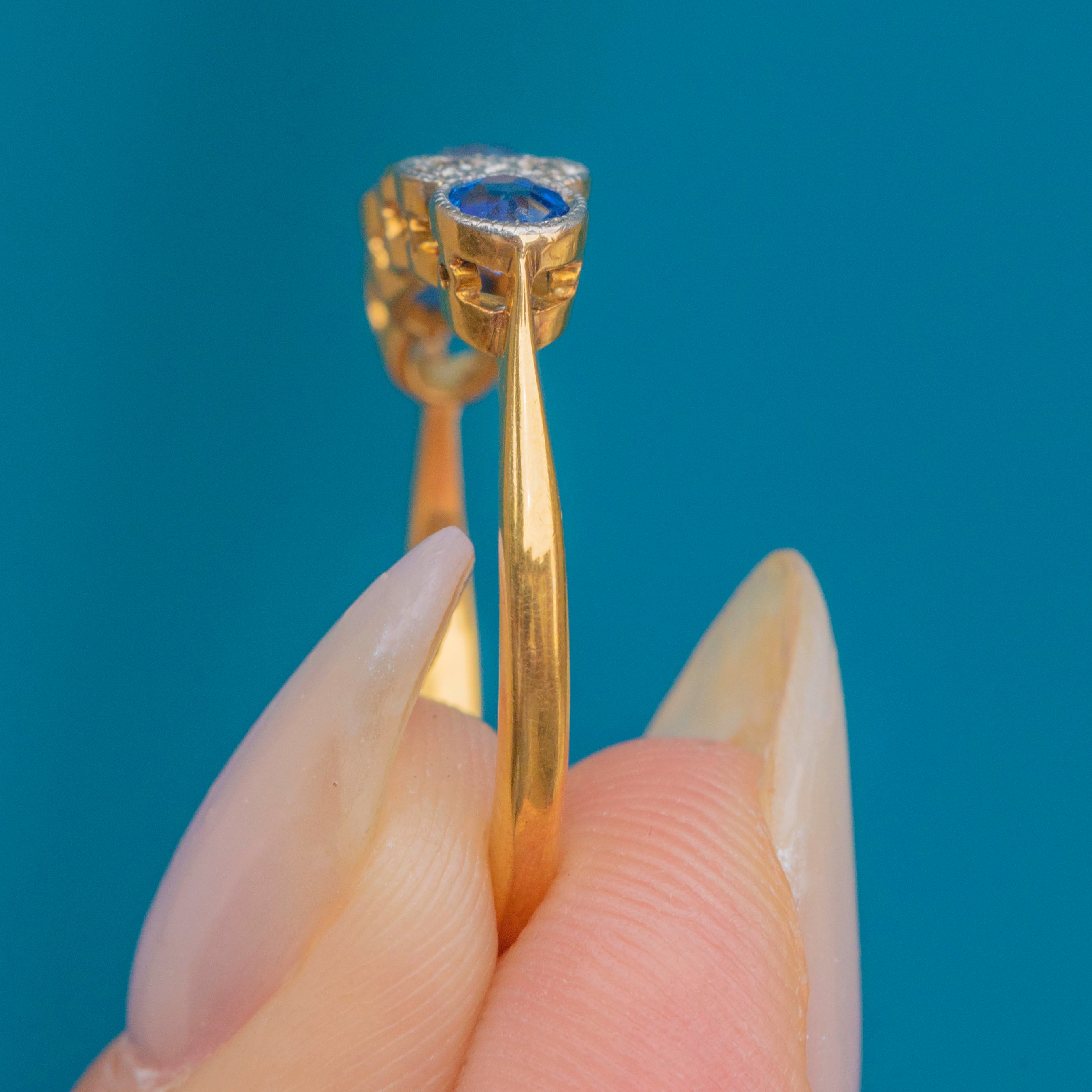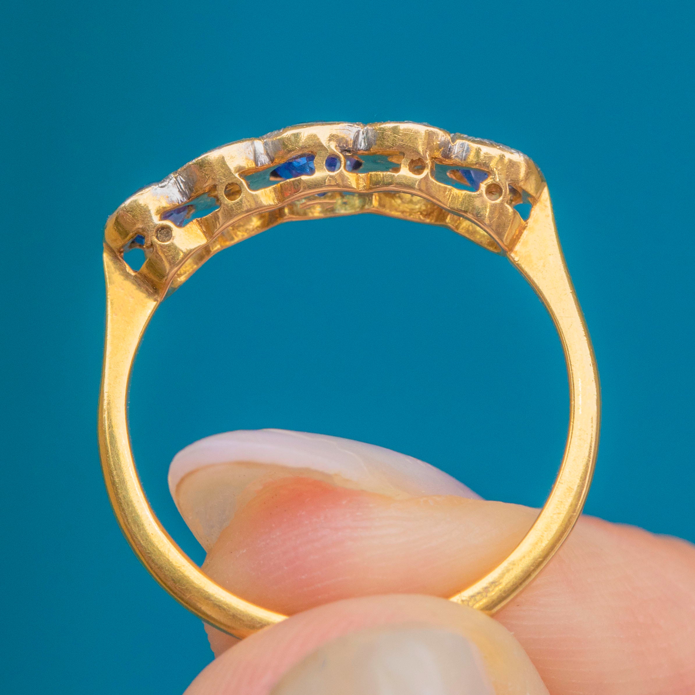 EXCELLENT: This Art Deco Sapphire and Diamond seven stone ring is in wonderful condition. The 18ct Gold has a soft tone and holds the gemstones in the raised settings perfectly. The Diamonds are bright and twinkling away without any chips or bumps. The Sapphires are beautifully set and are perfect with the most beautiful deep royal blue tickling all of our Sapphire fancies!