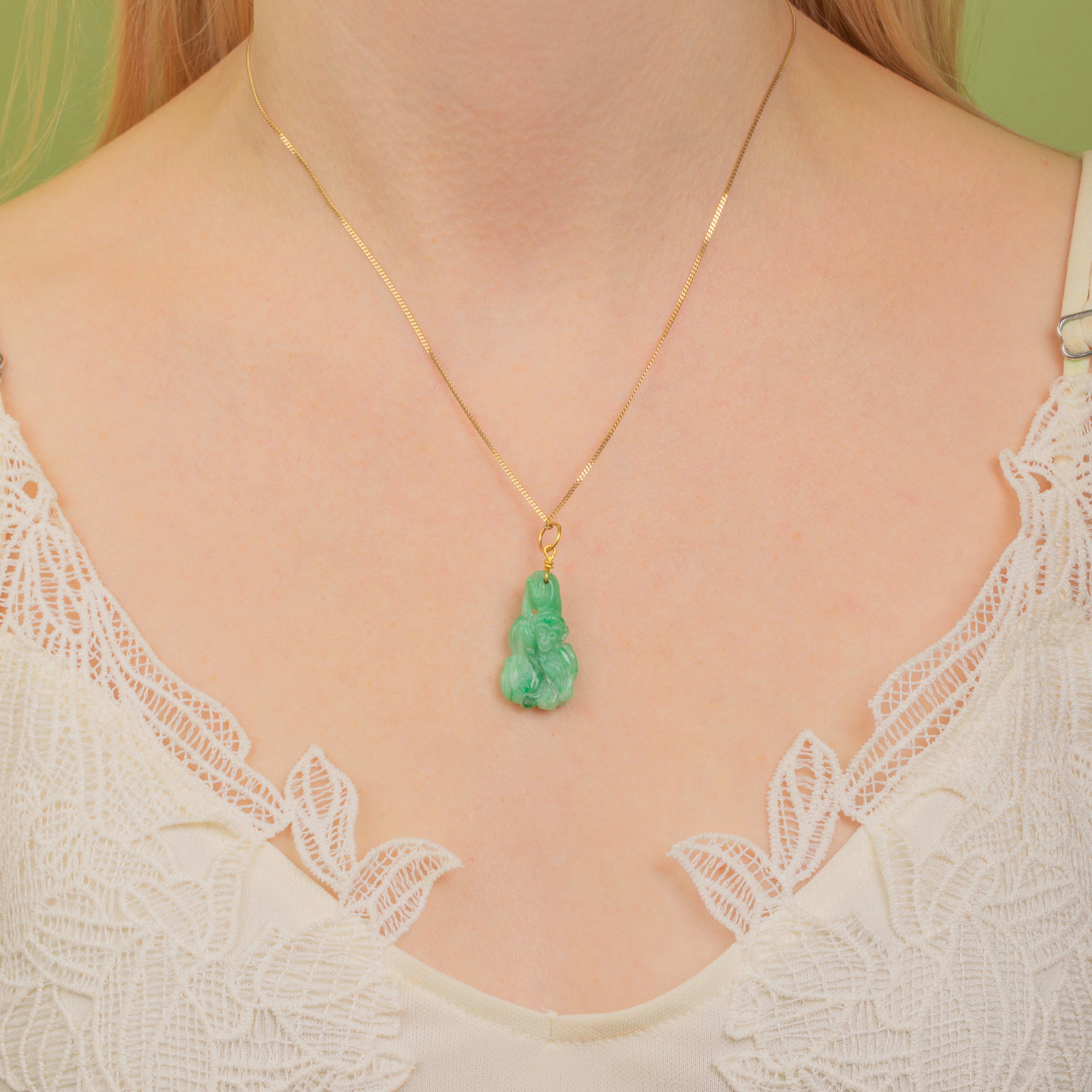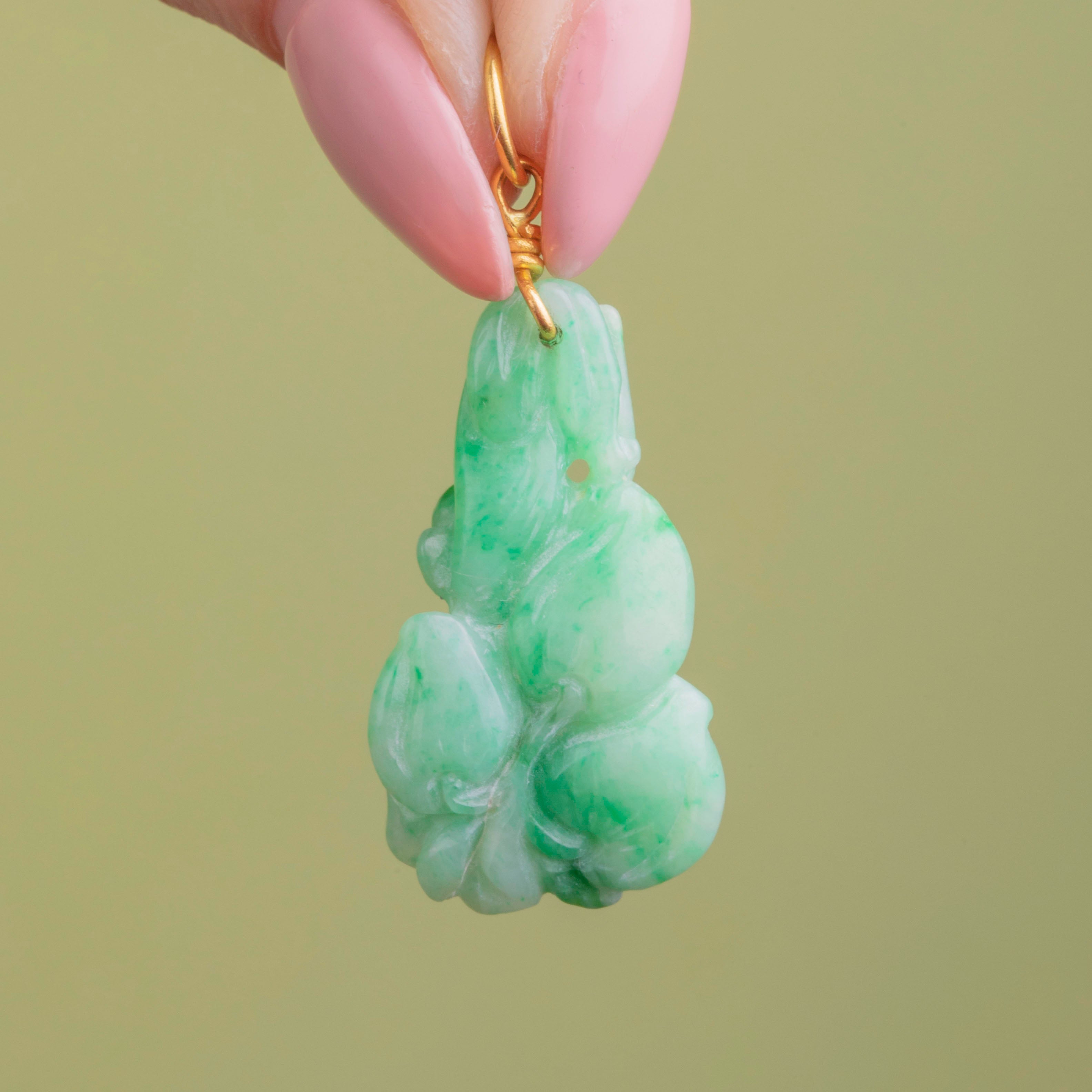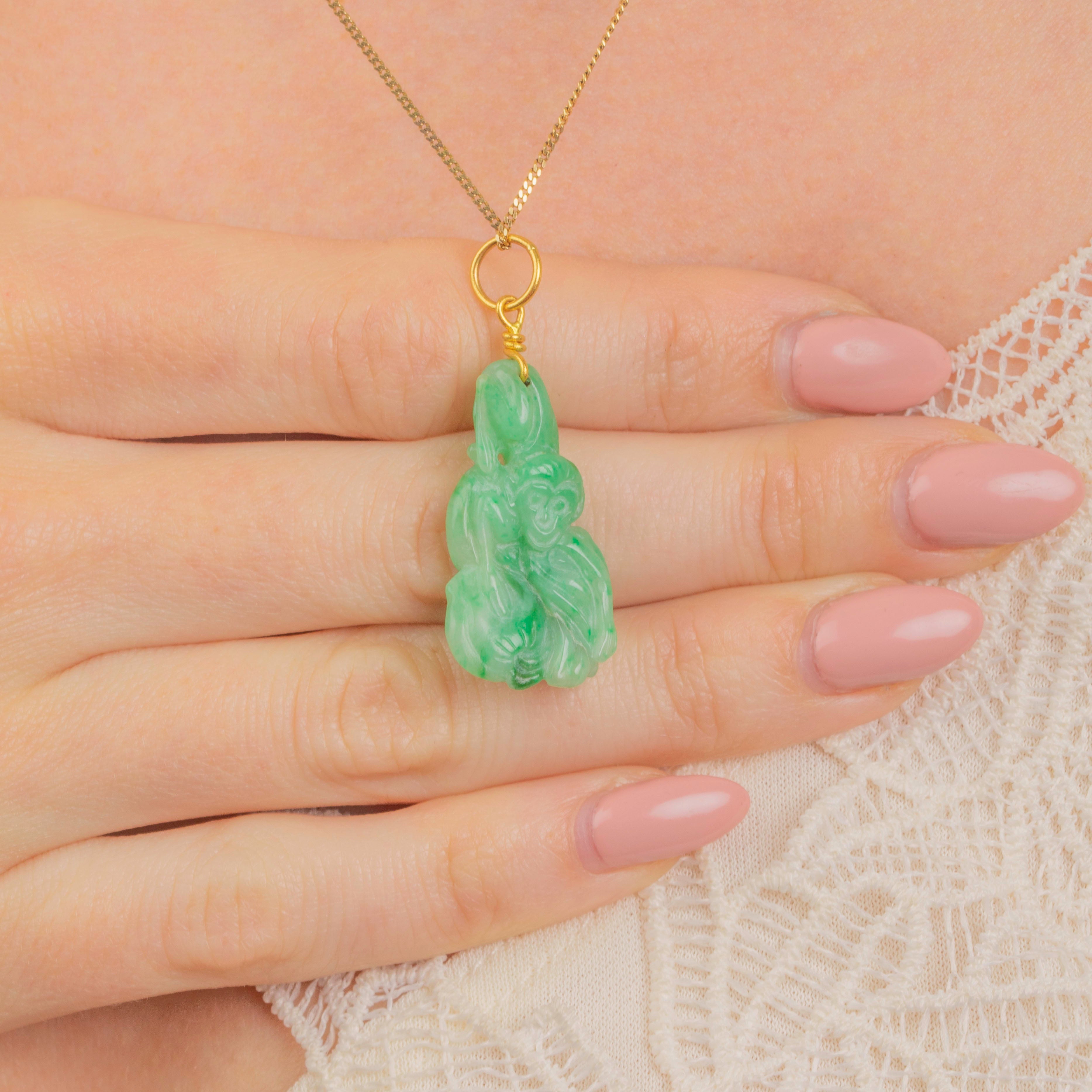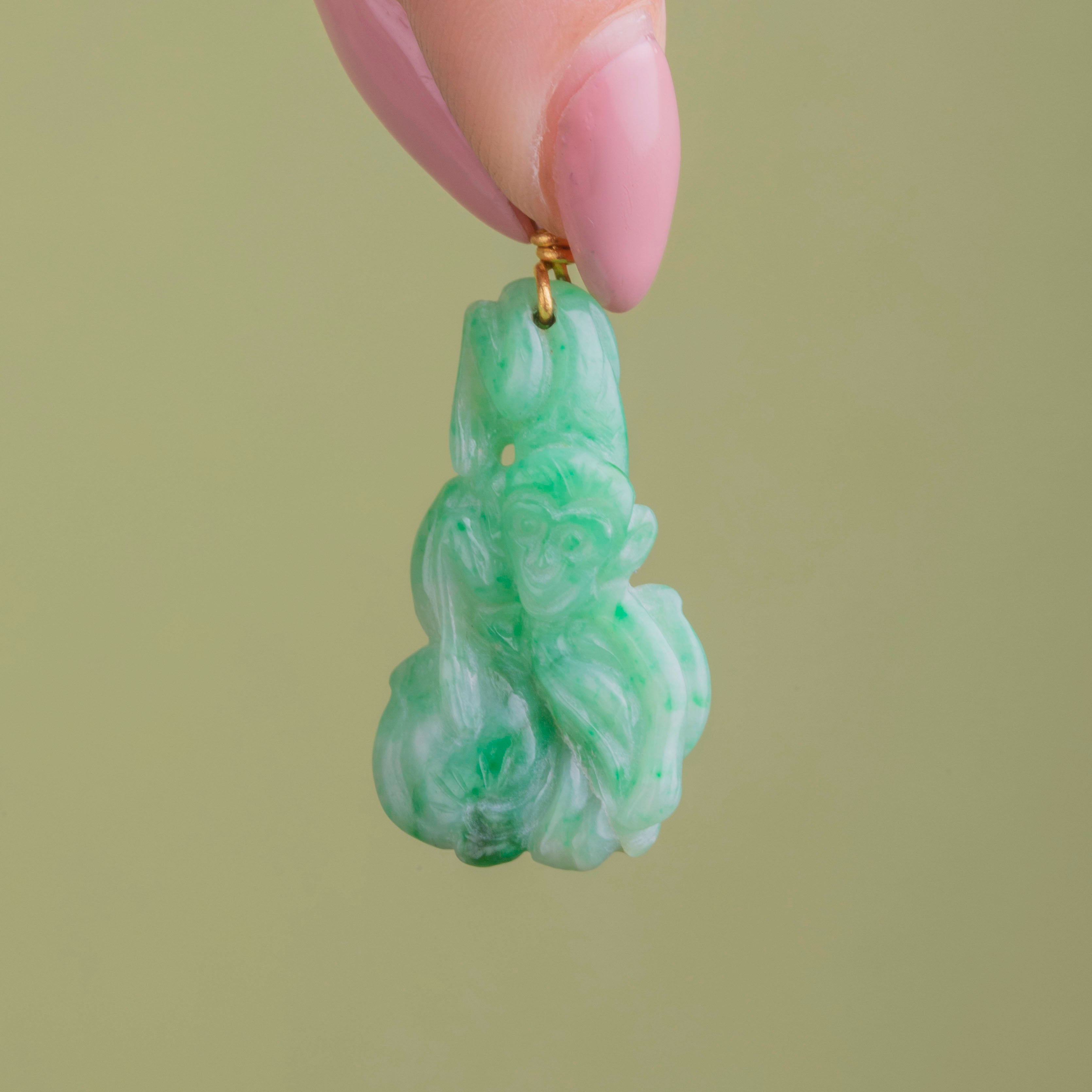 This exquisite Art Deco 18ct Gold Carved Jade Pendant showcases serene green tones and intricate craftsmanship. The pendant depicts a mischievous monkey poised with a cheeky grin, capturing the monkey's playful, expressive form.