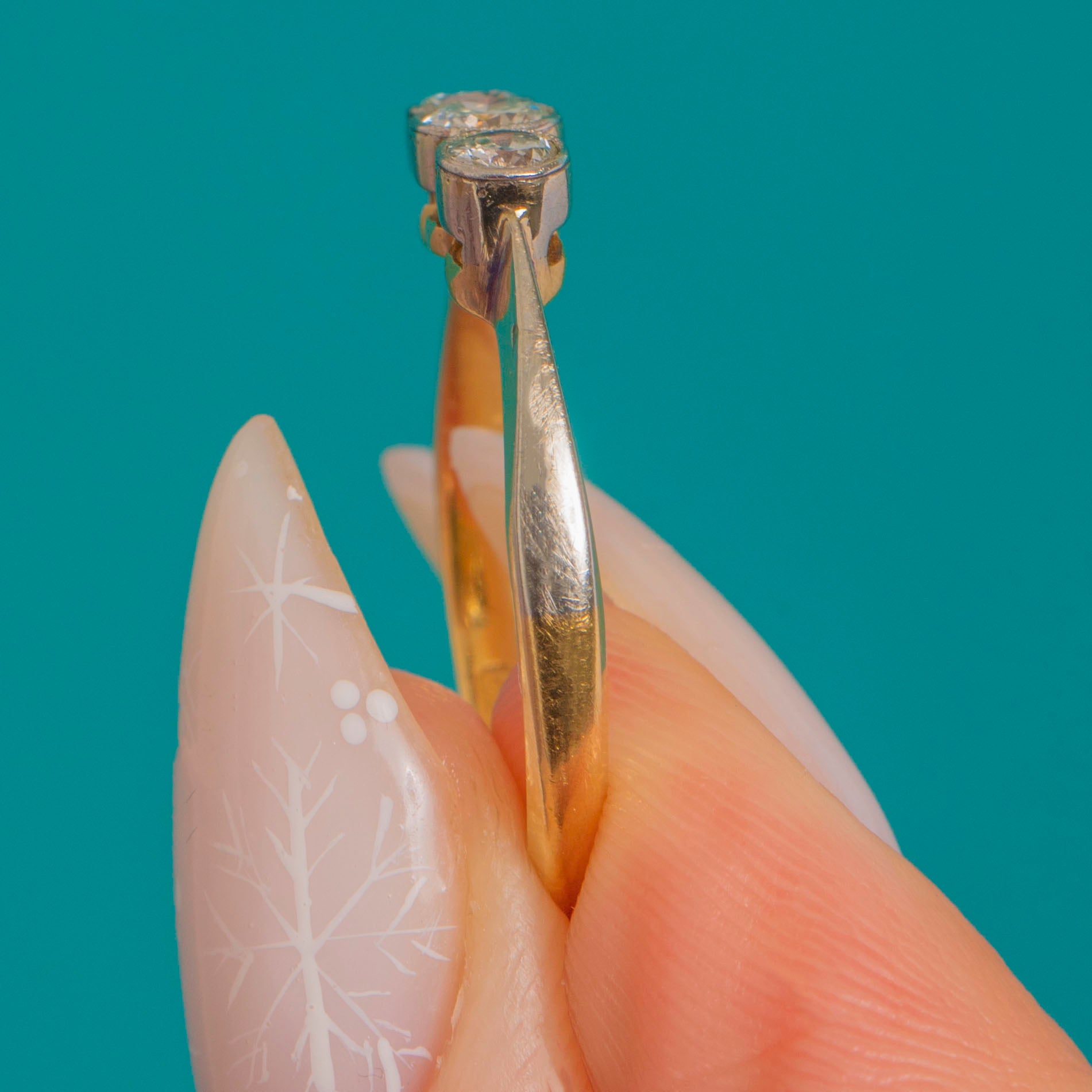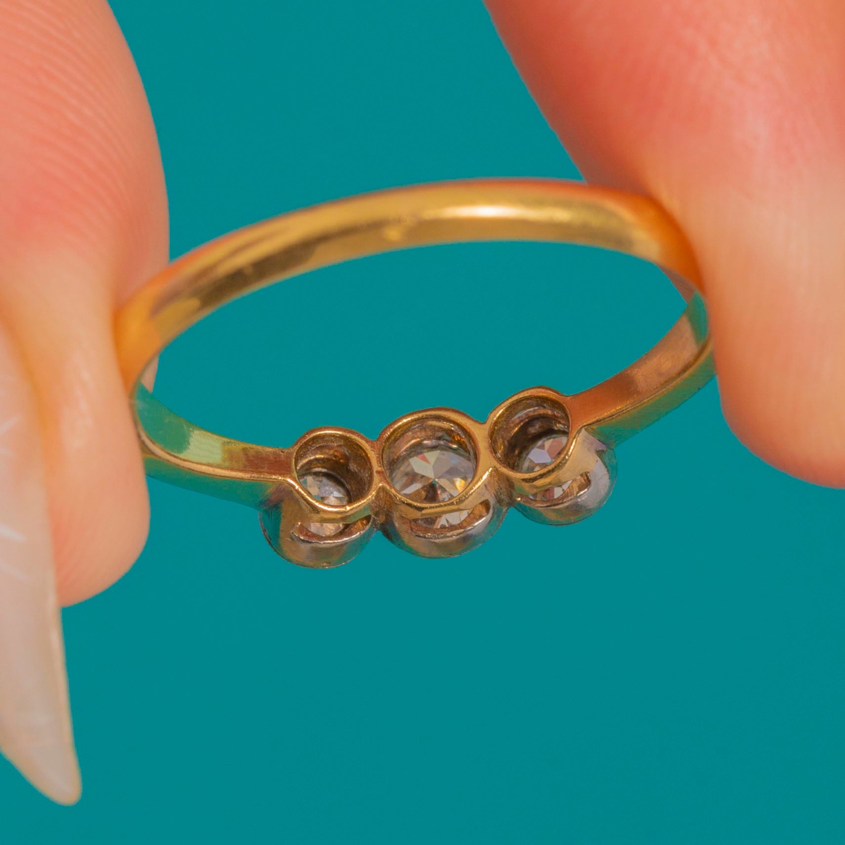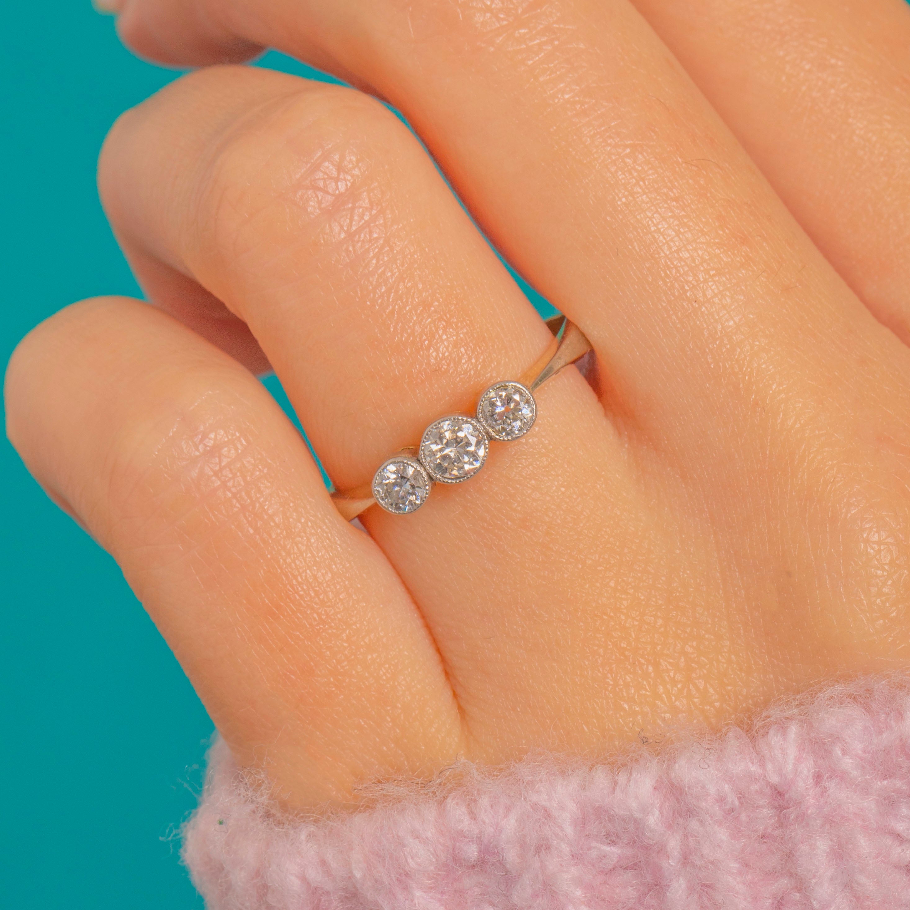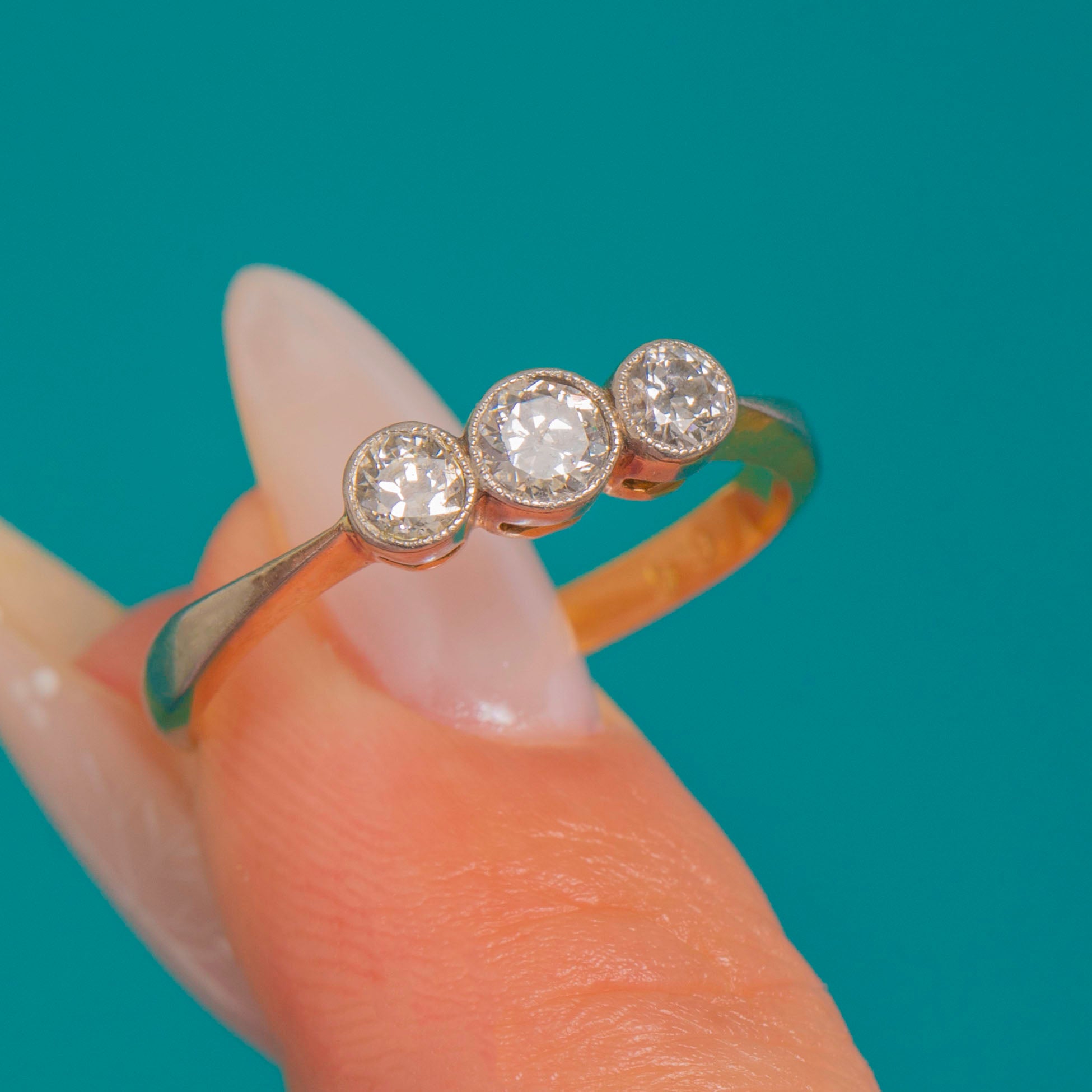 This beautifully balanced Art Deco trilogy ring pairs warm 18ct Gold with crisp Platinum millegraine settings, creating that instantly recognisable early 20th century contrast. Across the top sit two Old European cut Diamonds flanking a rare 1930s Transitional cut centre stone, all chosen for their bright, lively sparkle and old-world charm.