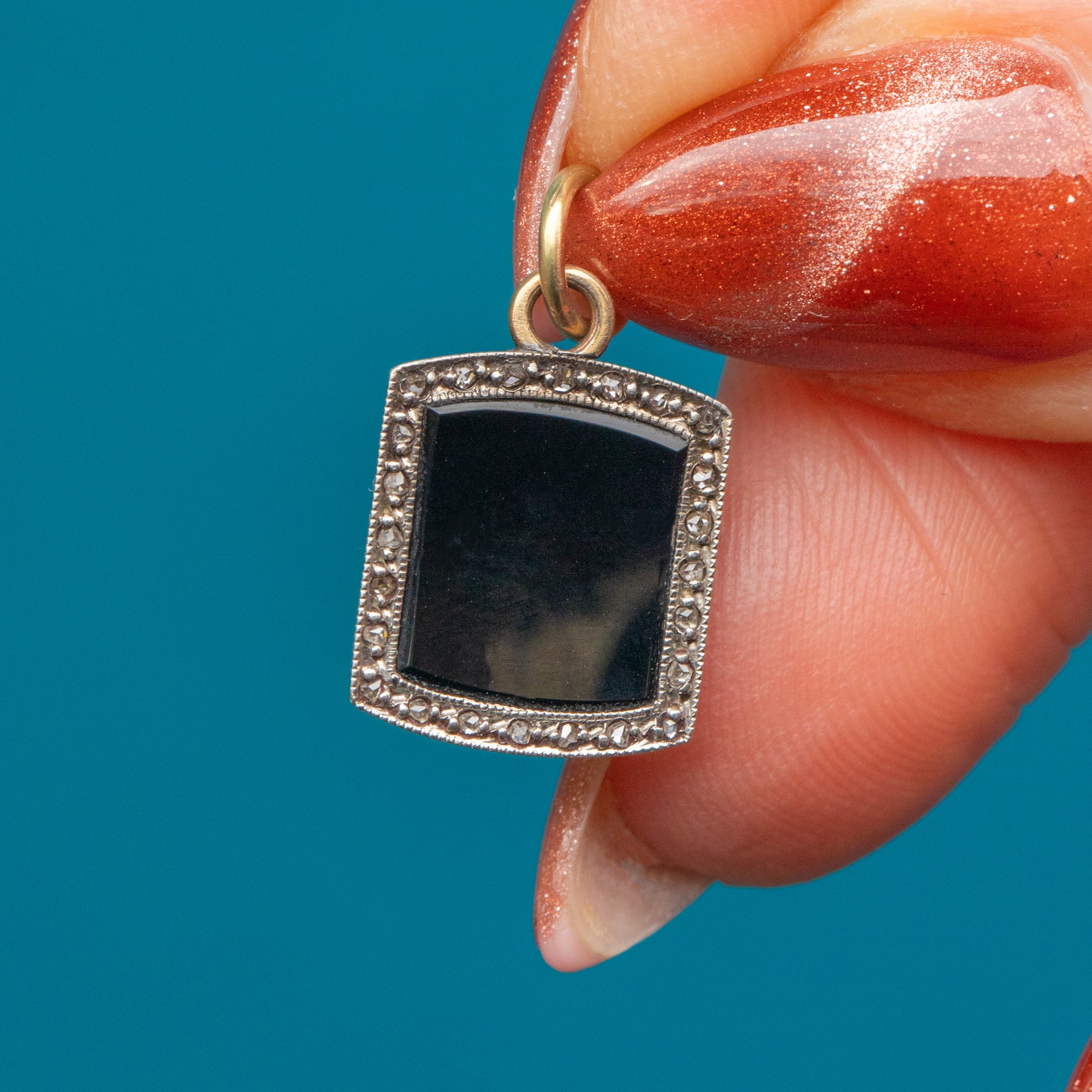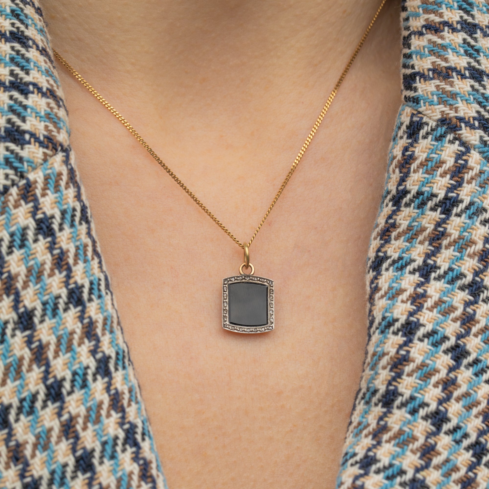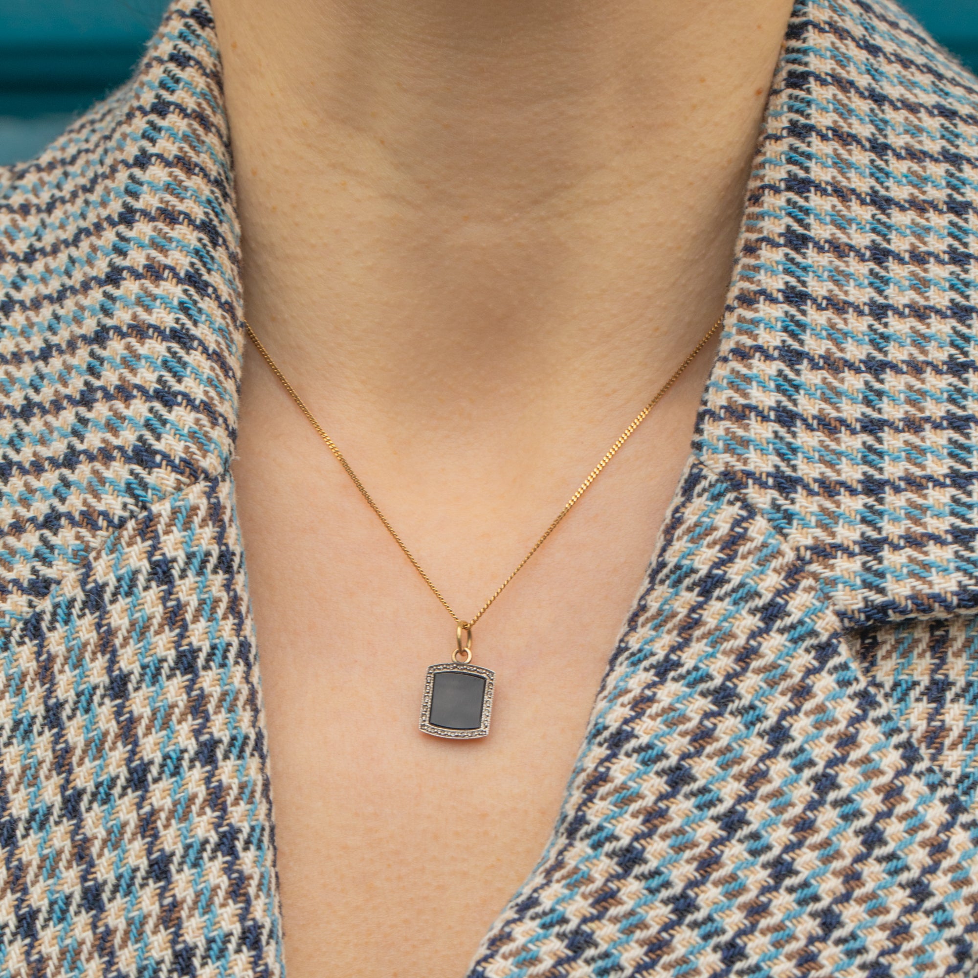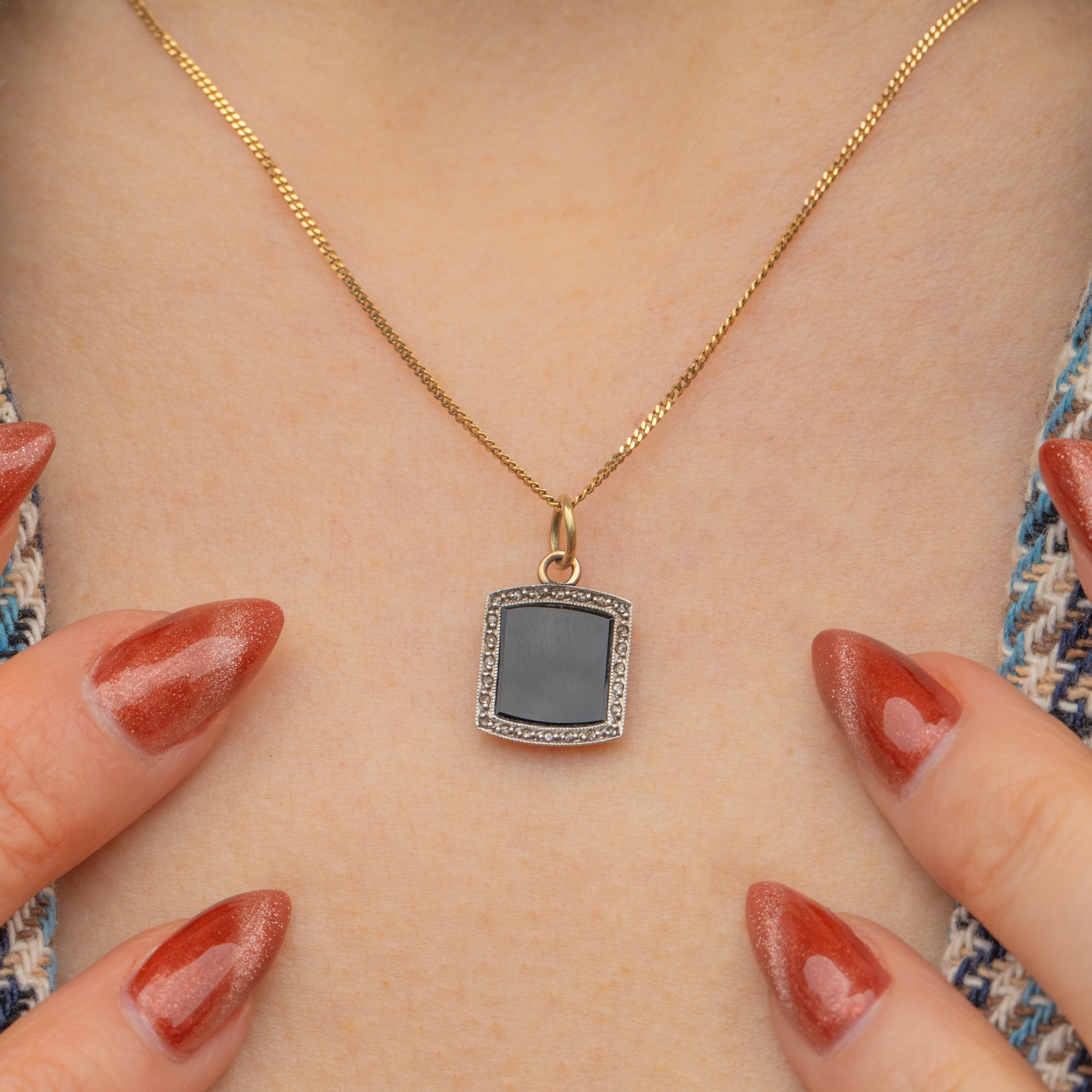 Add a touch of Deco elegance to your collection with this stunning Art Deco 18ct Gold Onyx and Diamond pendant! Featuring a beautifully cut piece of deep black Onyx framed by delicately twinkling Diamonds, this rare antique pendant exudes luxury and sophistication.
