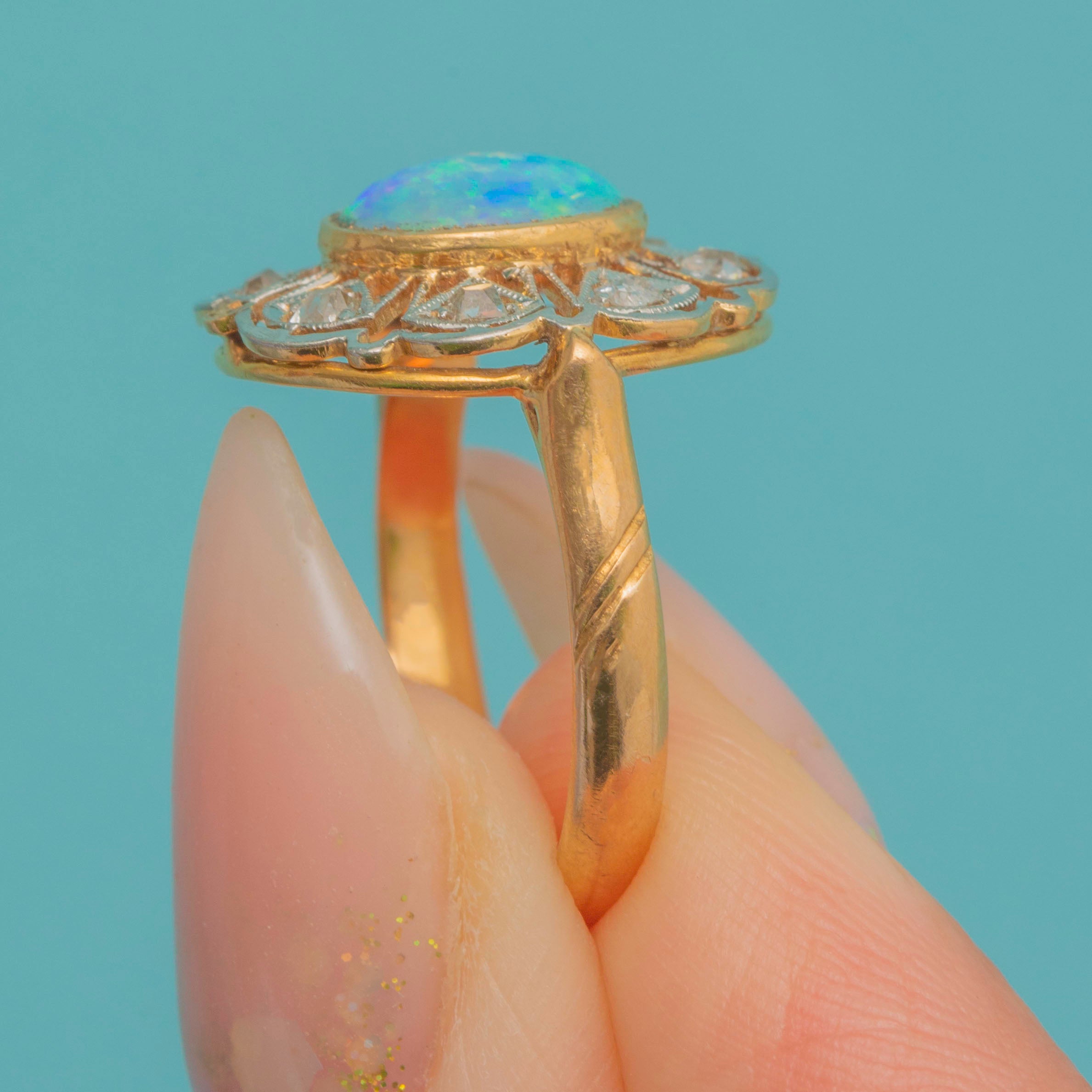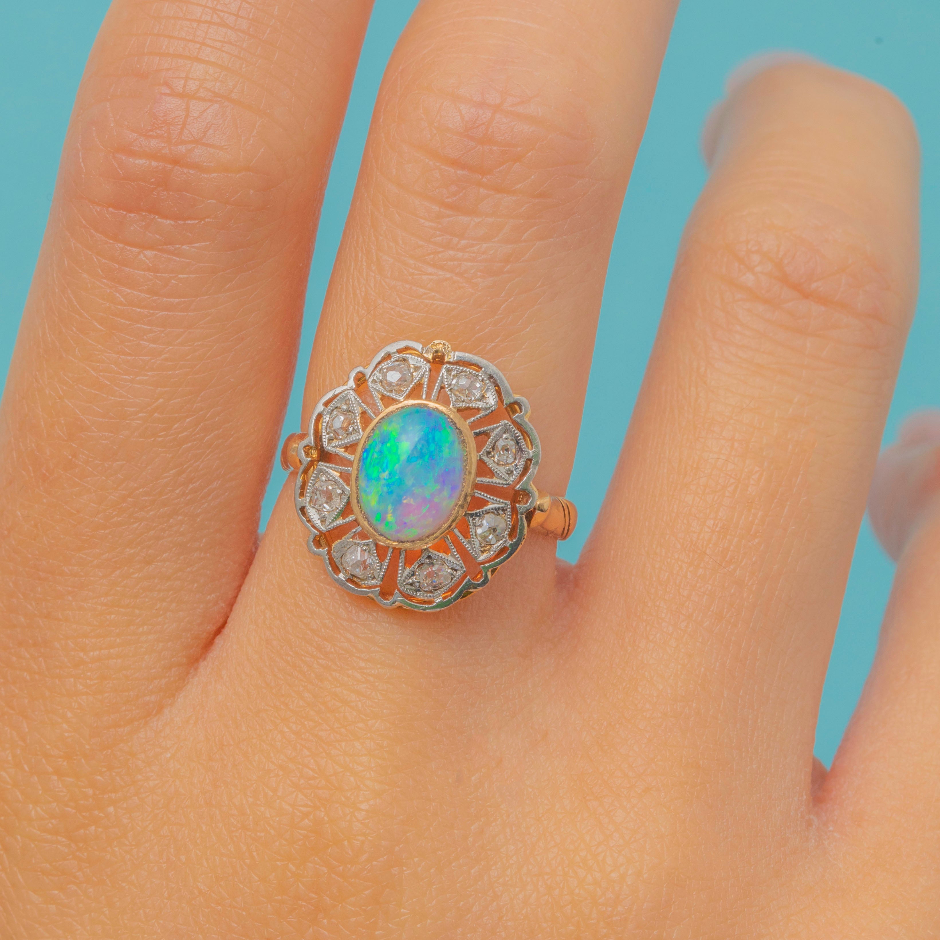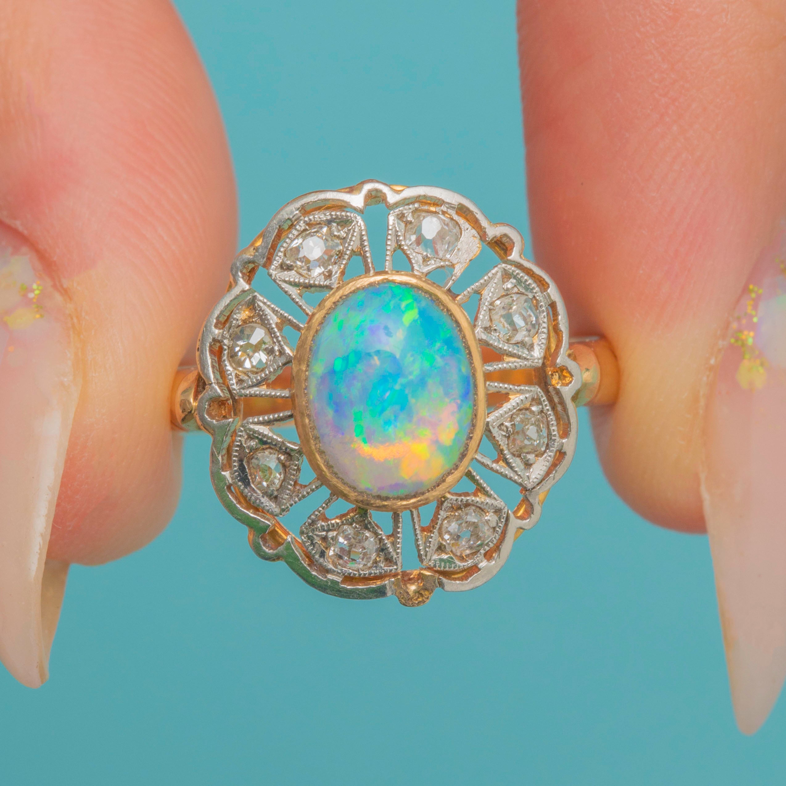 EXCELLENT: The Opal is bright, smooth, and securely set, with lively play-of-colour. The Diamonds are sparkling and free from chips, all firmly set in place. The Gold filigree gallery is crisp with only slight wear to the settings commensurate with age, leaving the ring strong and well-preserved.