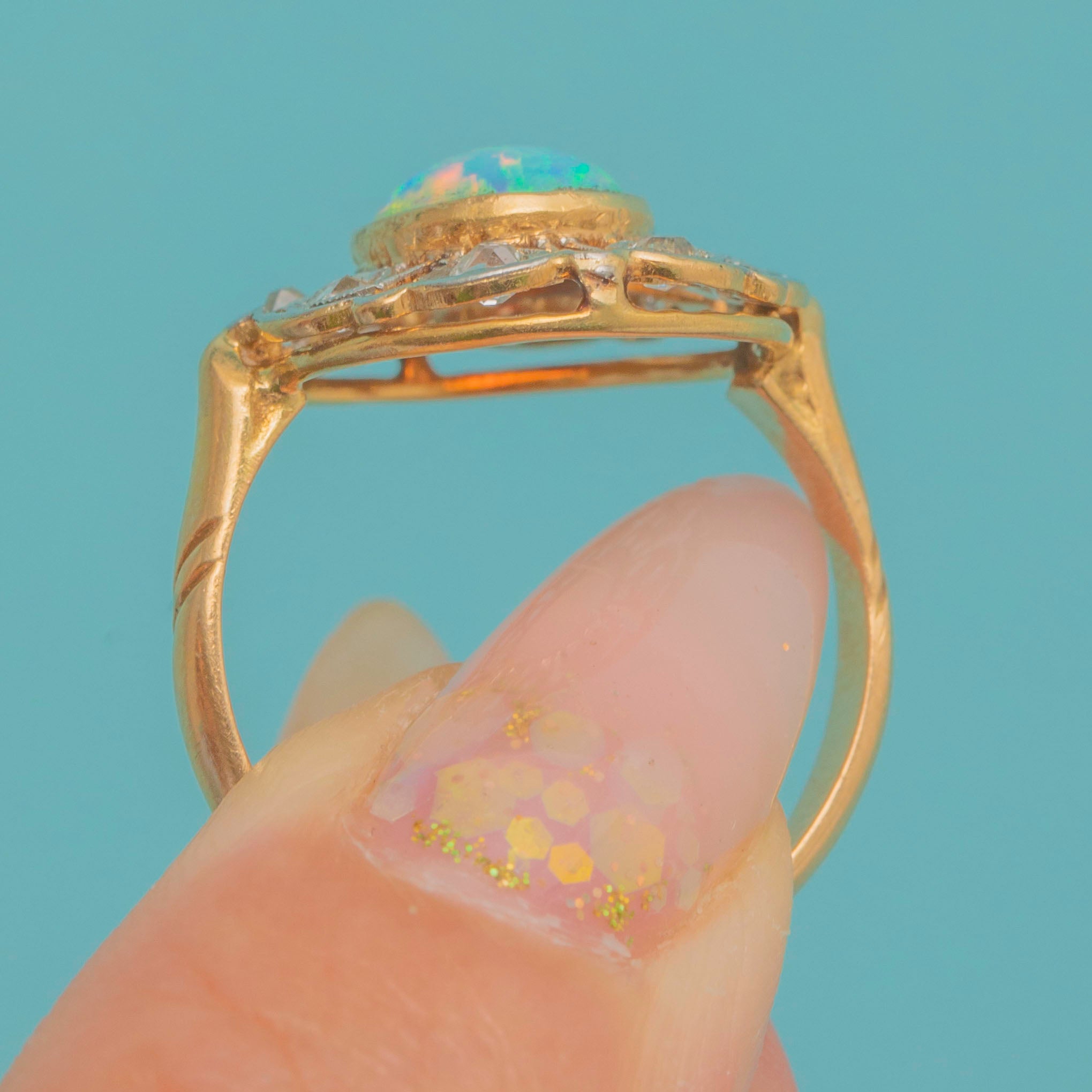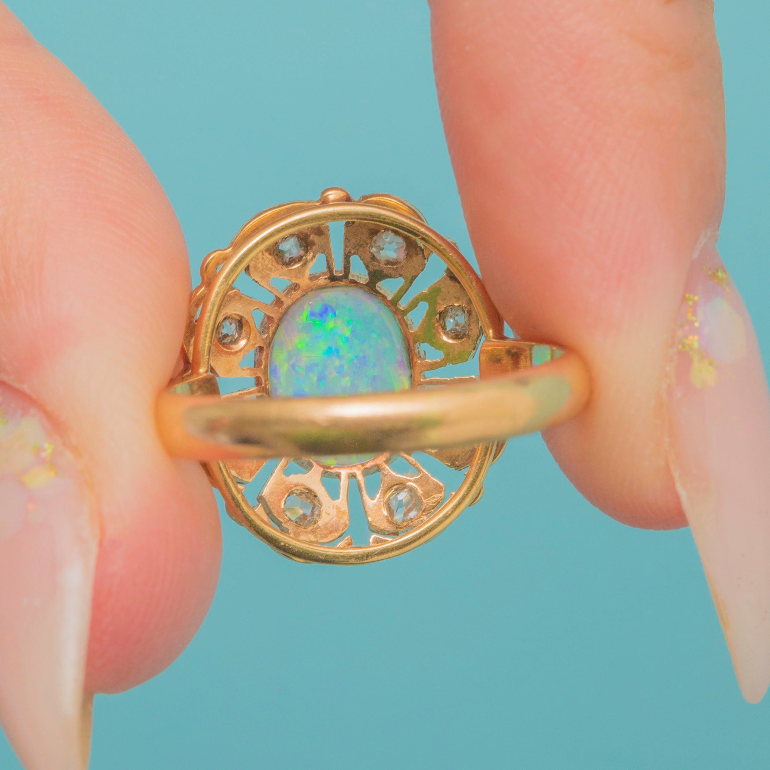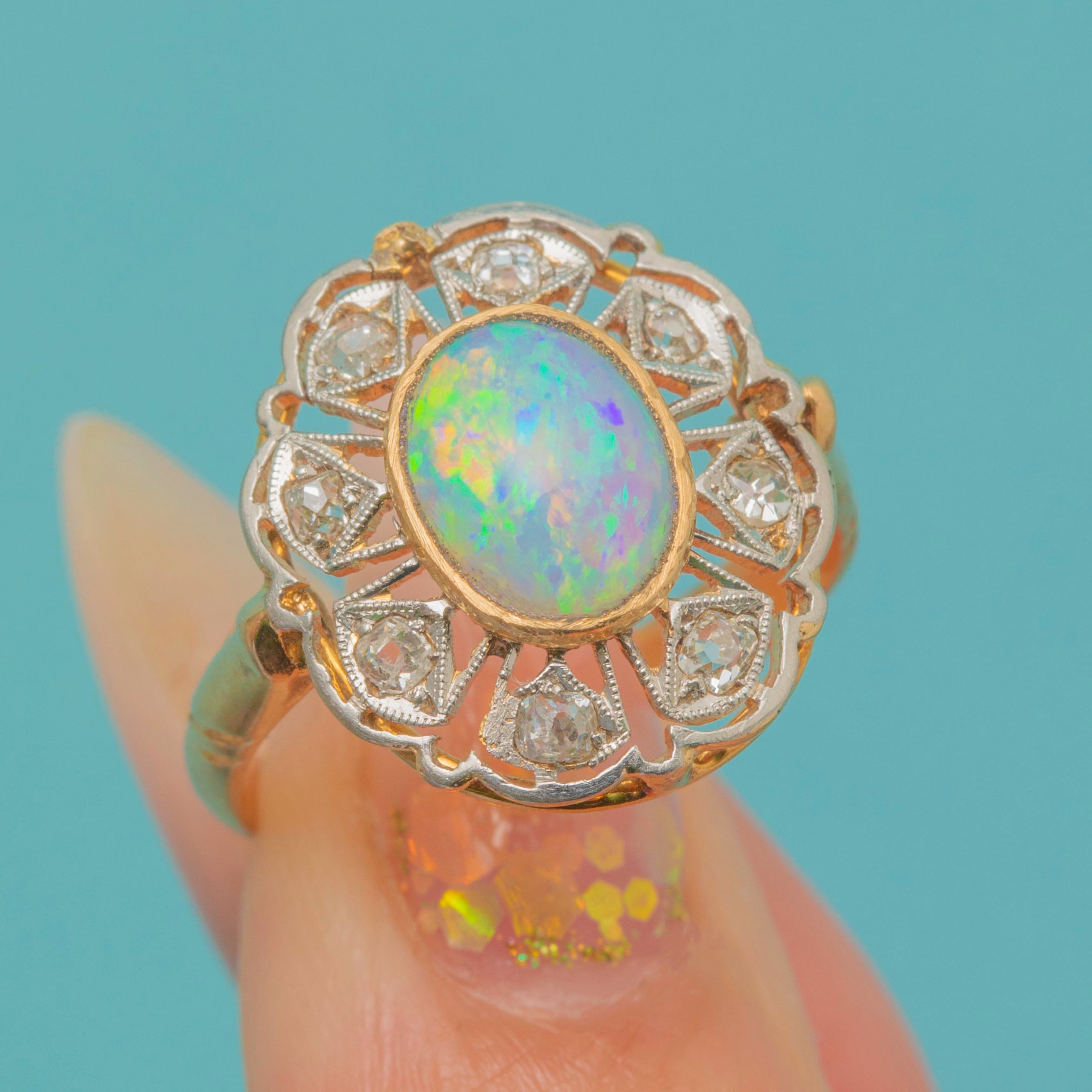 EXCELLENT: The Opal is bright, smooth, and securely set, with lively play-of-colour. The Diamonds are sparkling and free from chips, all firmly set in place. The Gold filigree gallery is crisp with only slight wear to the settings commensurate with age, leaving the ring strong and well-preserved.