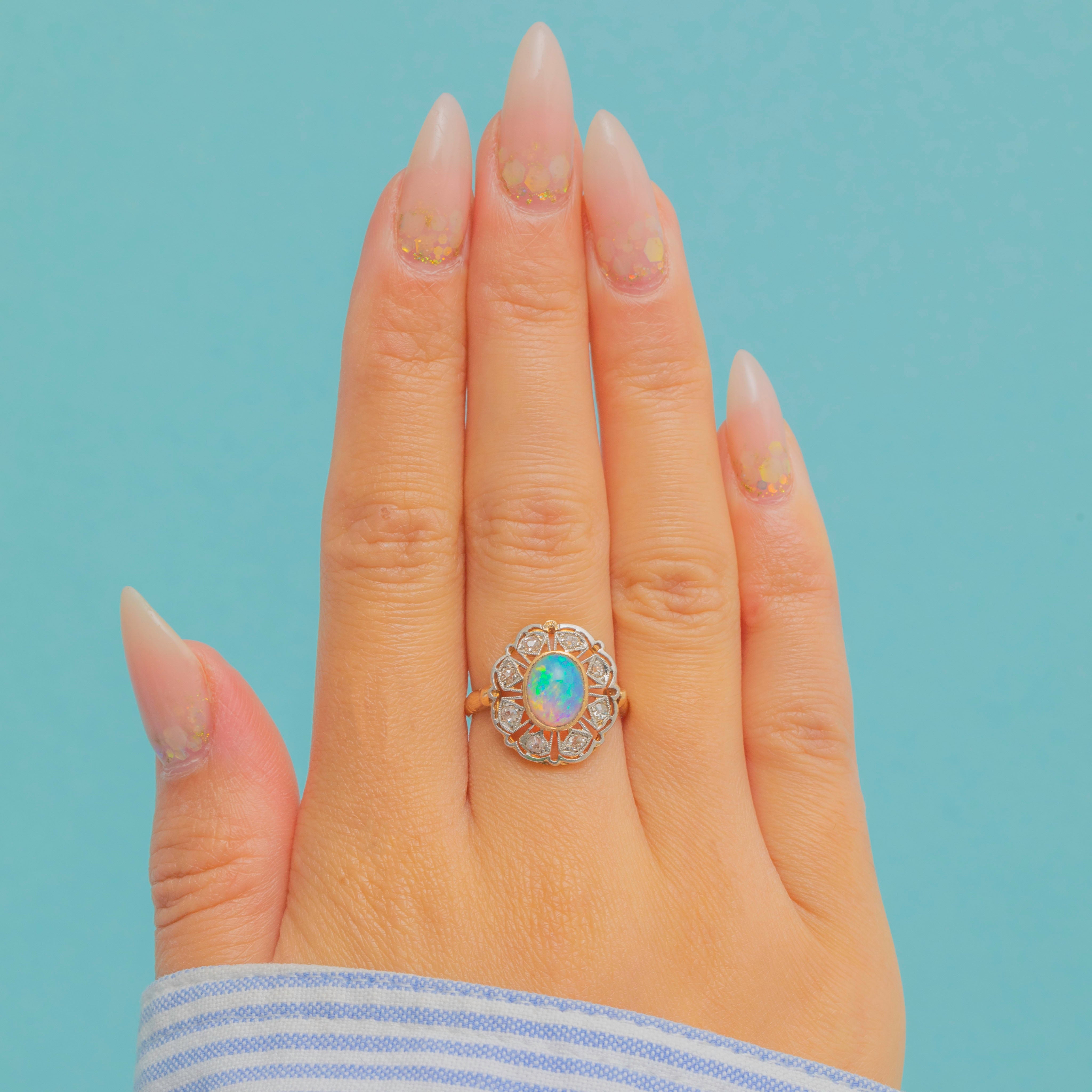 This exquisite Art Deco cluster ring is crafted in 18ct Gold and set with a luminous Opal surrounded by a halo of glittering old mine cut Diamonds. The Opal cabochon glows with shifting flashes of colour, beautifully complemented by the sparkle of eight lively Diamonds.