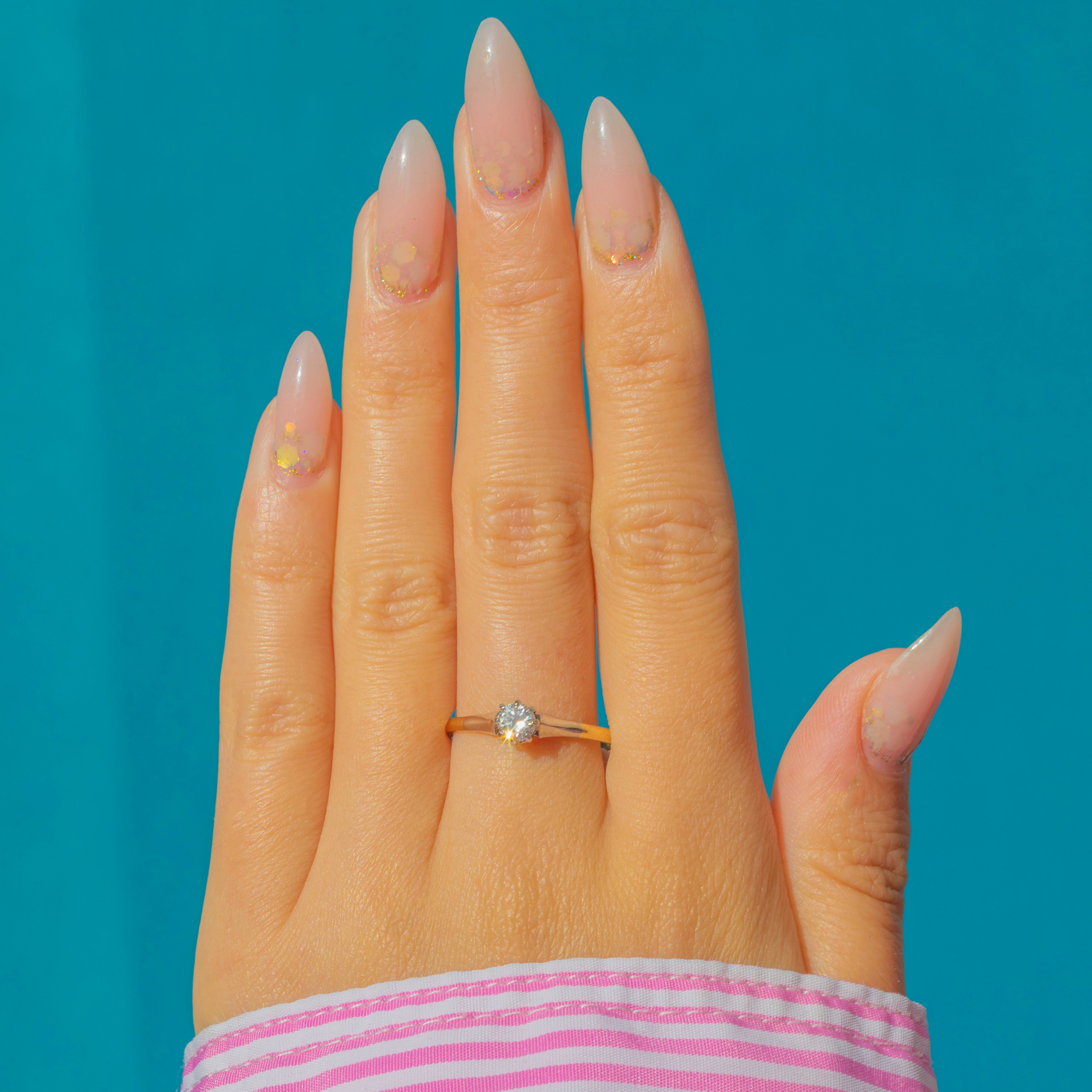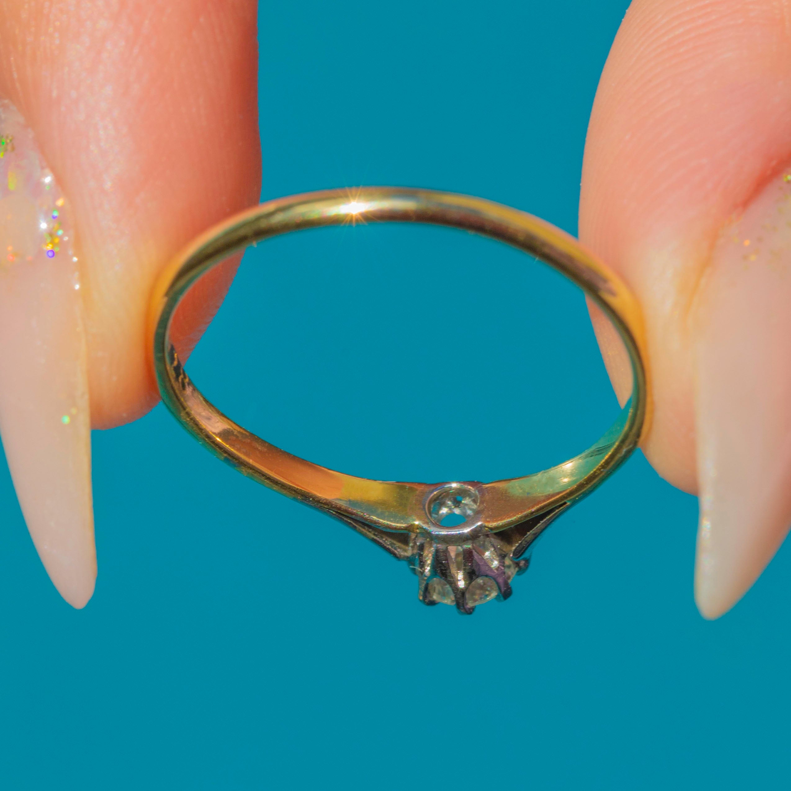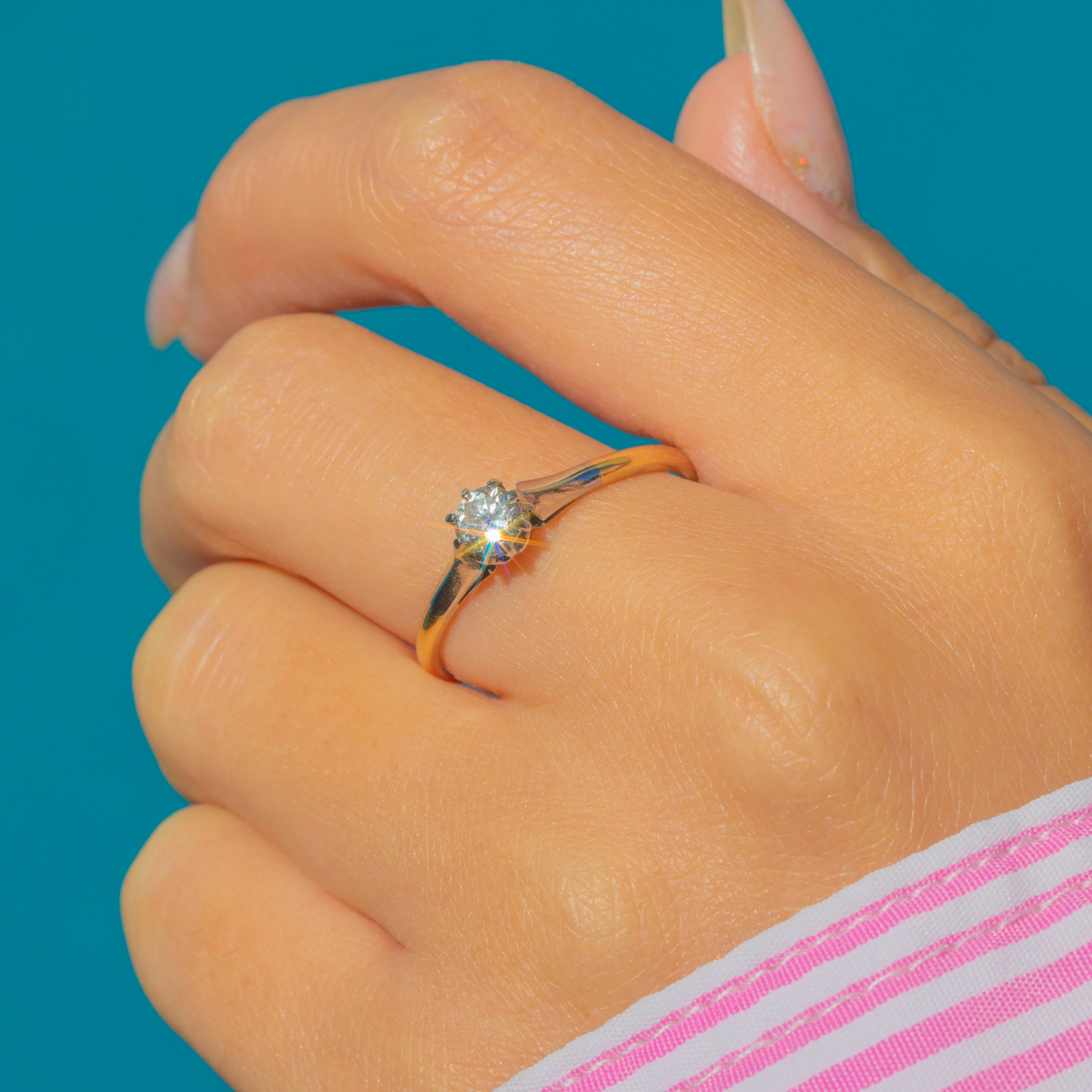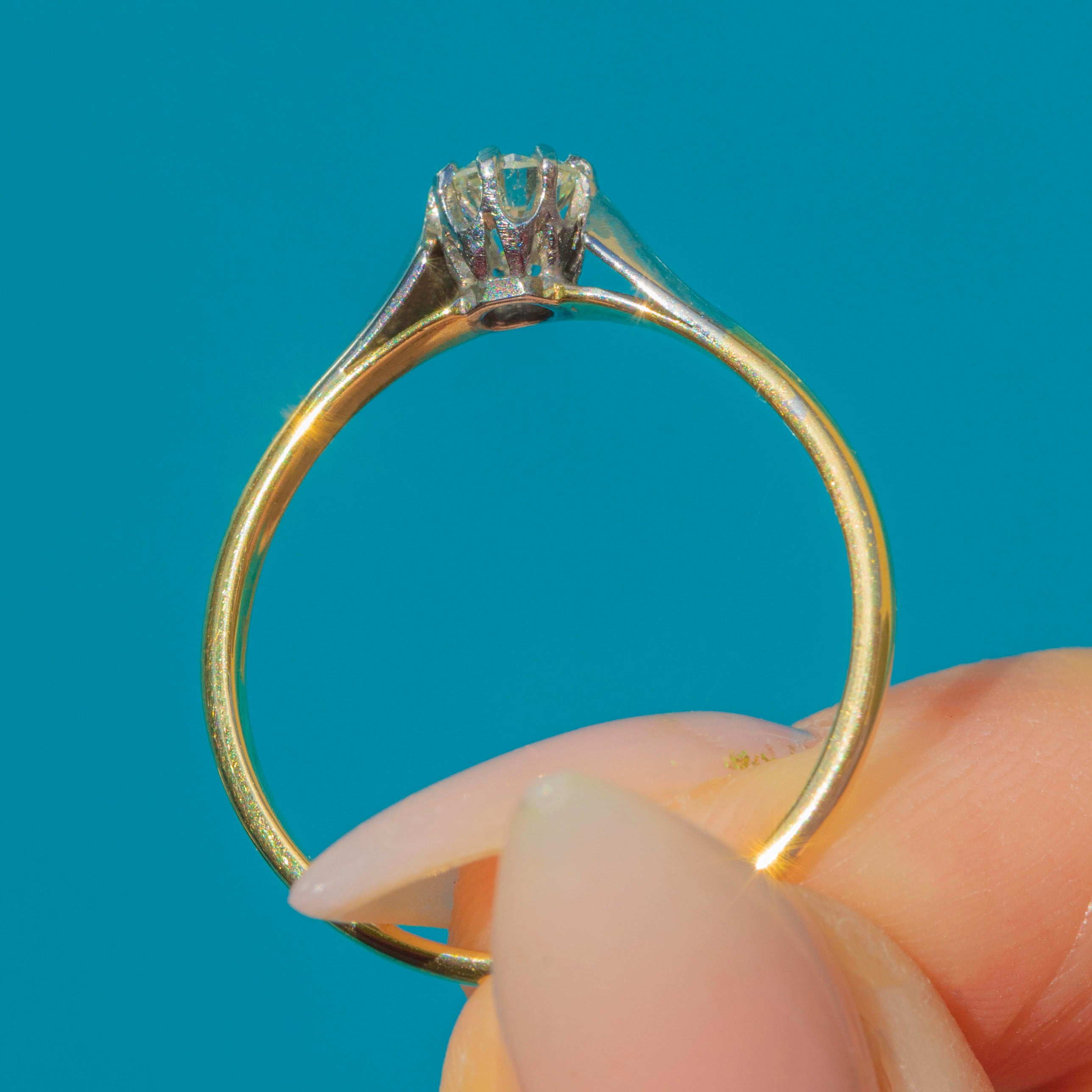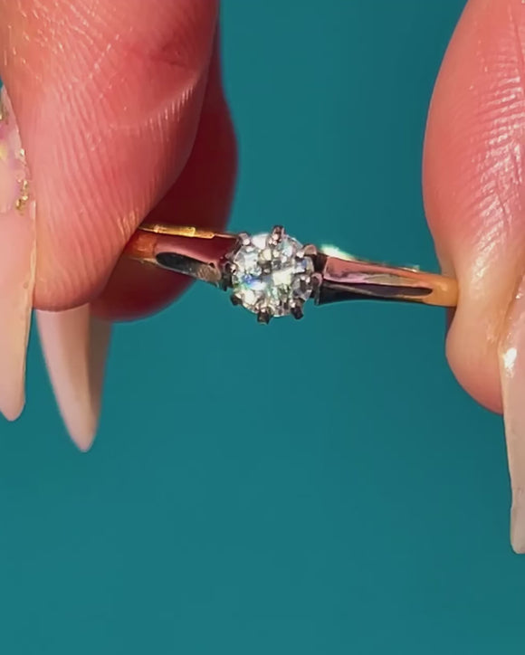 A classic Art Deco solitaire ring crafted in 18ct Yellow Gold with Platinum claw settings, set with a sparkling old cut Diamond of approx 0.15ct. The stone is exceptionally bright, graded around G/H colour with VS–VVS clarity, a rare quality for antique Diamonds.