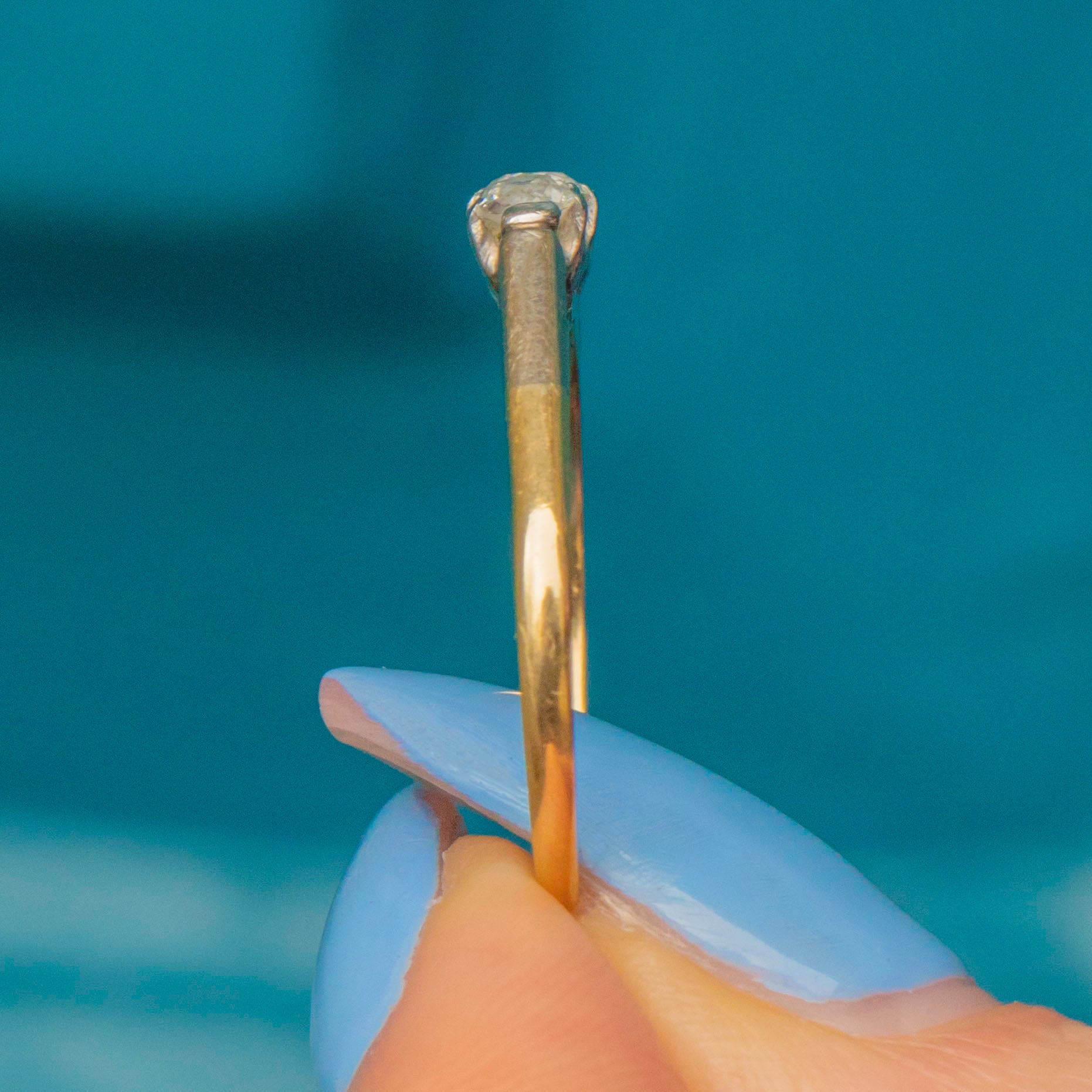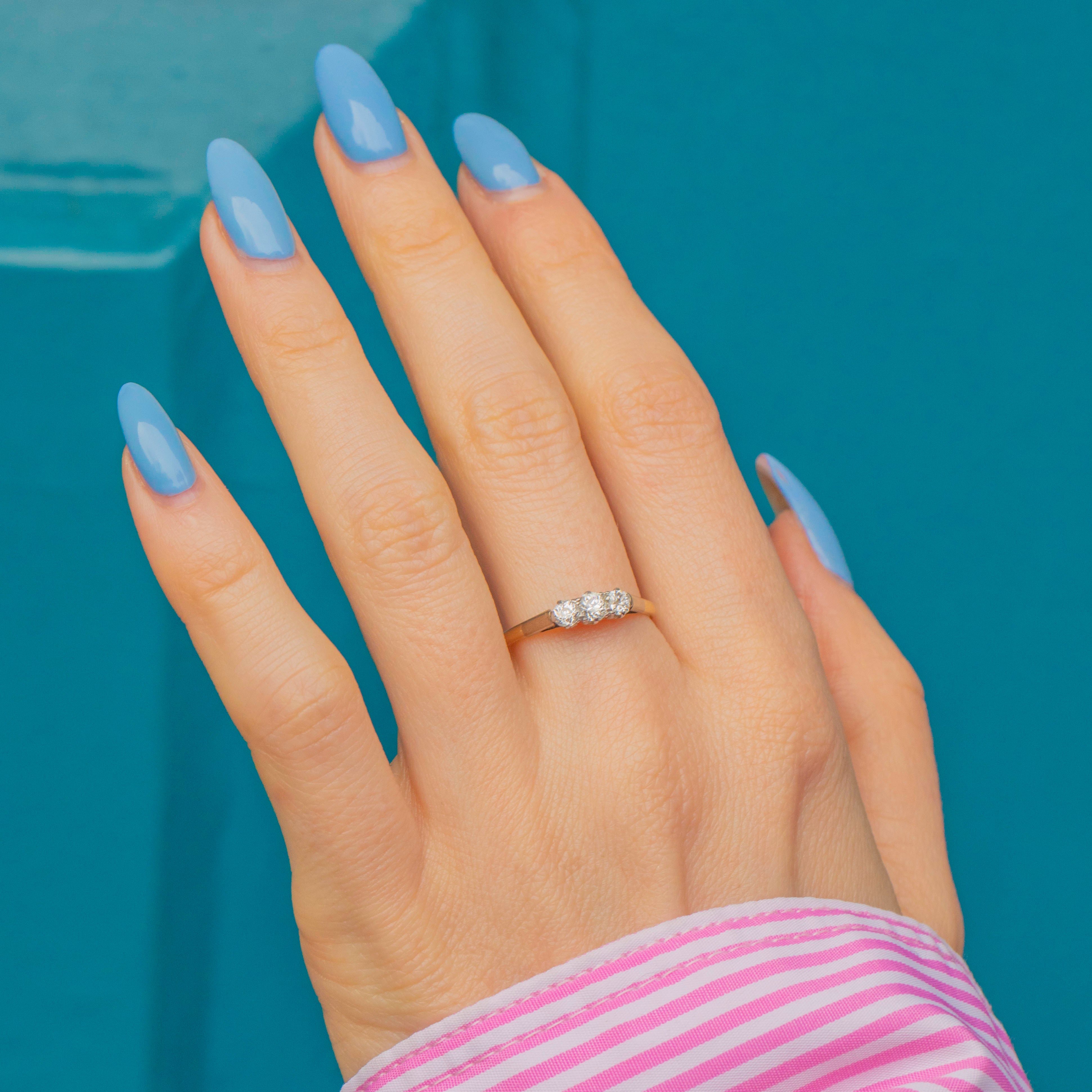 Crafted from 18ct Gold with Platinum settings, this Art Deco ring features a trio of twinkling Diamonds, each scintillating in the light as she rests on your finger. Her outer Diamonds are each old-mine cut, while the central Diamond is an old-transitional cut, with a combined weight of 0.35 carats.