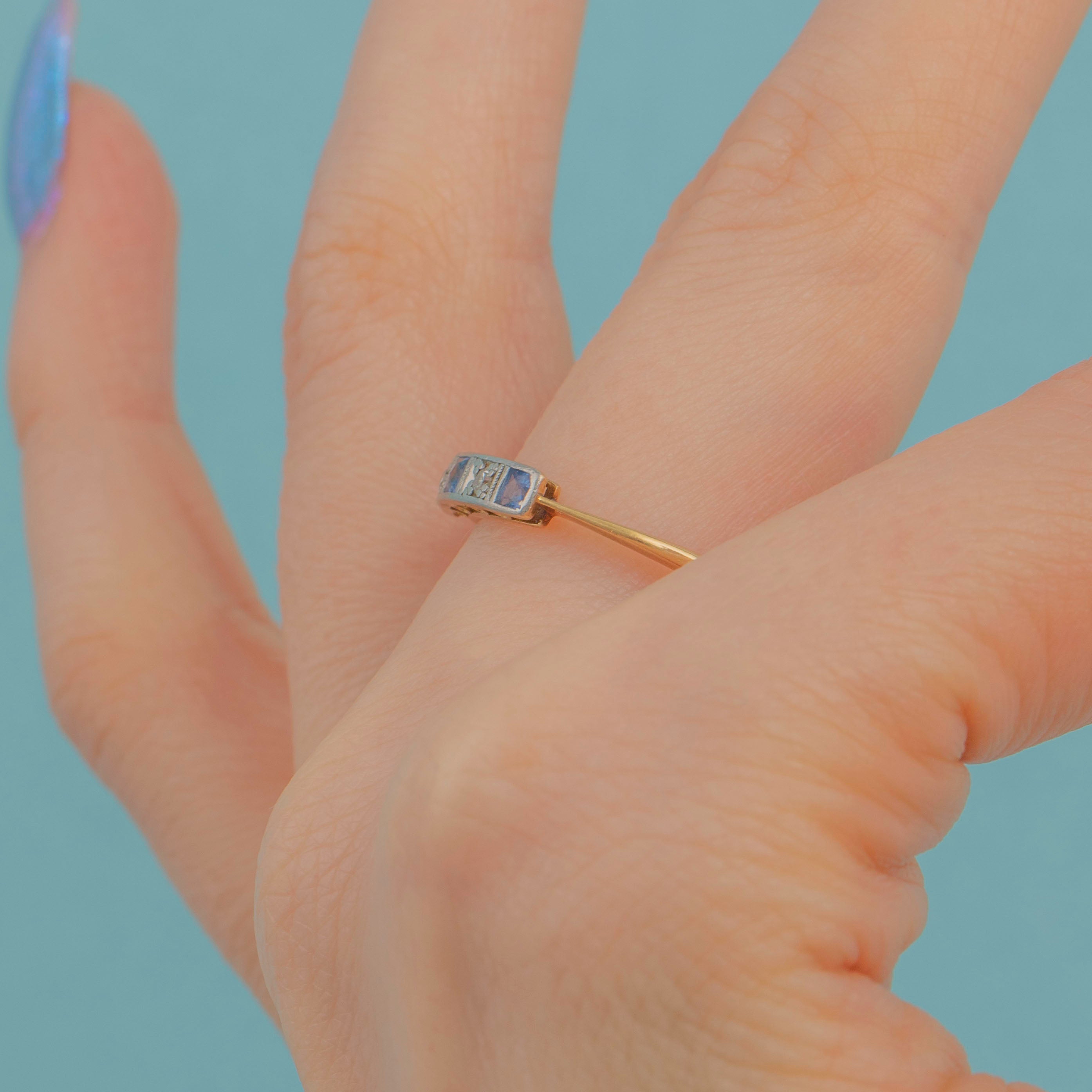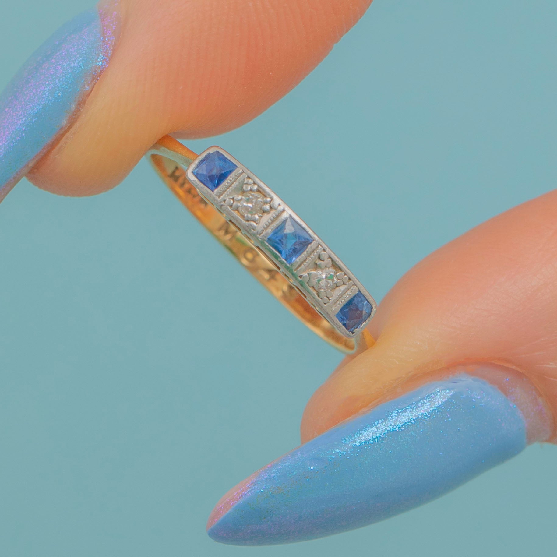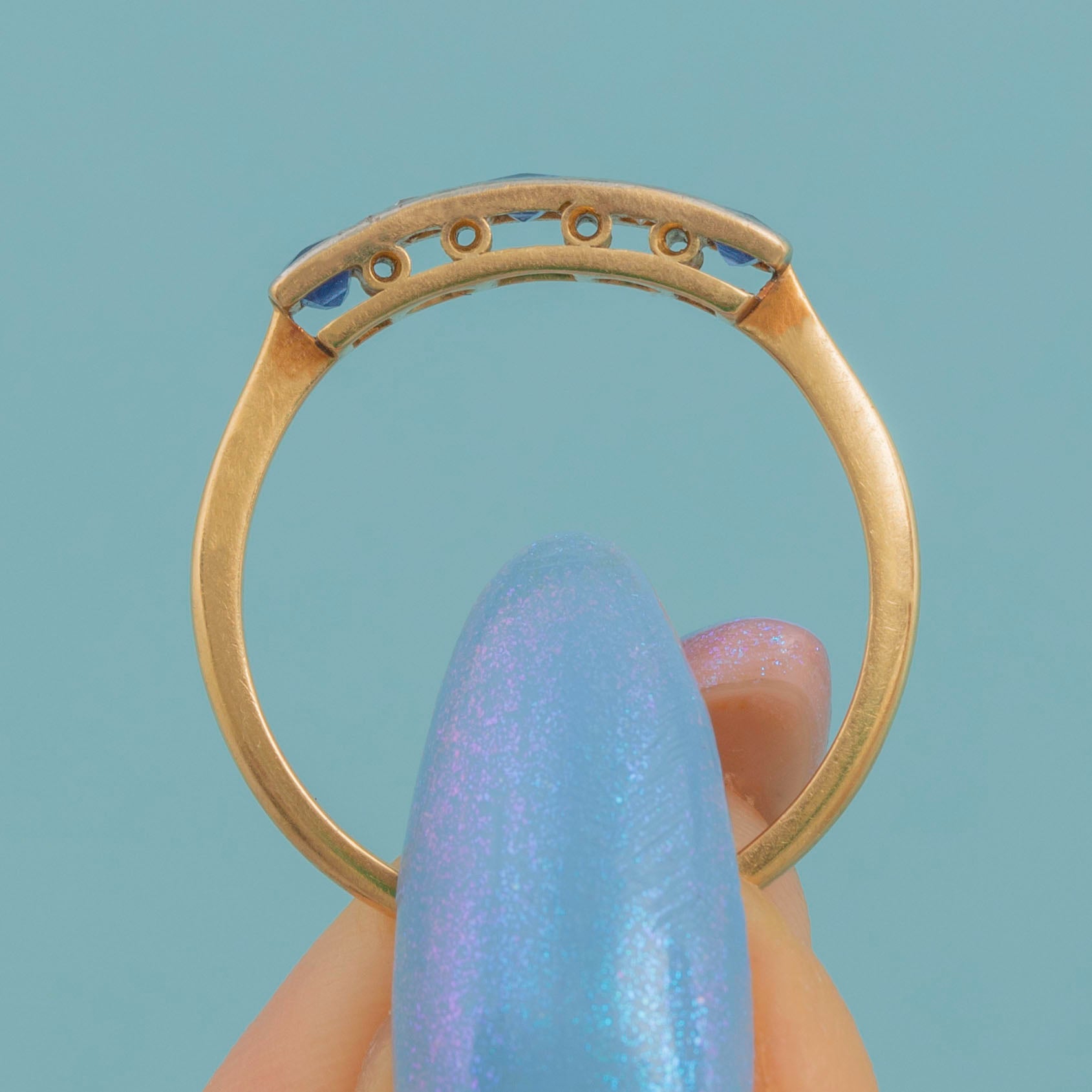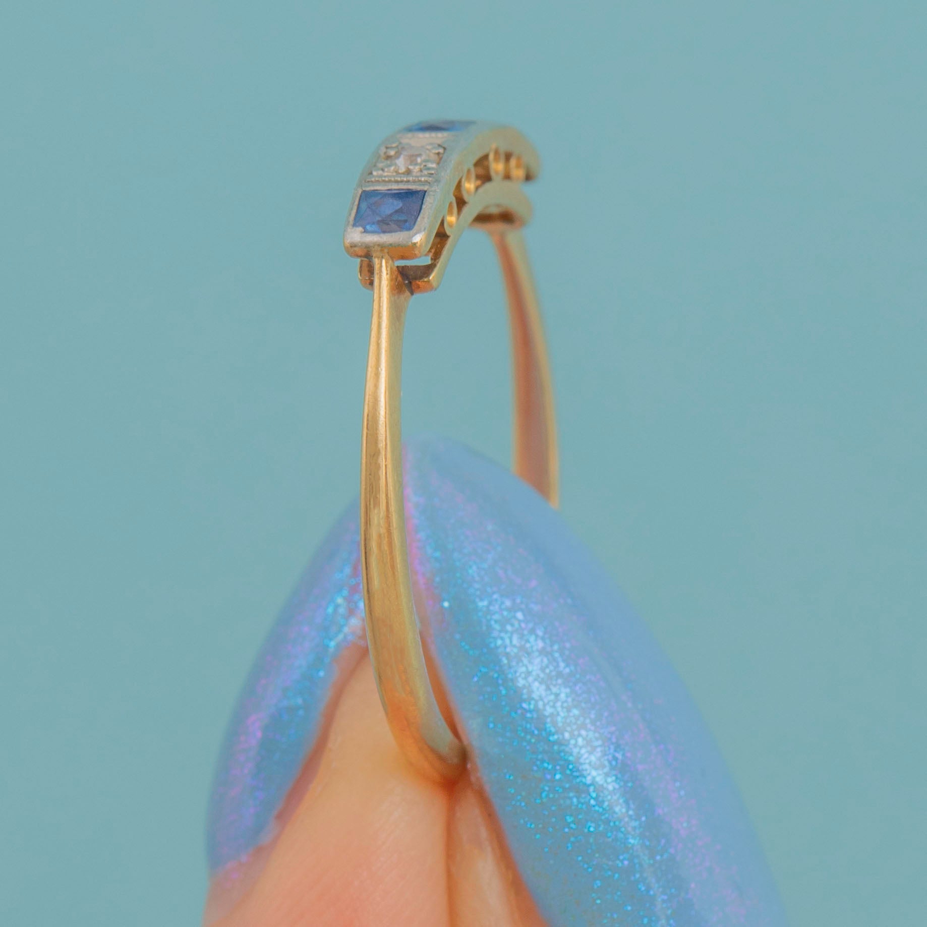 EXCELLENT. This Art Deco 18ct Gold and Platinum Sapphire Diamond five stone ring is in excellent condition. Her gemstones are vibrant and sit securely within their settings. The Gold is brightly saturated and the band is smooth with lovely, clear Art Deco stamps inside.