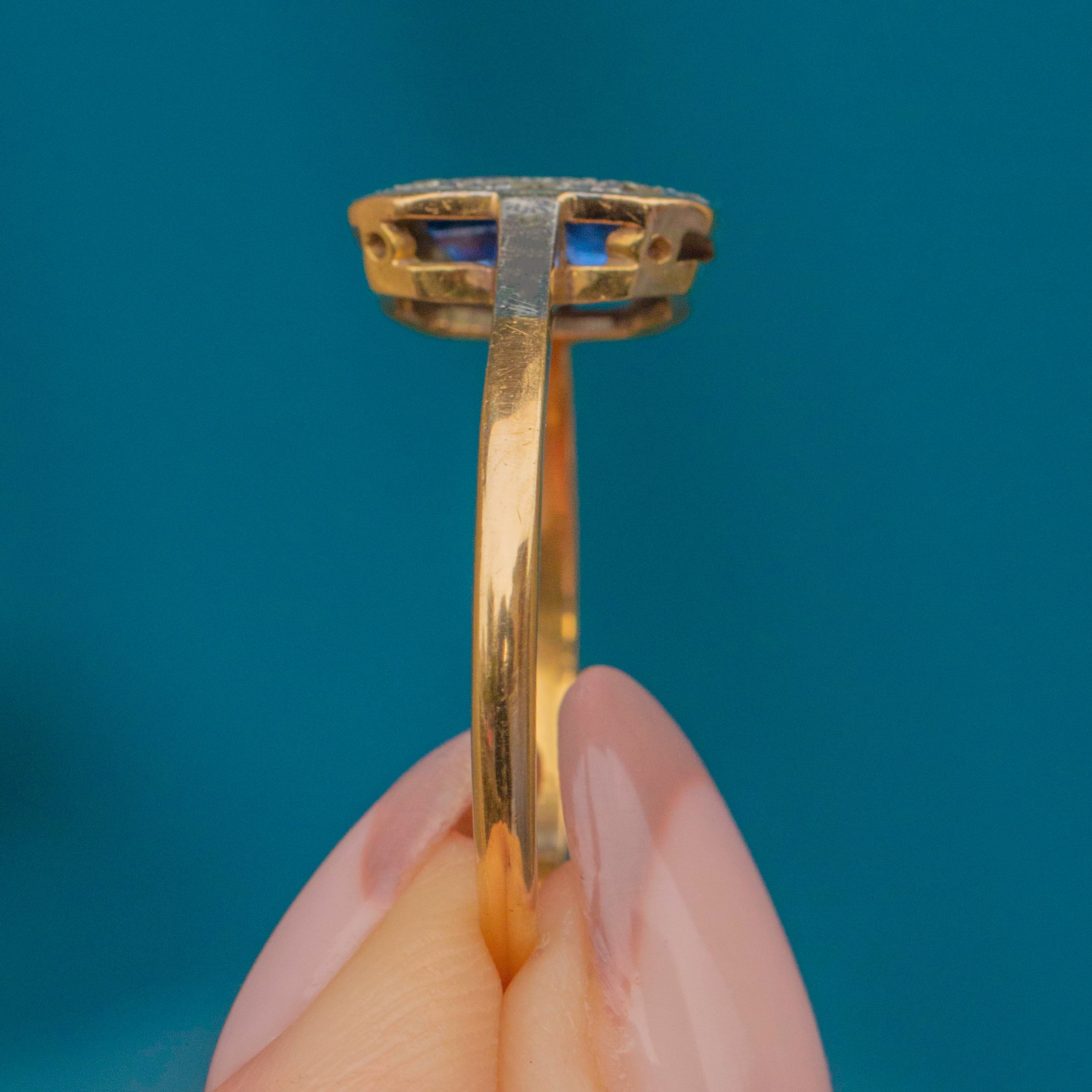 EXCELLENT. We are pleased to present this Art Deco 18ct Gold and Platinum Sapphire Diamond panel ring in excellent condition. Her Diamonds and Sapphires are radiant, catching the light beautifully and free from scuffs or scratches. Her 18ct Gold and Platinum band is also in wonderful condition, making this ring a must-have!