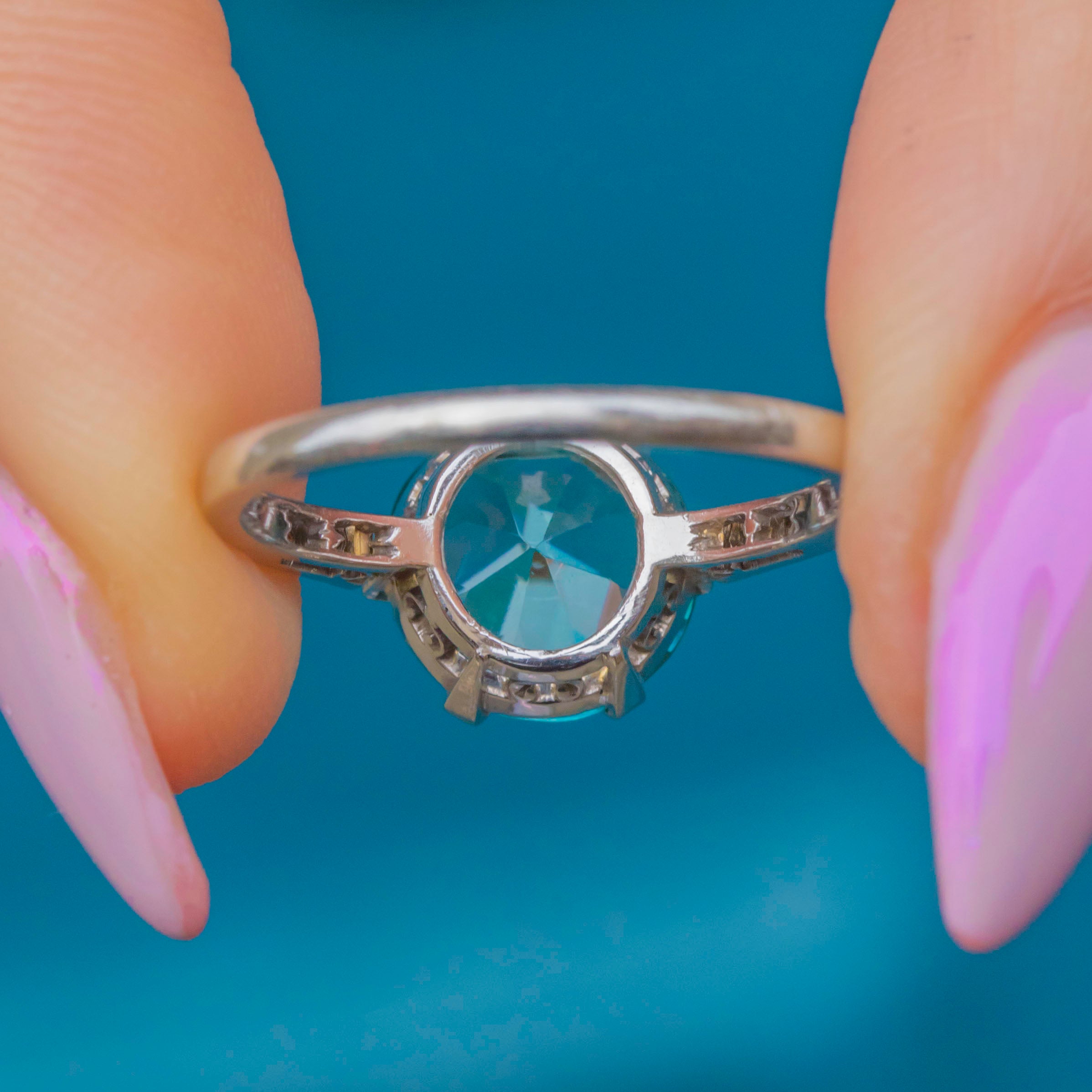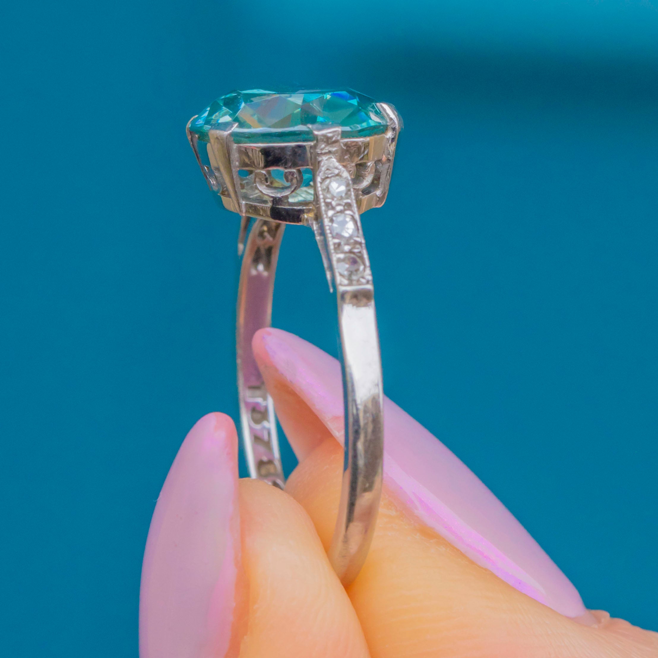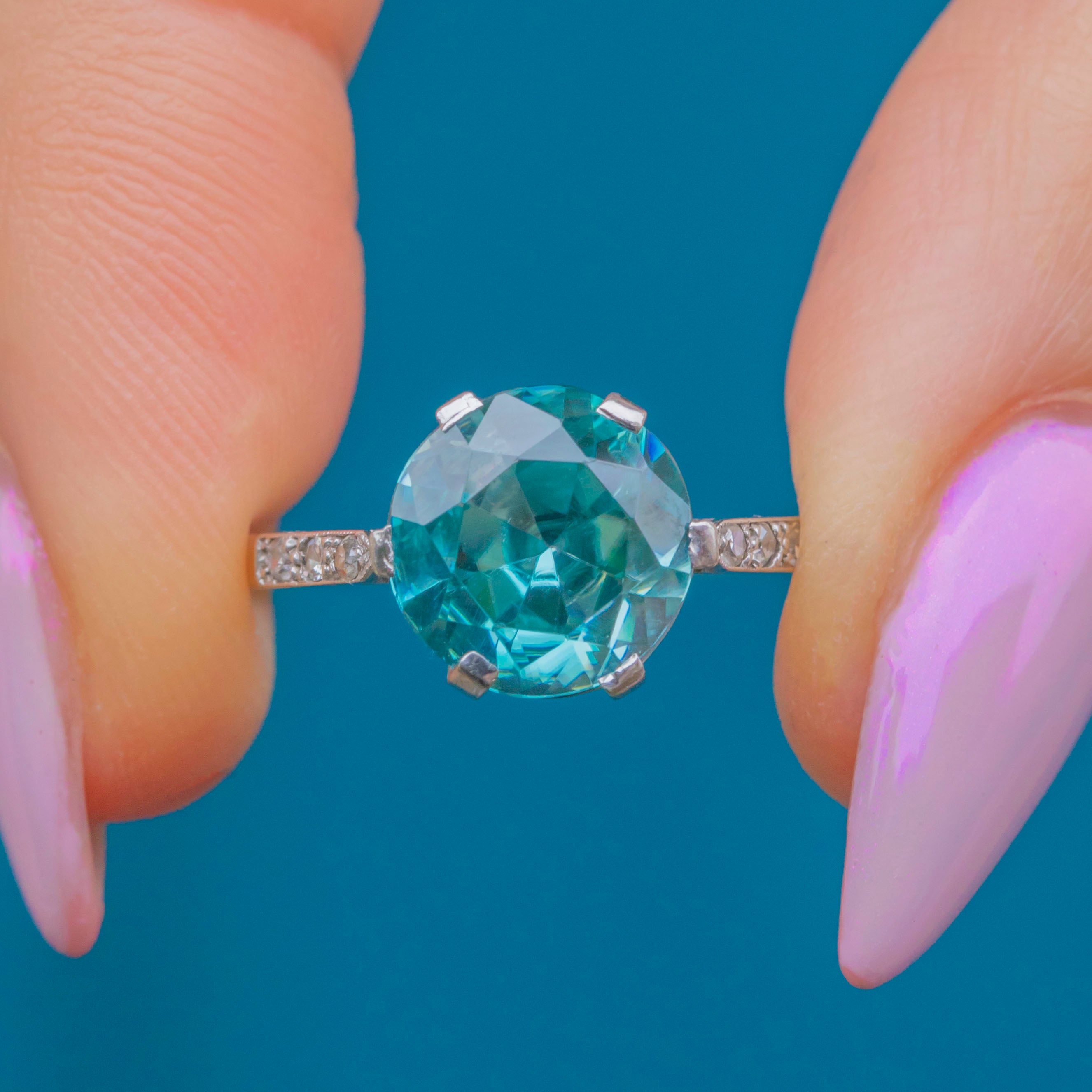 This elegant Art Deco ring is centred with a vivid 2.70ct blue Zircon, full of brilliance and fire, flanked by six twinkling old-cut Diamonds set into Platinum shoulders. The cool, lustrous Platinum contrasts beautifully with the rich 18ct Gold band, a quintessentially Deco colour pairing.
