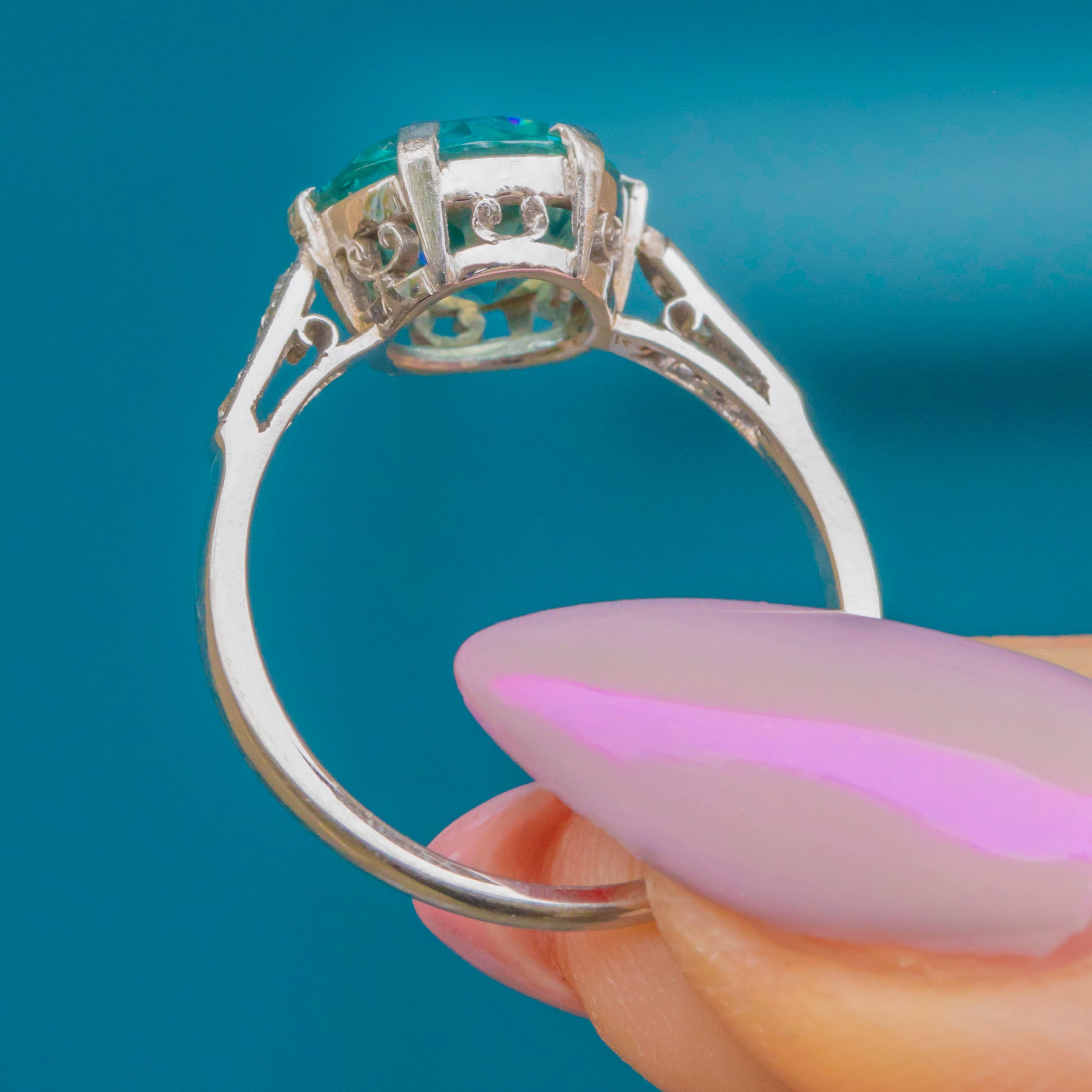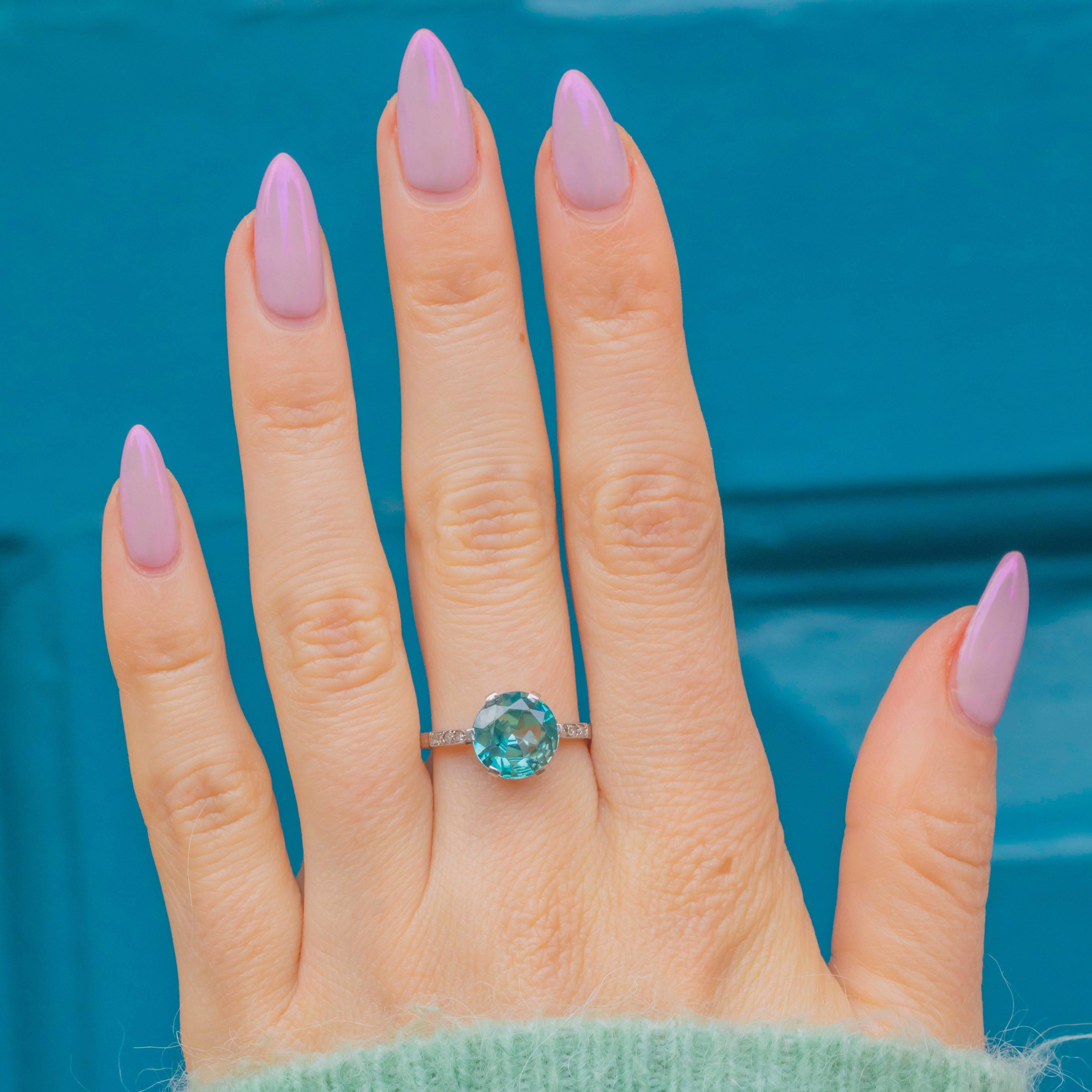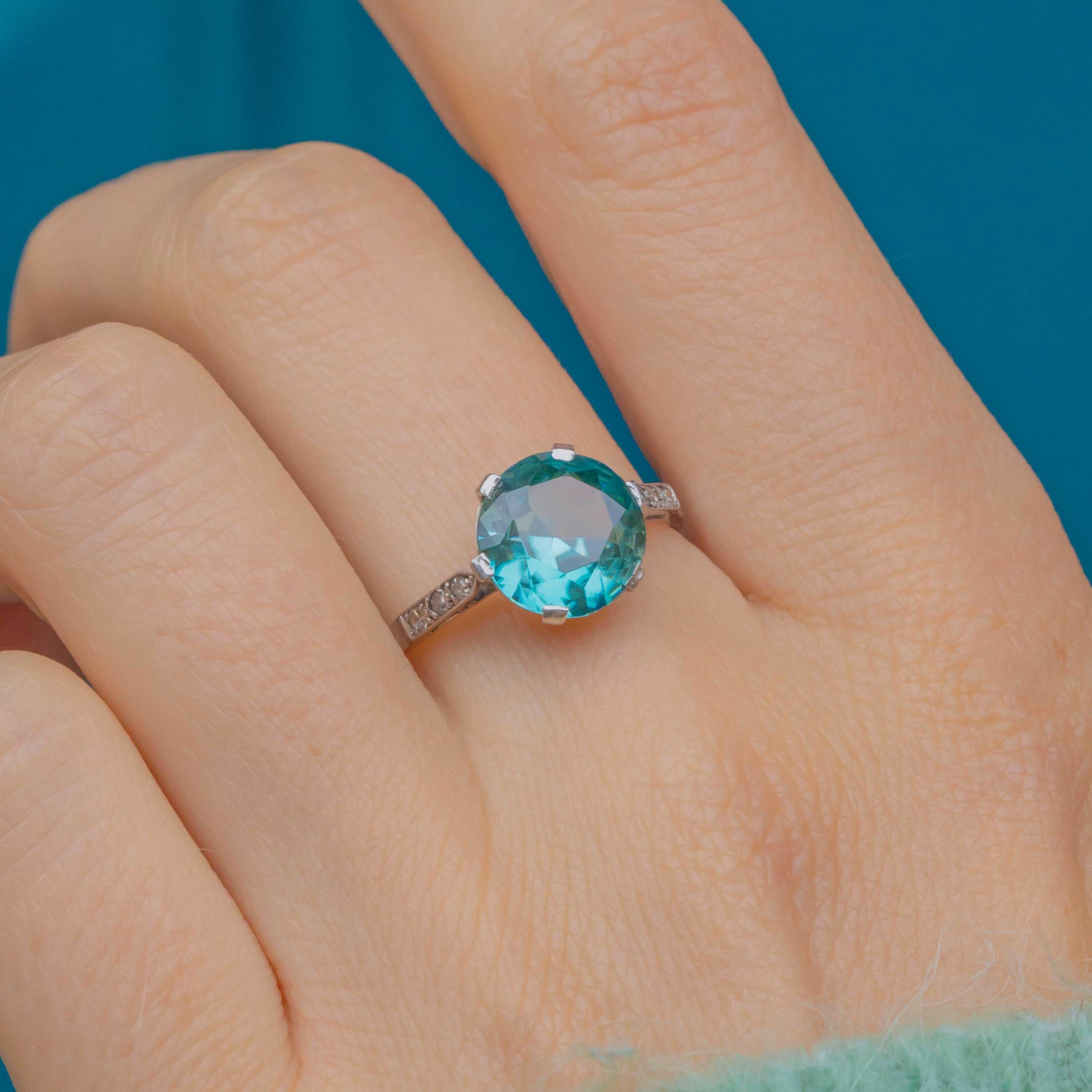 This elegant Art Deco ring is centred with a vivid 2.70ct blue Zircon, full of brilliance and fire, flanked by six twinkling old-cut Diamonds set into Platinum shoulders. The cool, lustrous Platinum contrasts beautifully with the rich 18ct Gold band, a quintessentially Deco colour pairing.