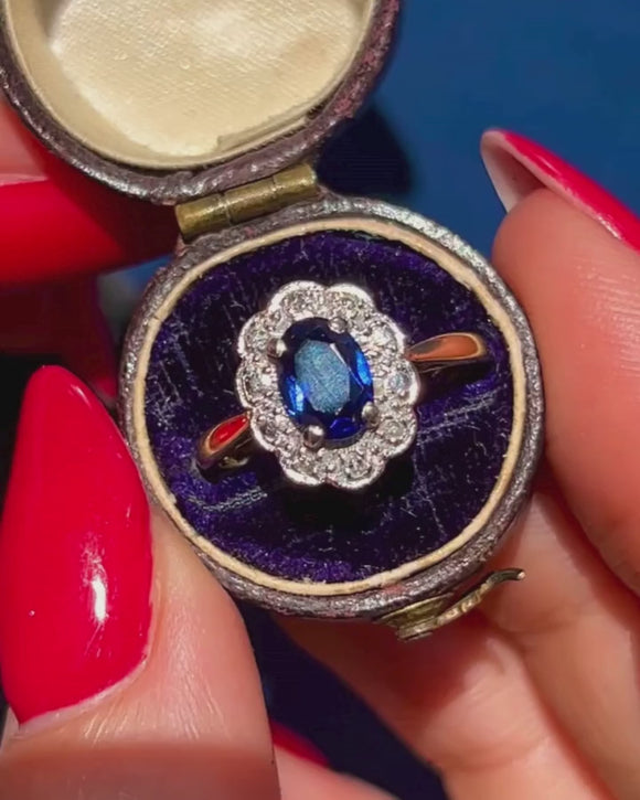 Art Deco 18ct Gold Sapphire Diamond Cluster Ring, 0.65ct Sapphire