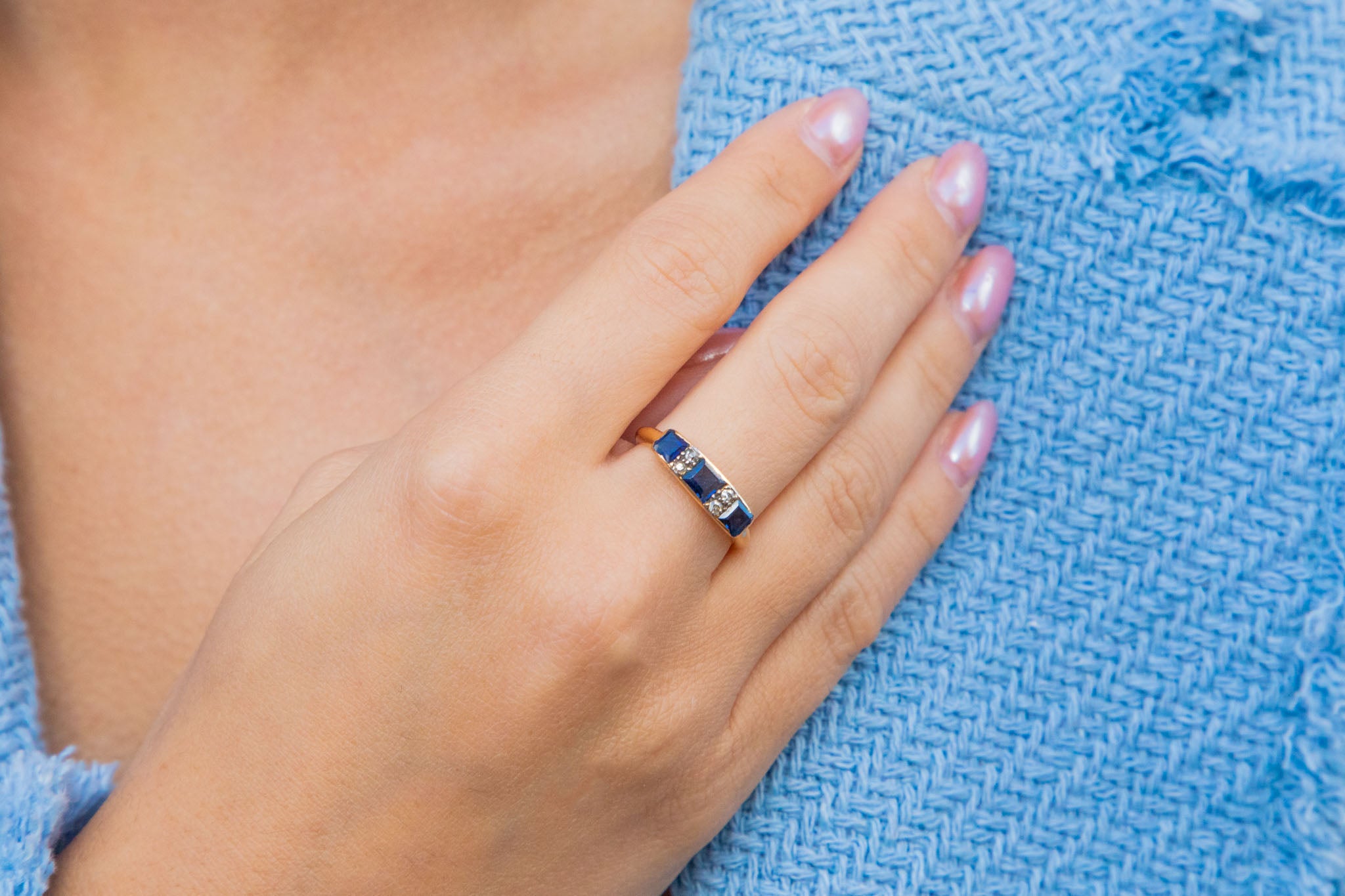 This Art Deco 18ct Gold Sapphire Diamond ring is a fine example of craftsmanship during the early 1900s! Boasting three square Sapphires, flaunting moody deep blue hues, with four mesmerising Diamonds nestled between - she looks as though she has been plucked from the night sky!