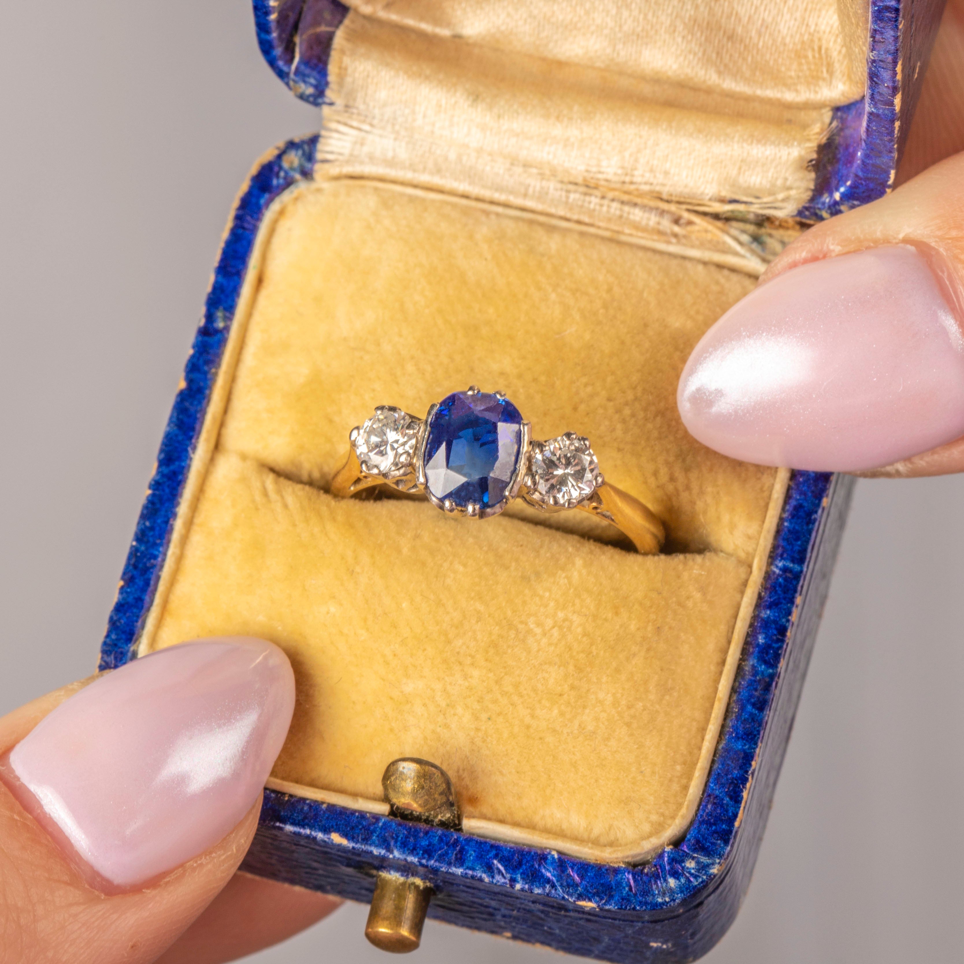 This Art Deco 18ct Gold Sapphire Diamond trilogy ring is just irresistible. Trilogy rings have a timeless appeal, and this heavenly beauty is no exception!