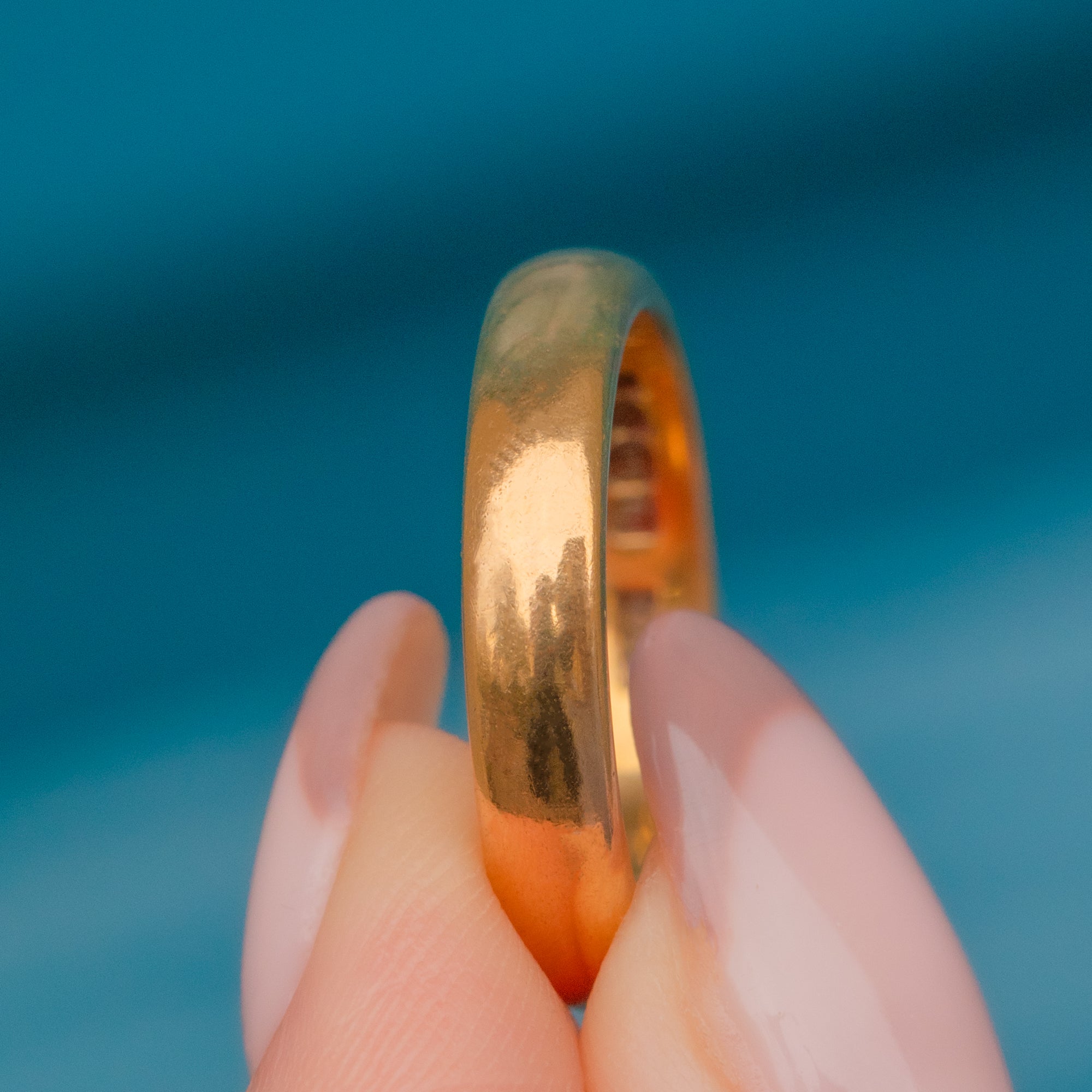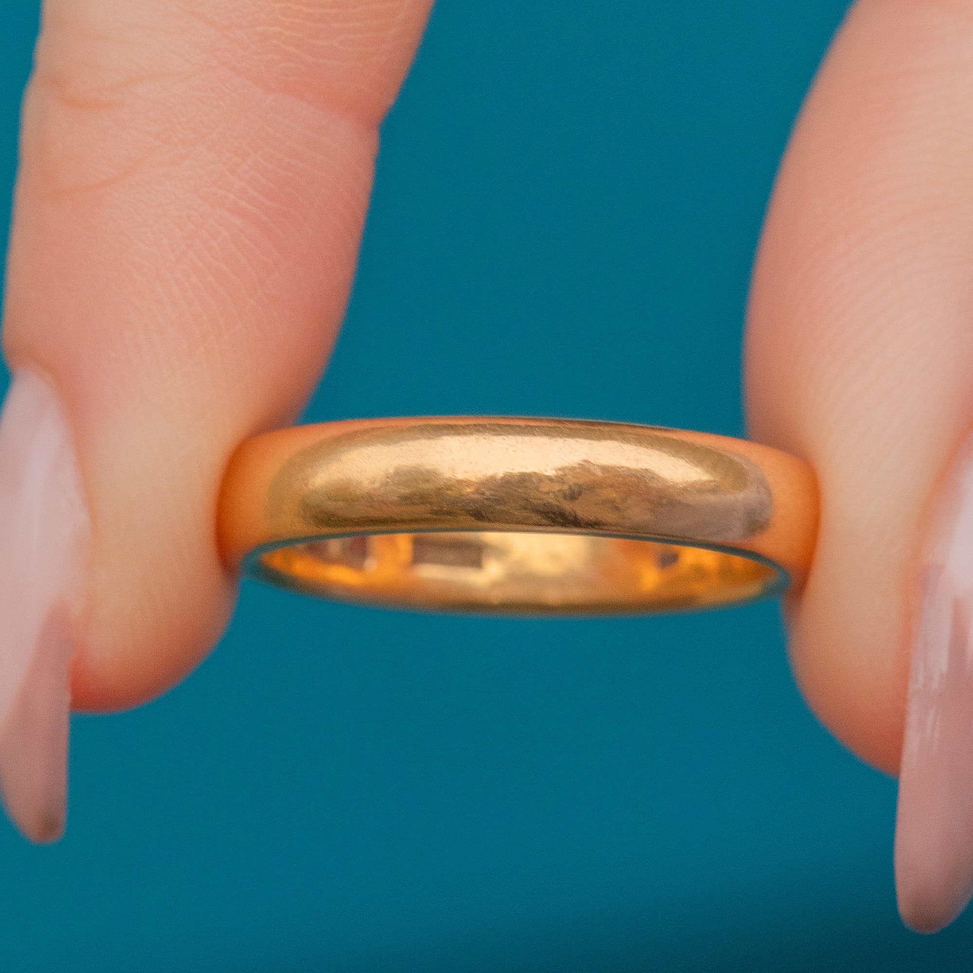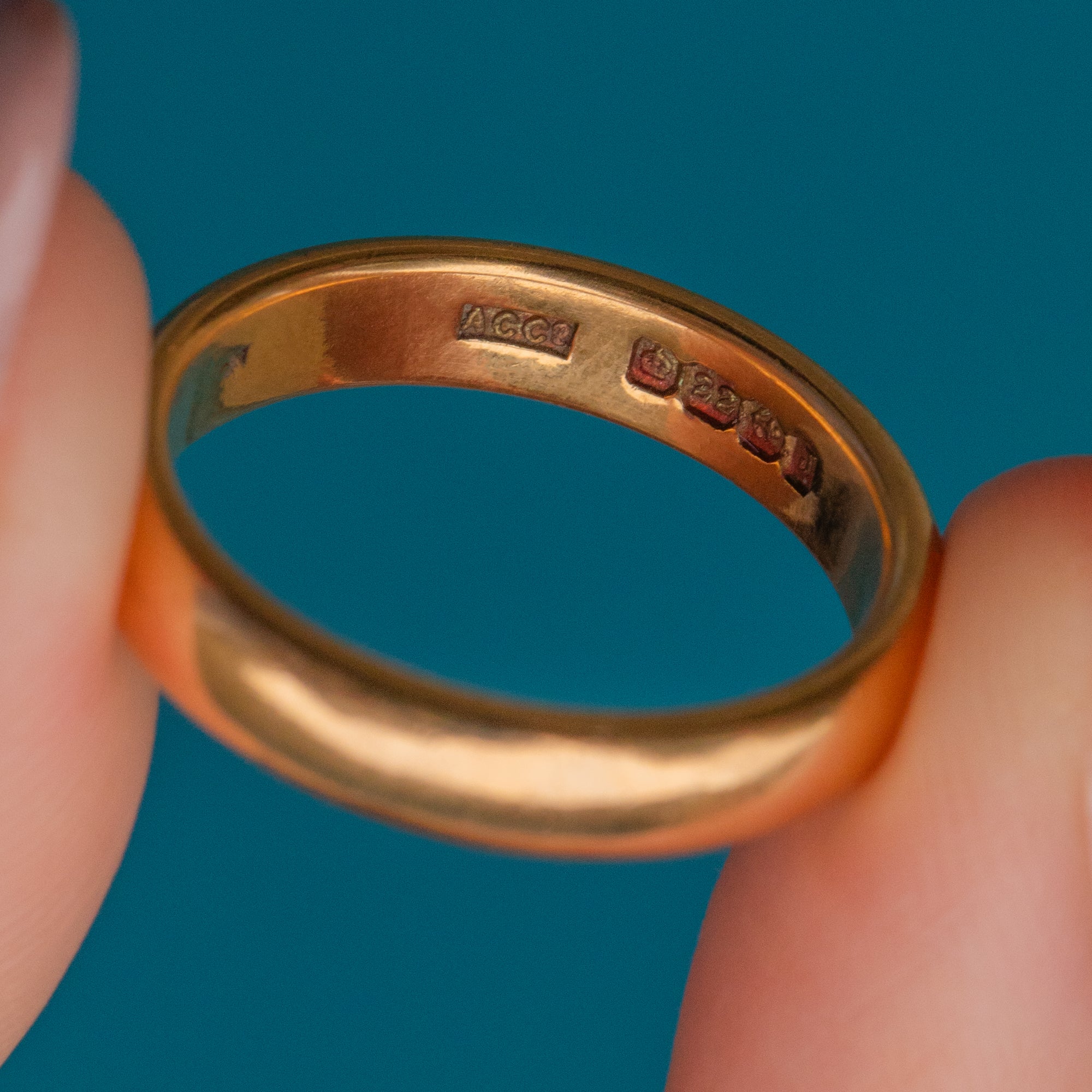 EXCELLENT. This Art Deco 22ct Gold wedding band is in excellent condition. The ring is fully hallmarked on the inside, and the band has a gorgeous saturated hue. She glides smoothly onto the finger and has a nice, weighty thickness and rounded profile for comfortable wear.
