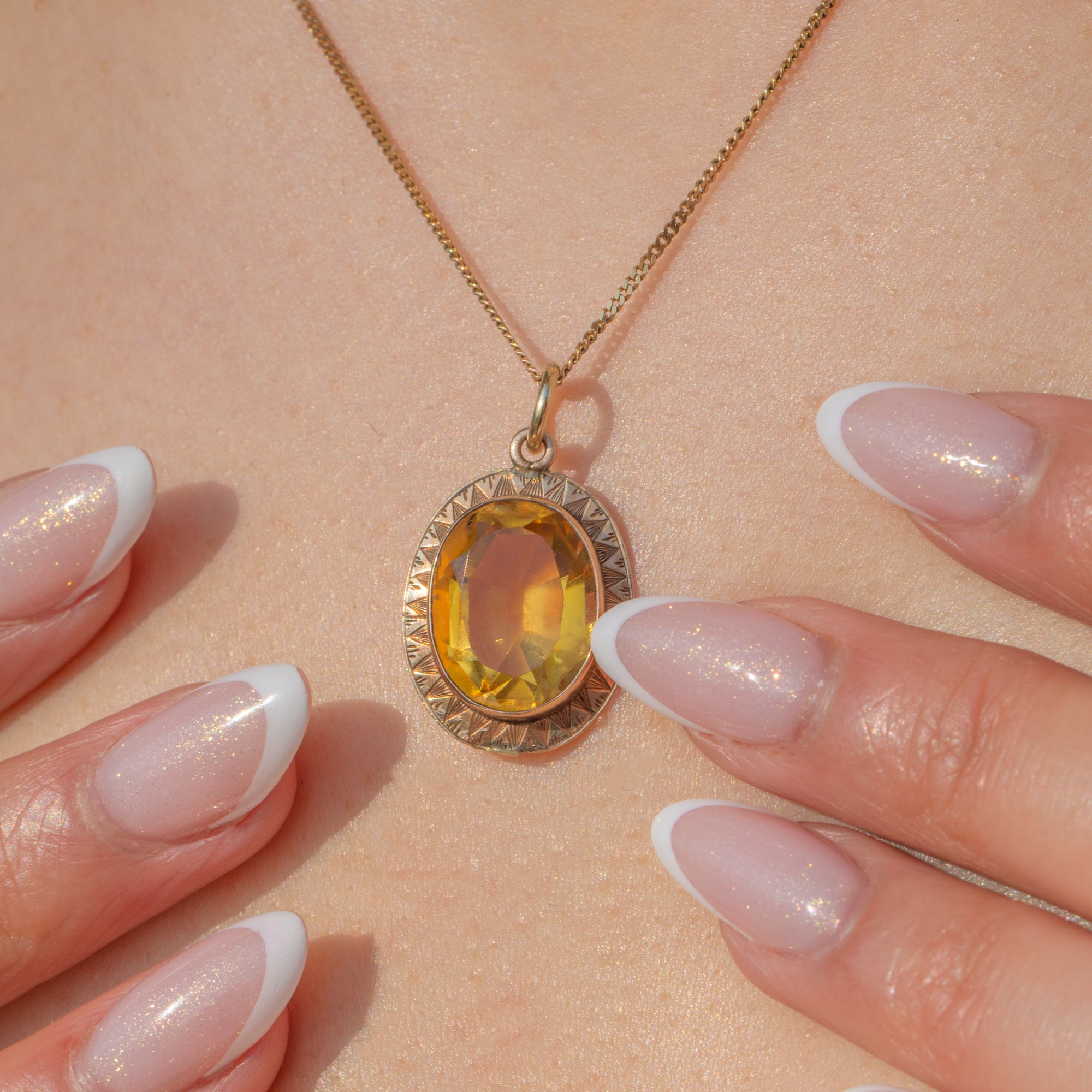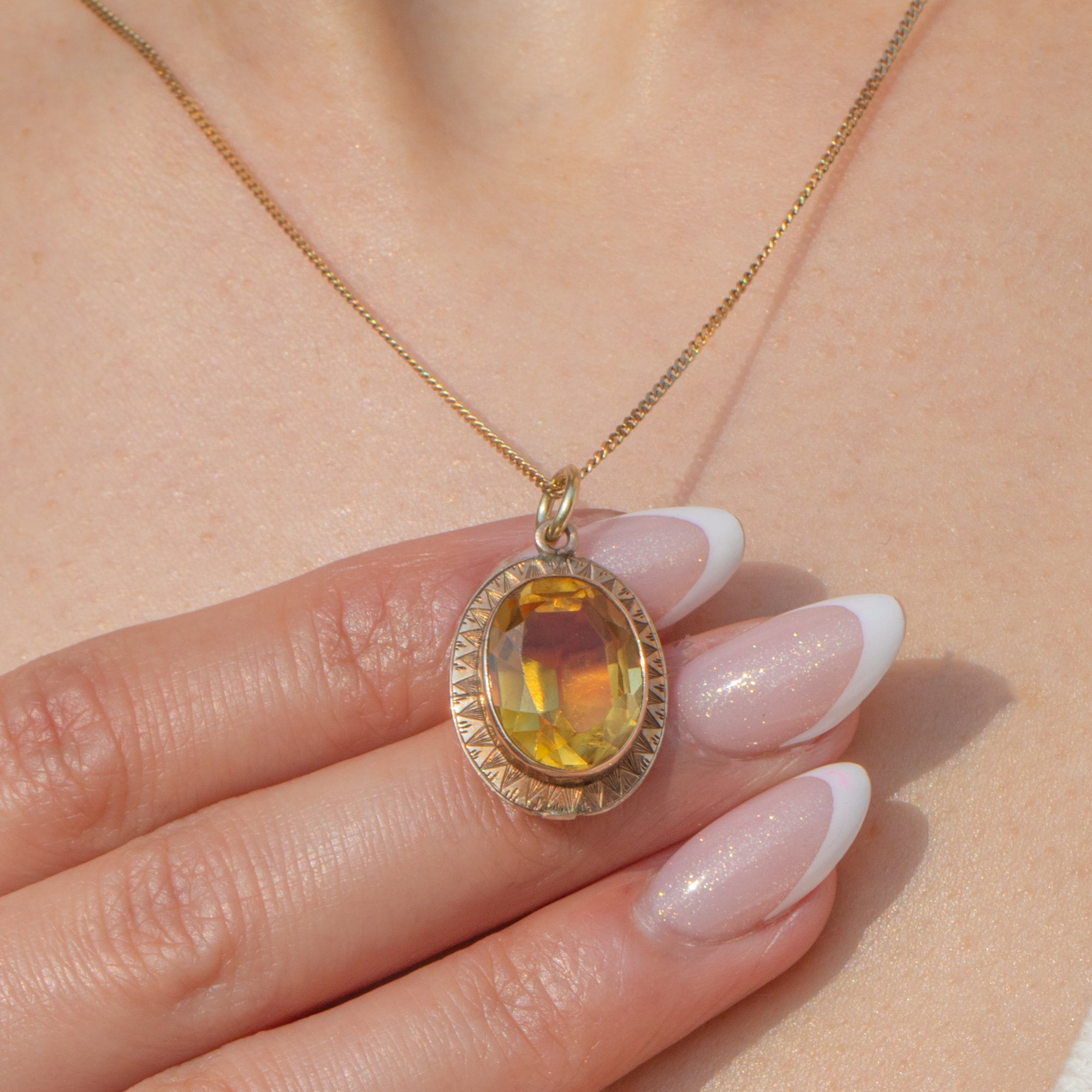 This Art Deco 9ct Gold Citrine pendant will inject a touch of radiance into your attire! Perfect for suspending from a fine Gold chain, this antique treasure is akin to a pool of honey and will look sublime adorning your décolletage.