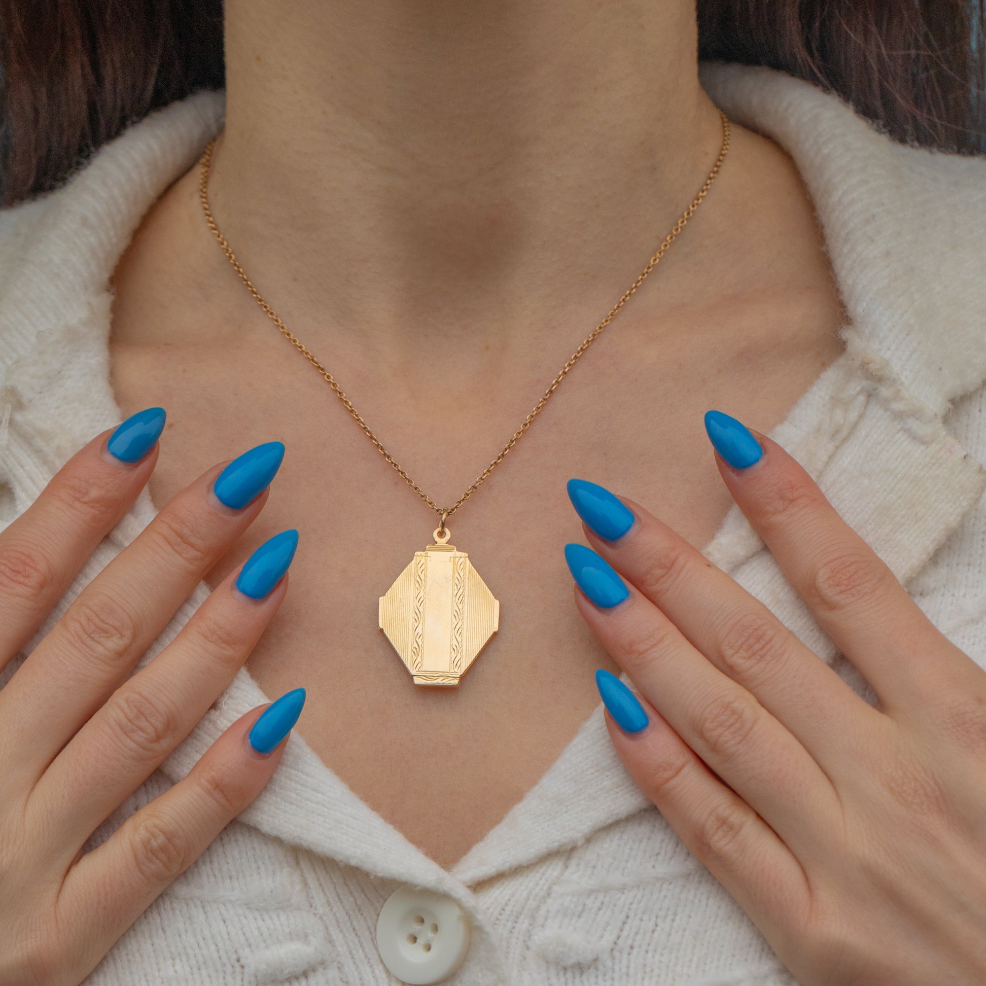 An exquisite find, this Art Deco 9ct Gold engraved locket will make a striking addition to your collection! Typically Deco in every way, this geometric locket boasts bold lines and intricately engraved details all crafted in solid 9ct Gold.
