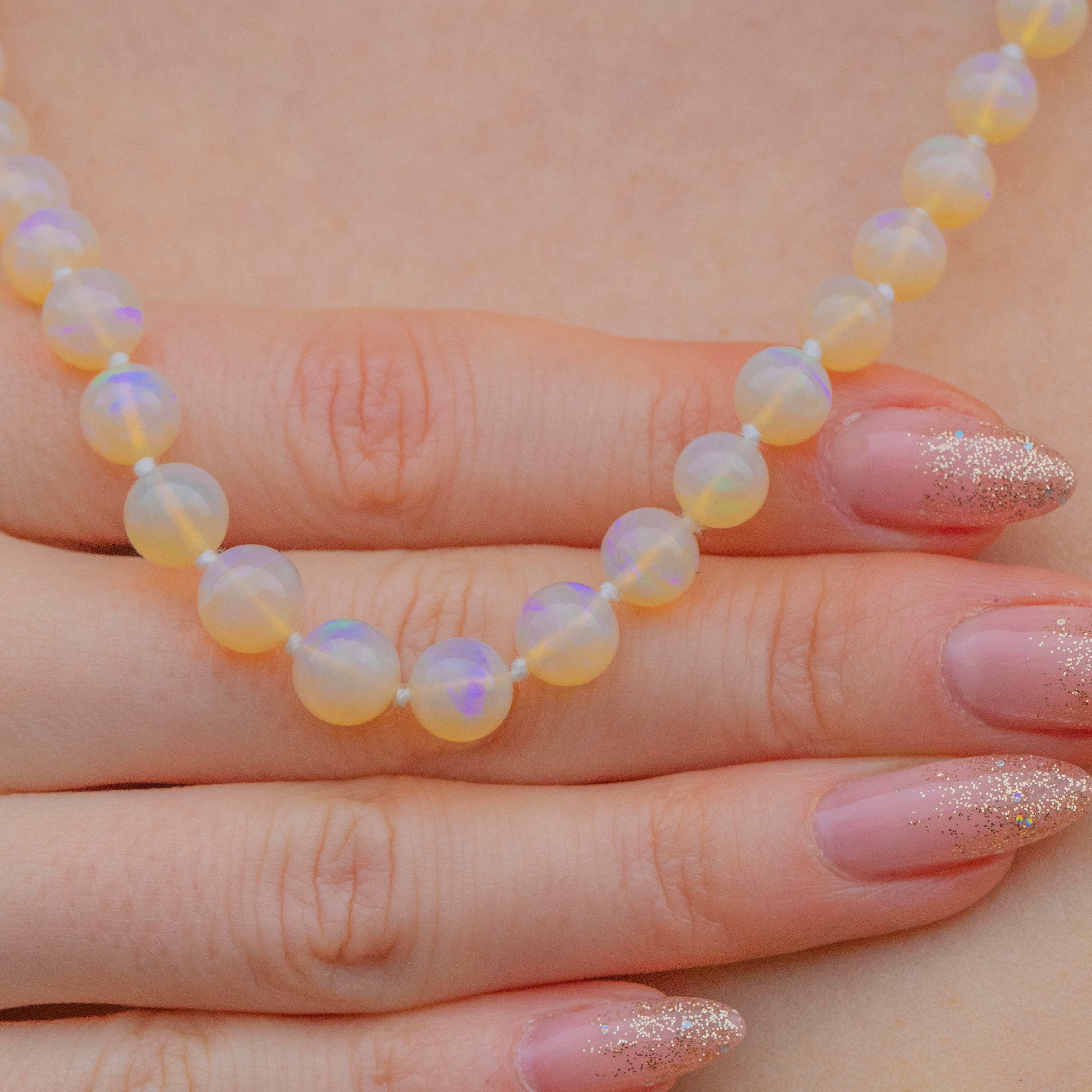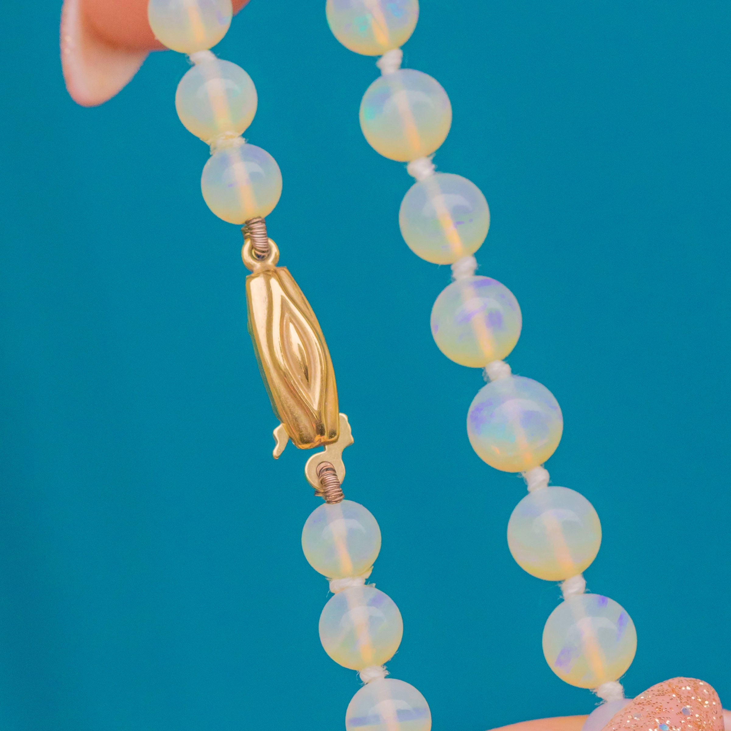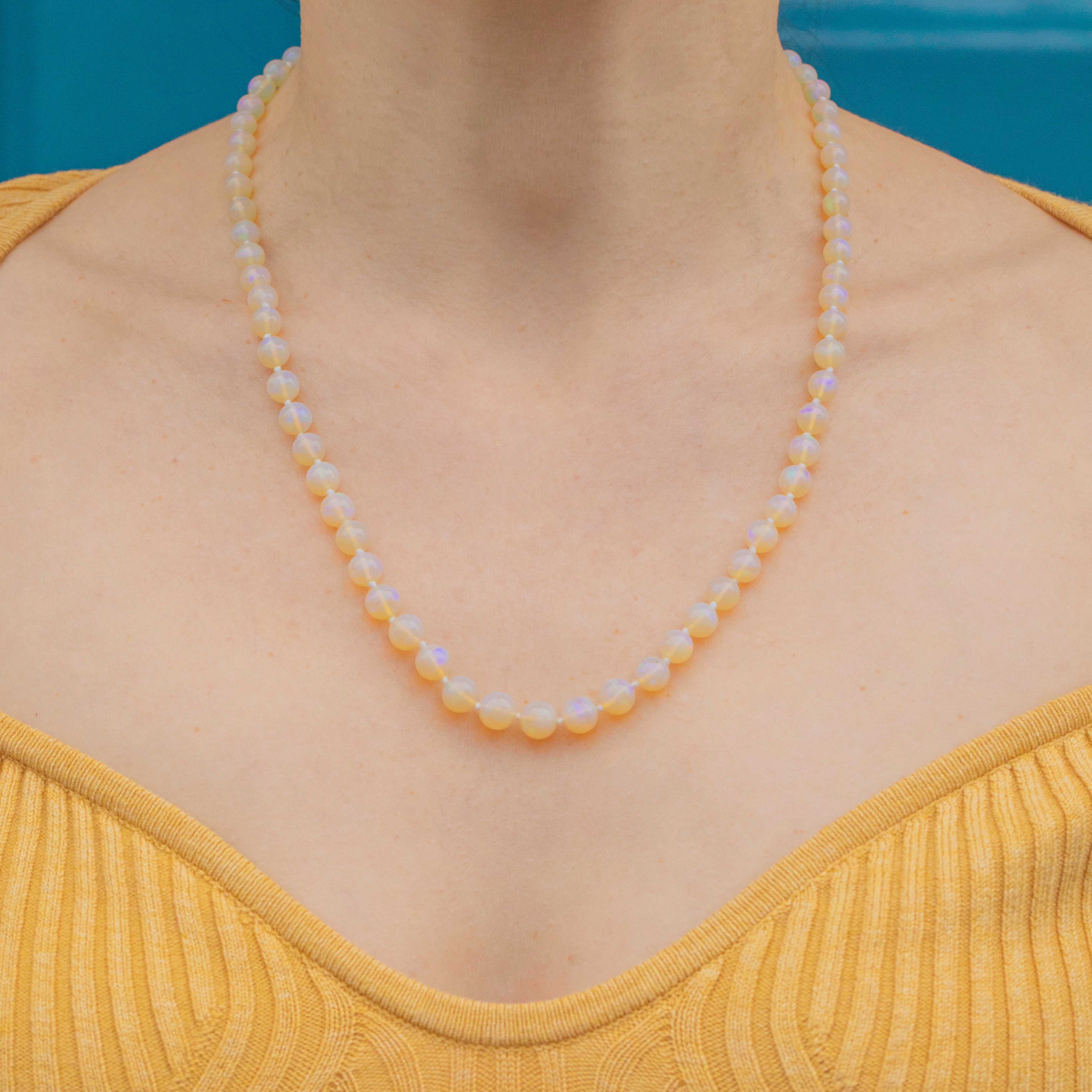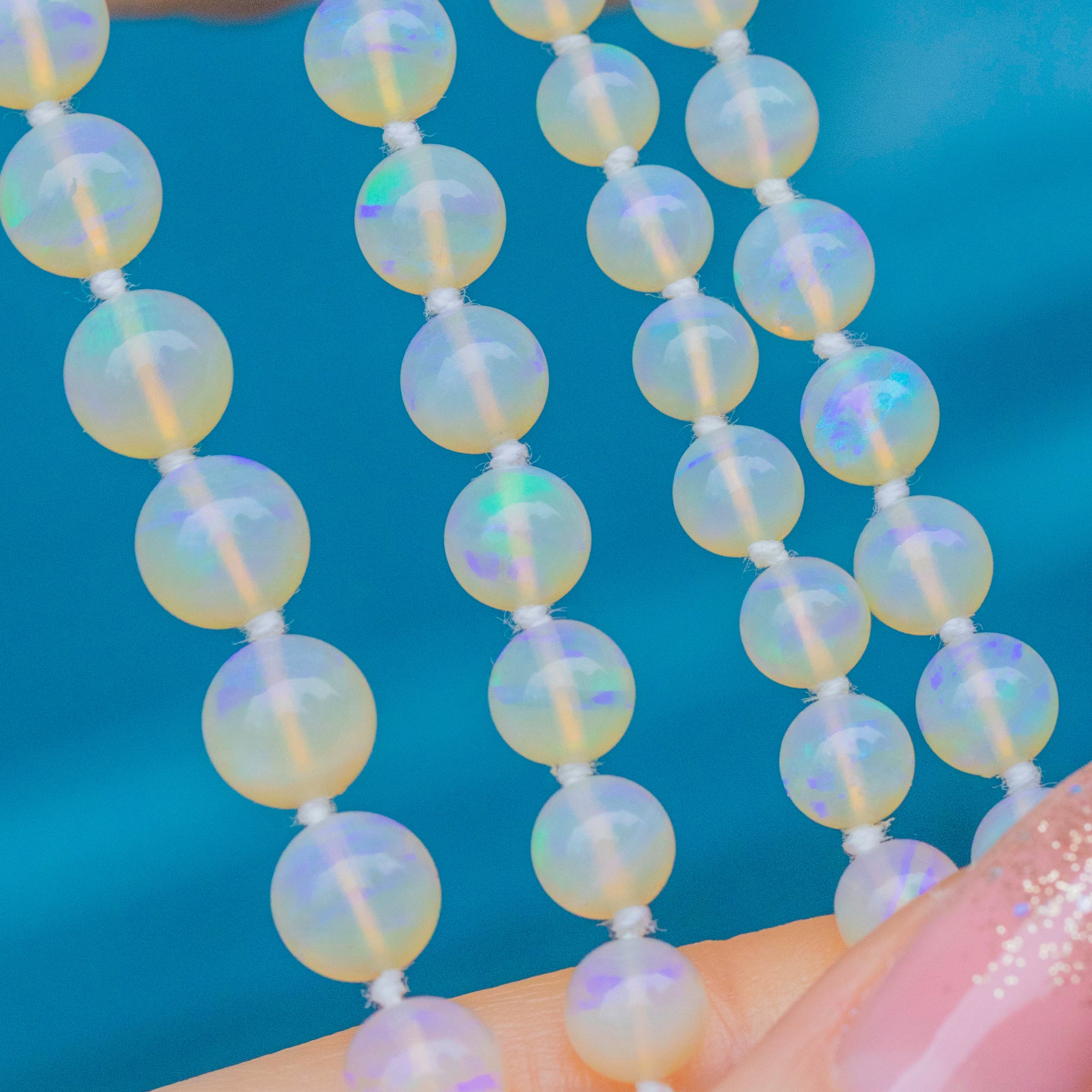 VERY GOOD This Art Deco 9ct Gold Graduating Opal Beaded Necklace is in very good condition. The Opal beads are well threaded and effortlessly glide around your neck. Some of the Opals bear some natural blemishes, which is to be expected from a natural stone. The slide clasp shuts tightly allowing you to wear this antique Opal necklace with confidence. The moment this piece of Art Deco jewellery is yours, you won't want to take her off!
