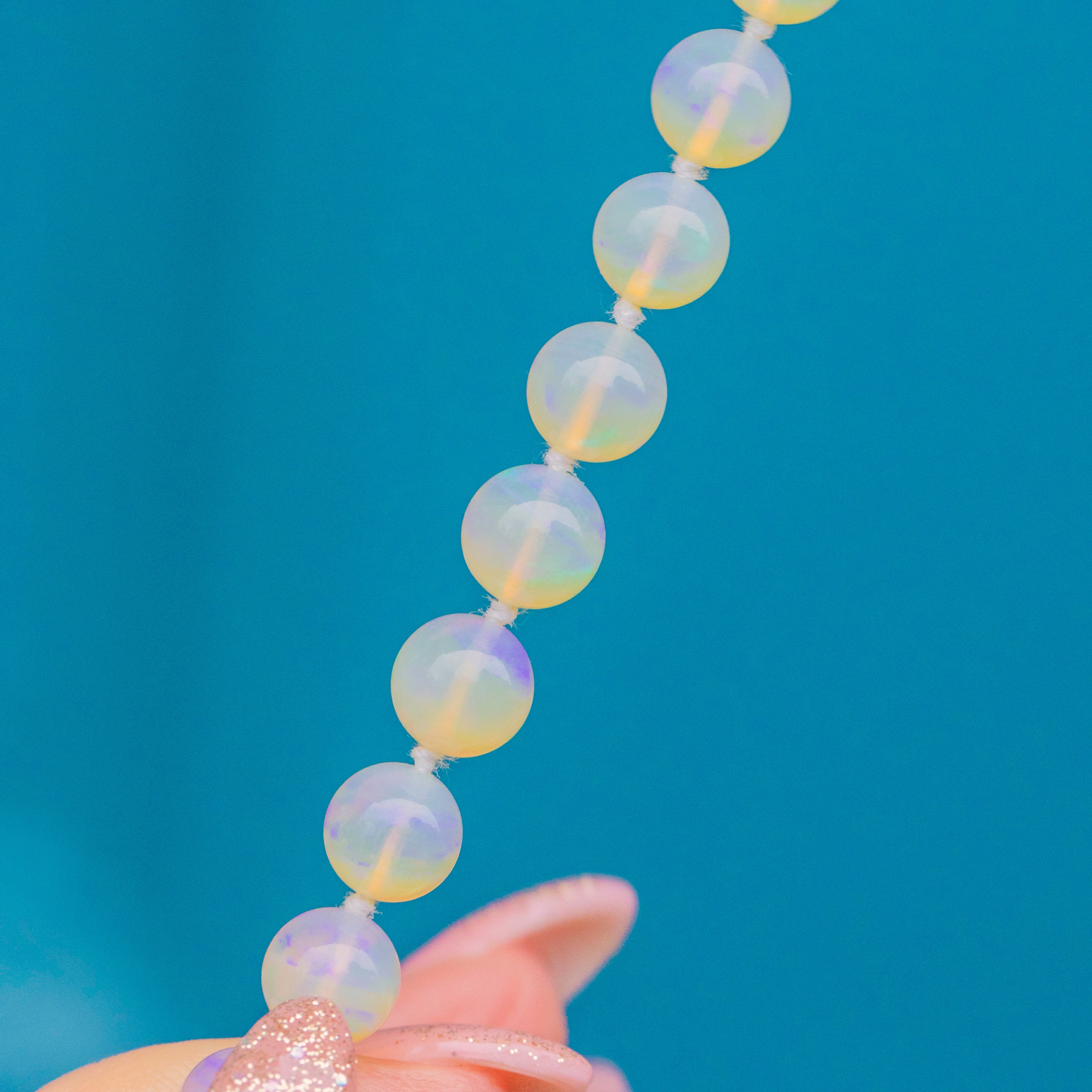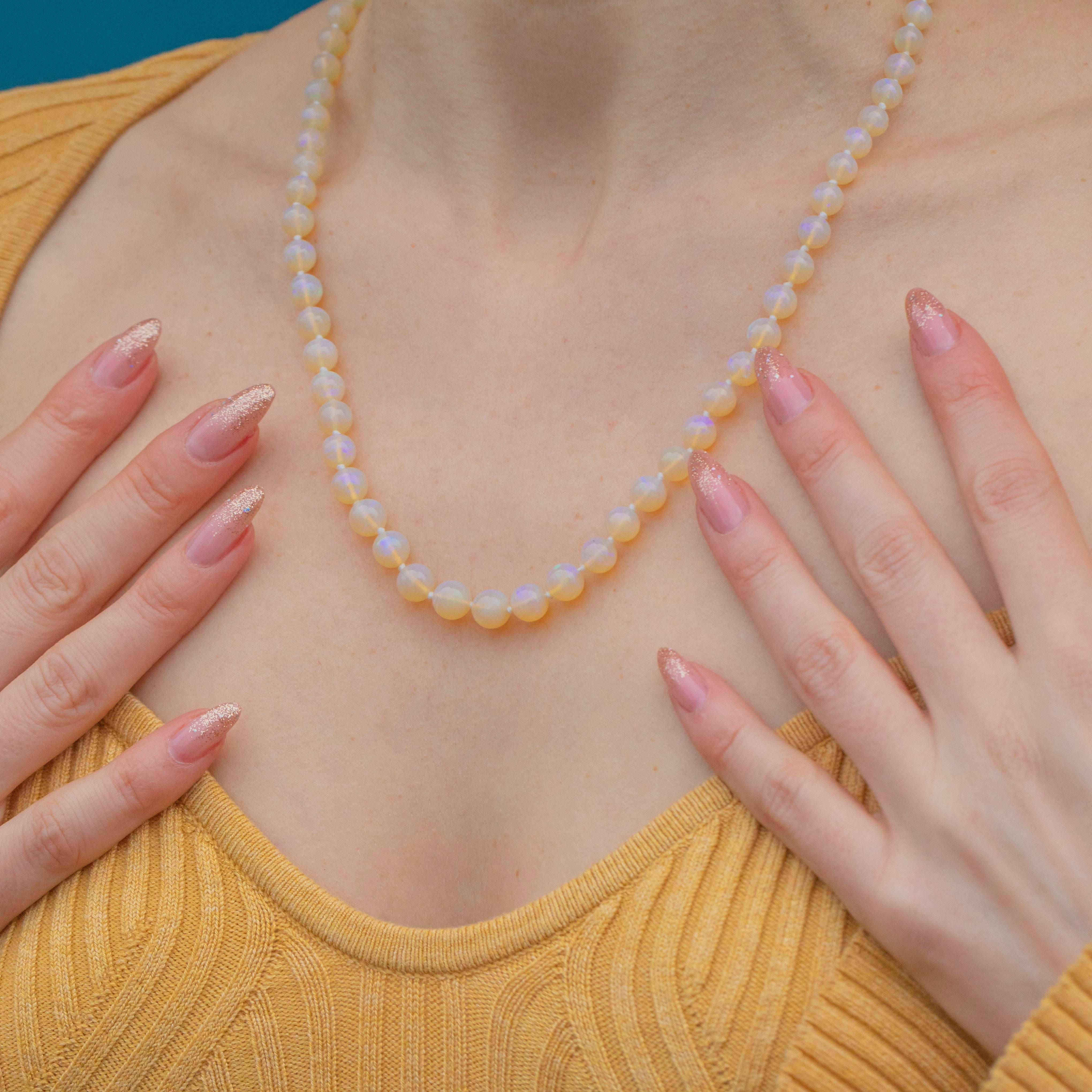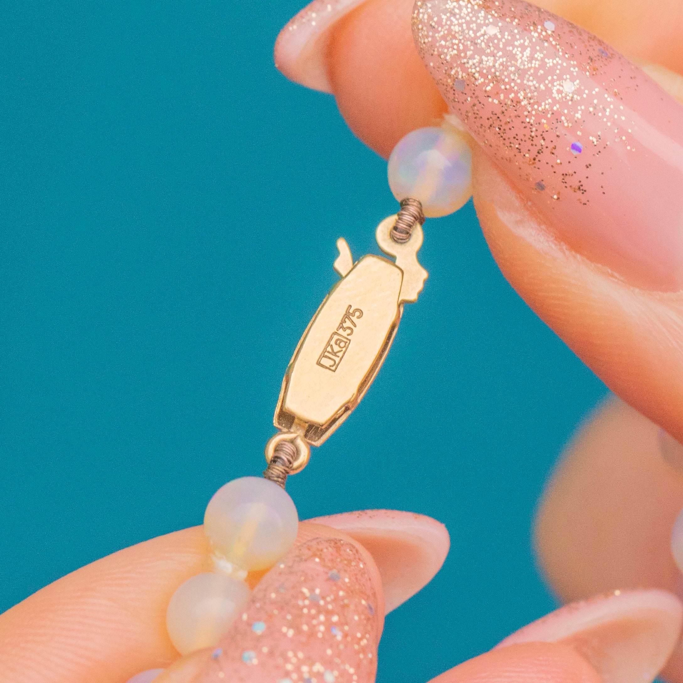 This Art Deco 9ct Gold graduating Opal beaded necklace is just sublime! Formed of graduating galactic orbs, the milky core of her Opals are layered with flashes of vivid green and shimmers of peach running across their smooth surface.