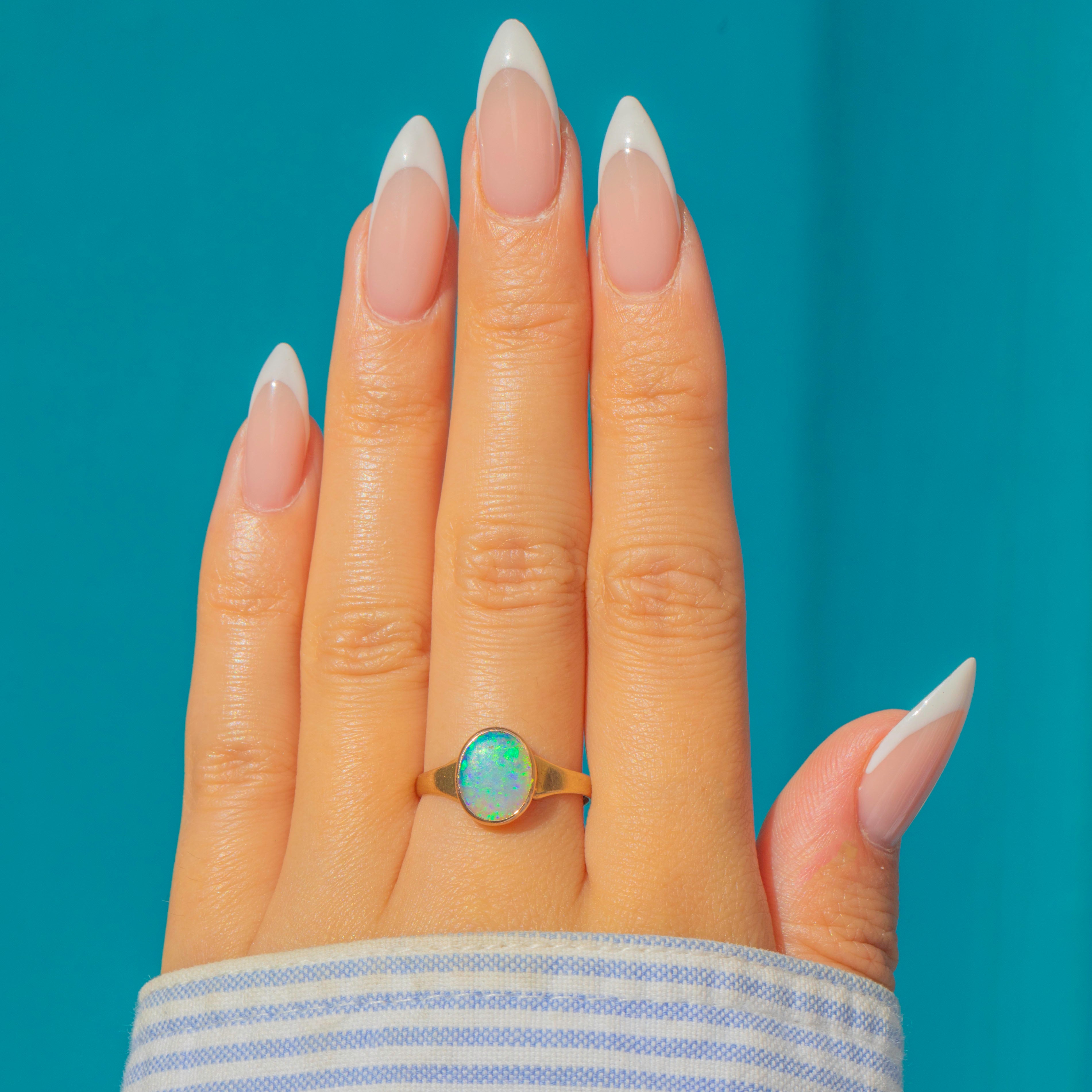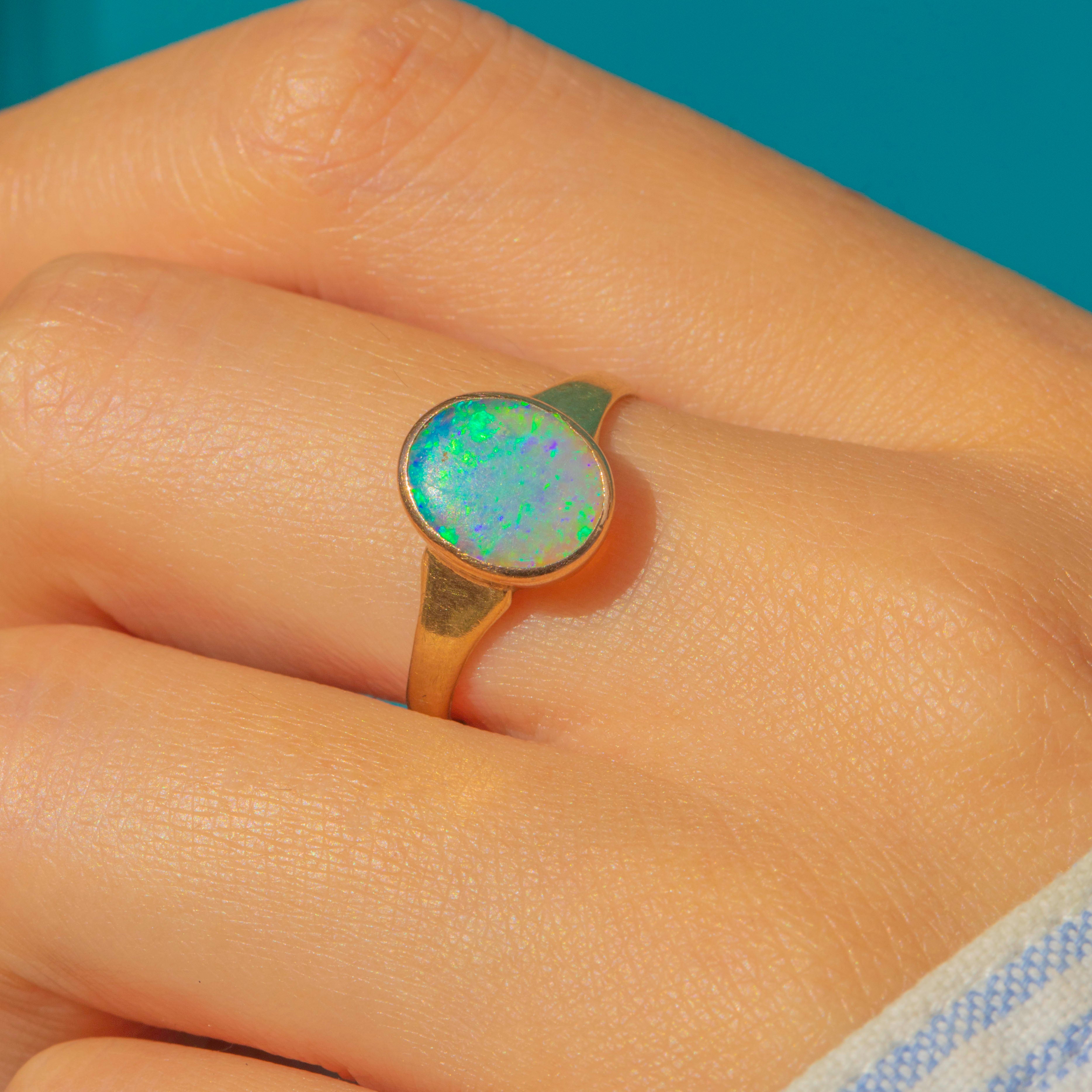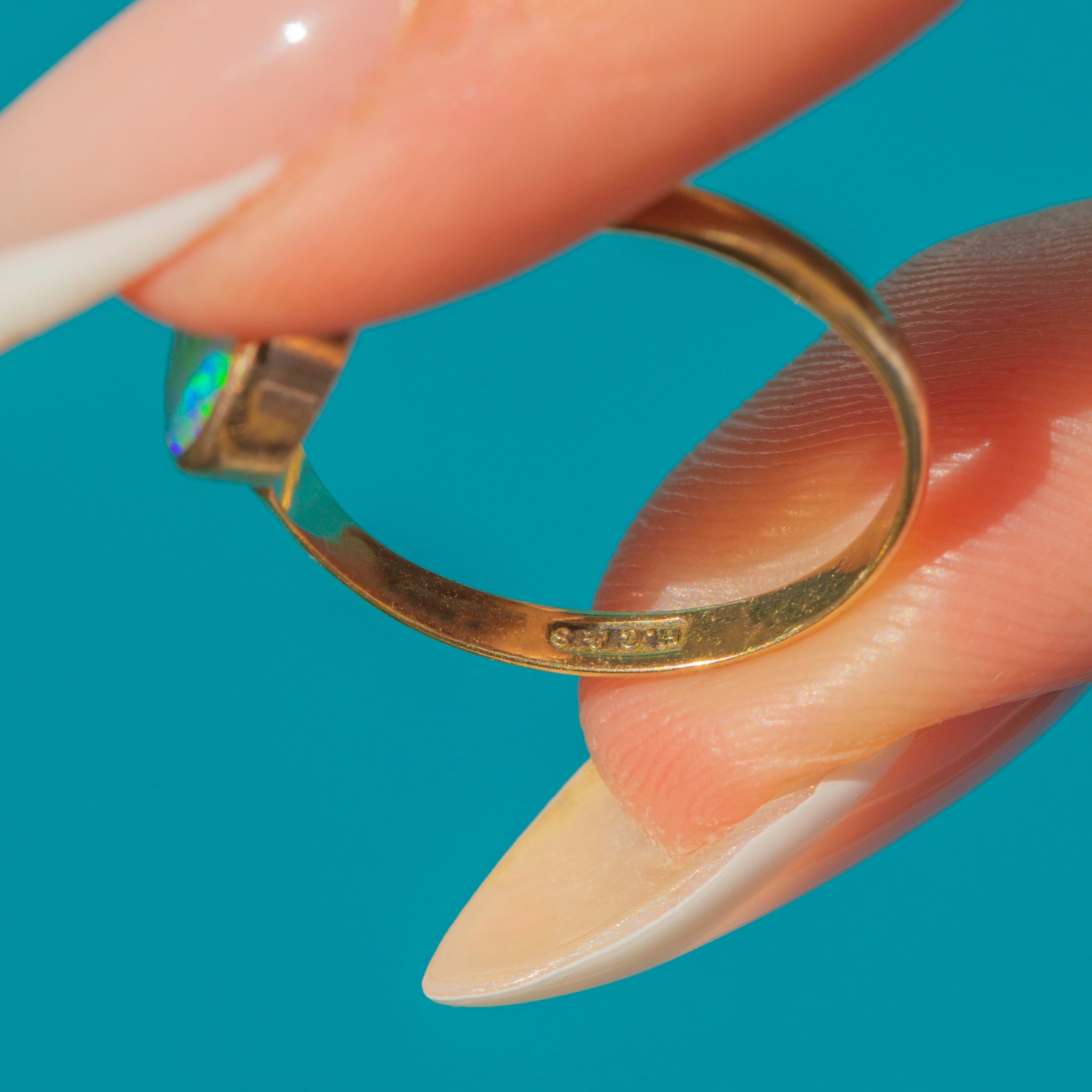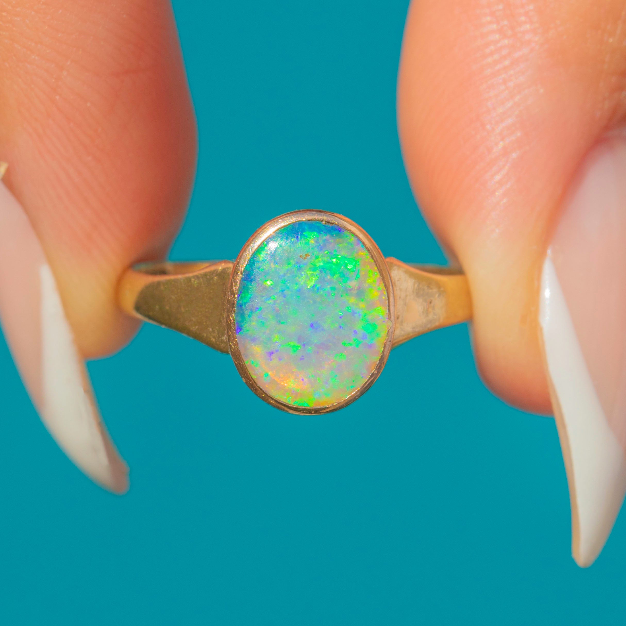 A striking Art Deco Opal ring crafted in 9ct Gold, fully hallmarked for Birmingham 1930. The bezel-set oval cabochon displays a kaleidoscope of neon green, turquoise, lilac and flashes of orange, all shimmering with the magical play of colour for which Opals are so admired.