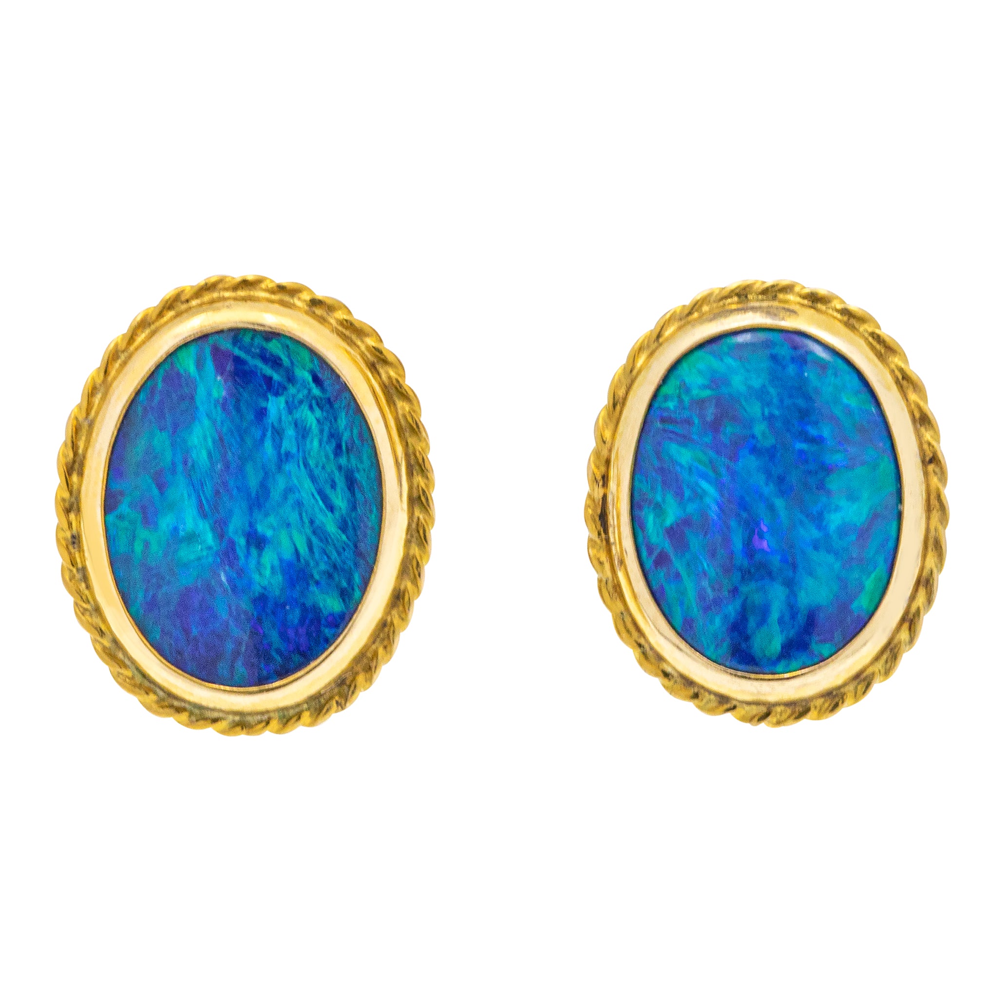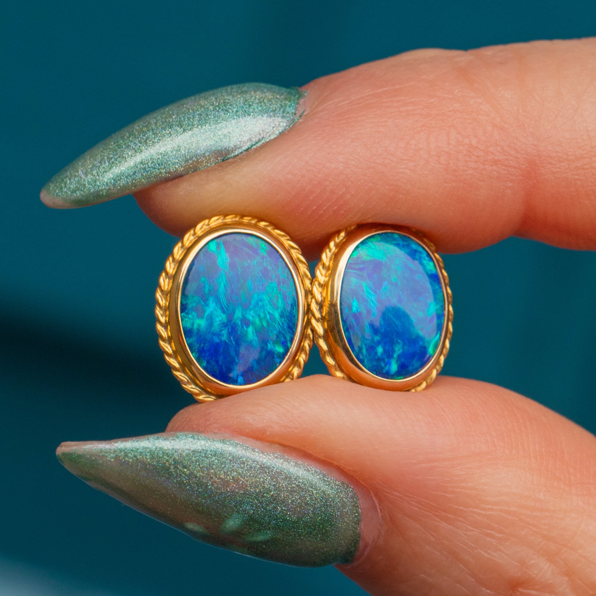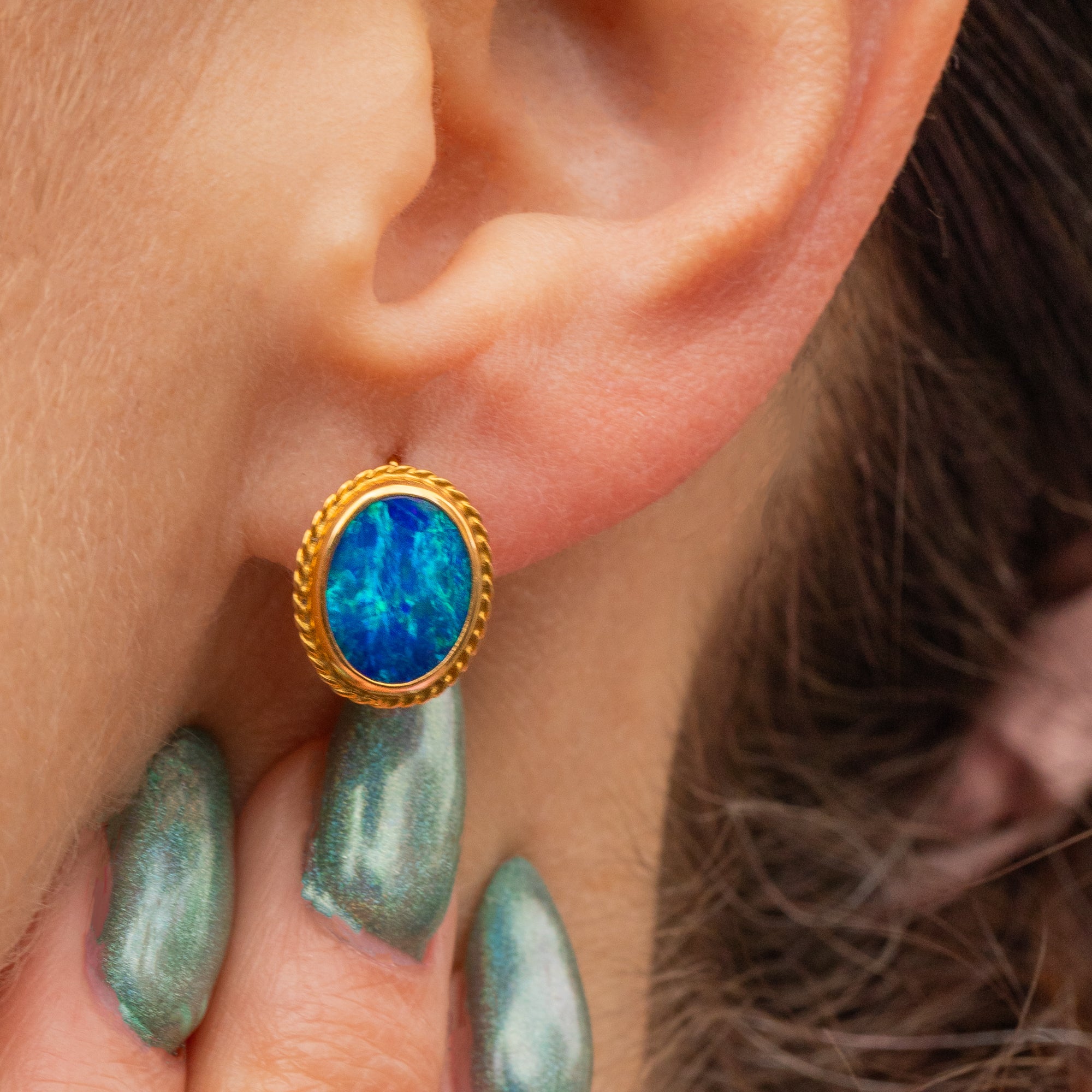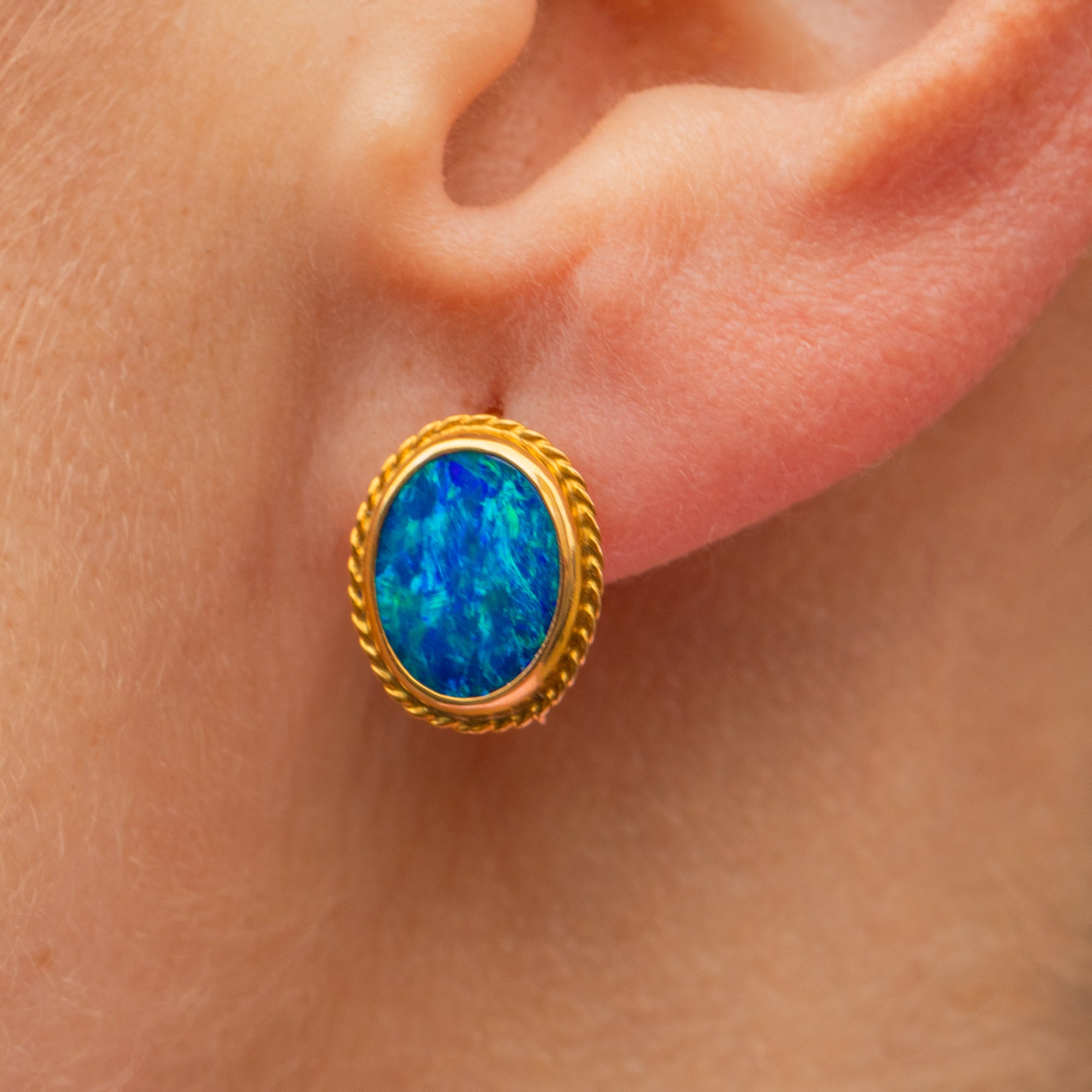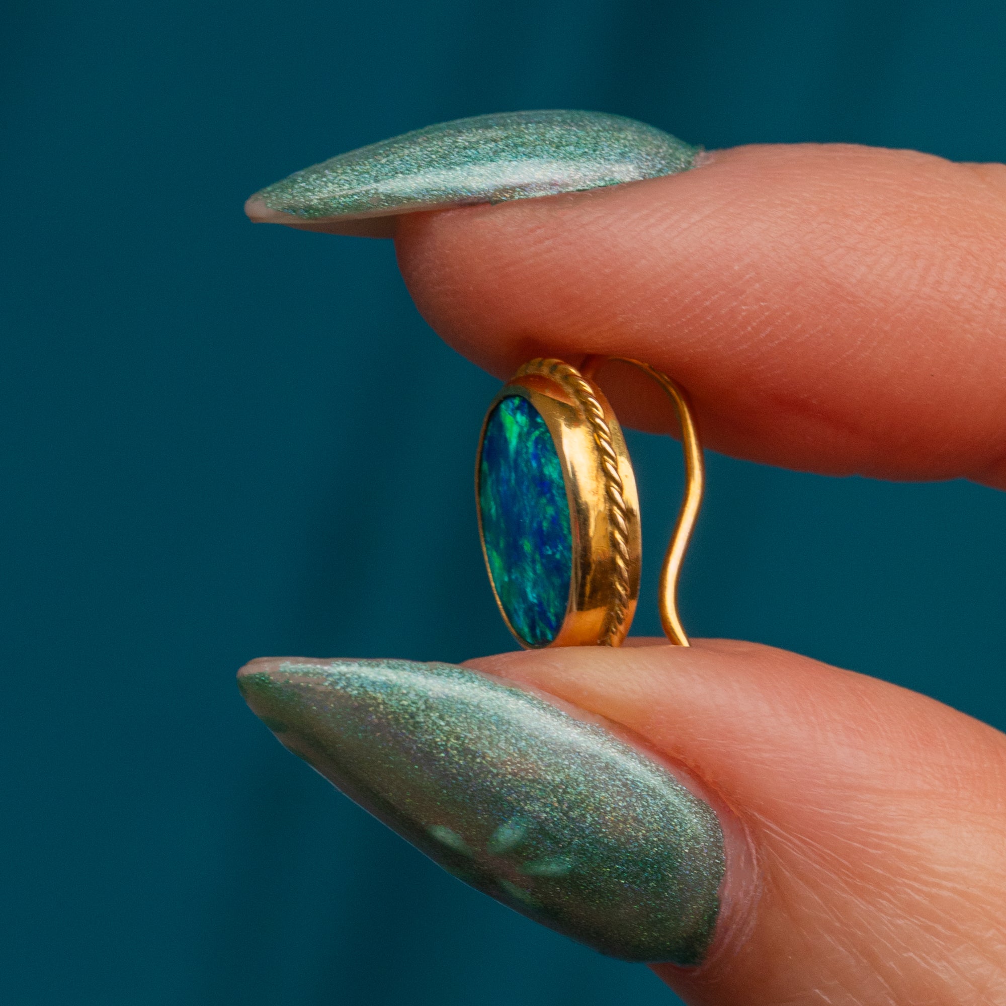 Bordered by rope detailing crafted from buttery 9ct Gold, every millimetre of these antique Opal earrings ooze splendour. Sitting snug in your lobes, these Gold Opal earrings bring the pop of colour our earring stack has been looking for.