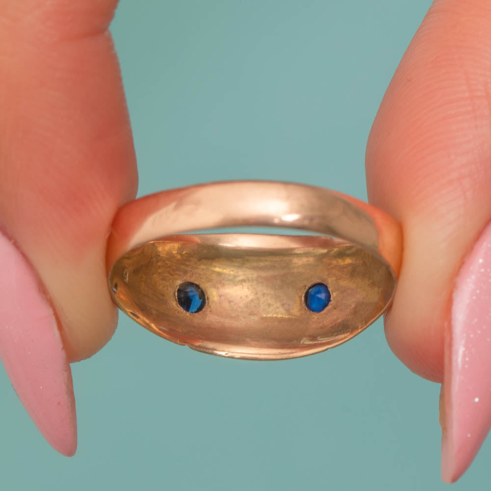 VERY GOOD-EXCELLENT: This antique 9ct Gold Sapphire and Pearl gypsy ring is in very good-excellent condition. Each of her gemstones is lustrous and set securely. The Gold is glossy and though she has some minor surface wear and evidence of a previous resize, this is not noticeable when wearing. The hallmarks are crisp and fully legible, allowing us to accurately date her to 1922!
