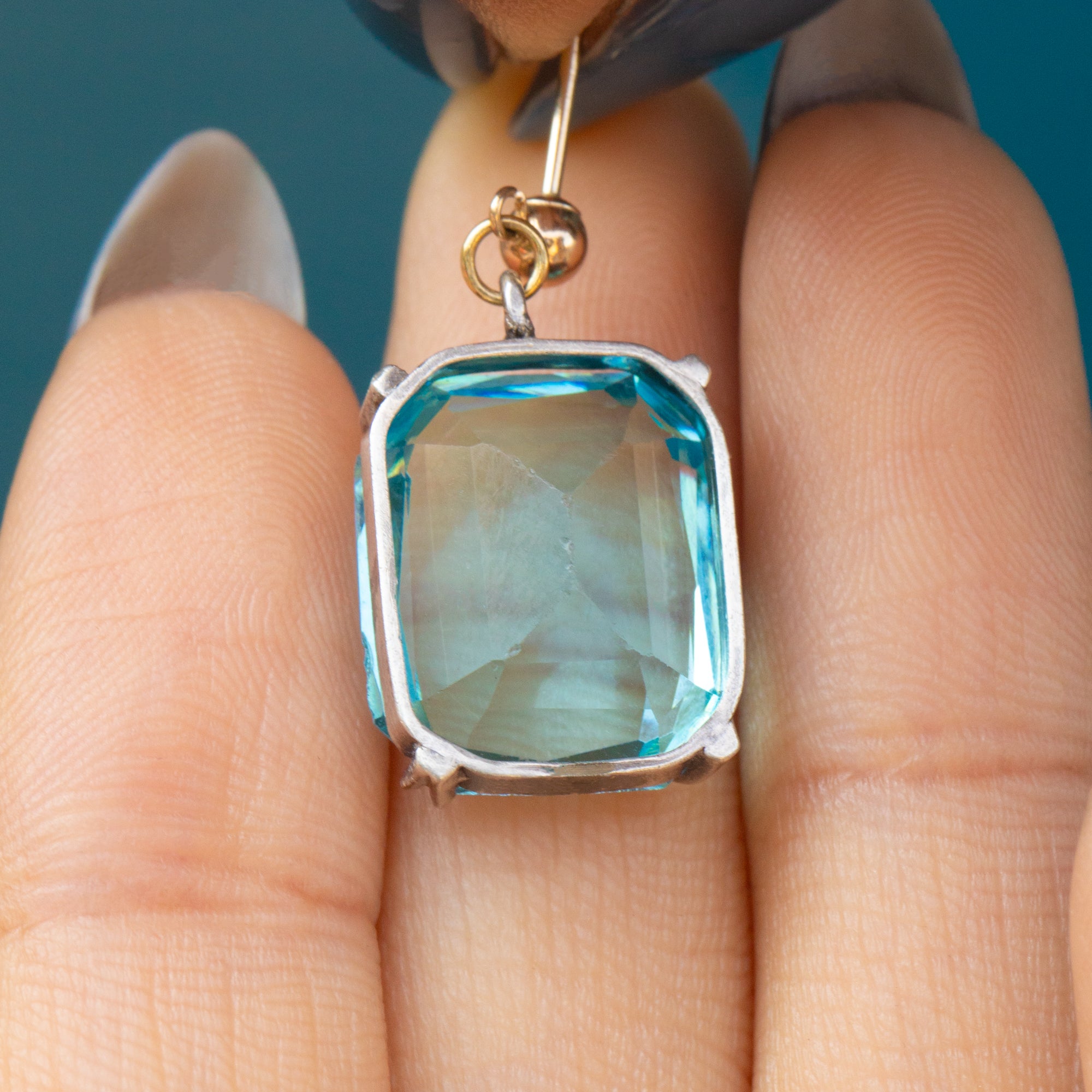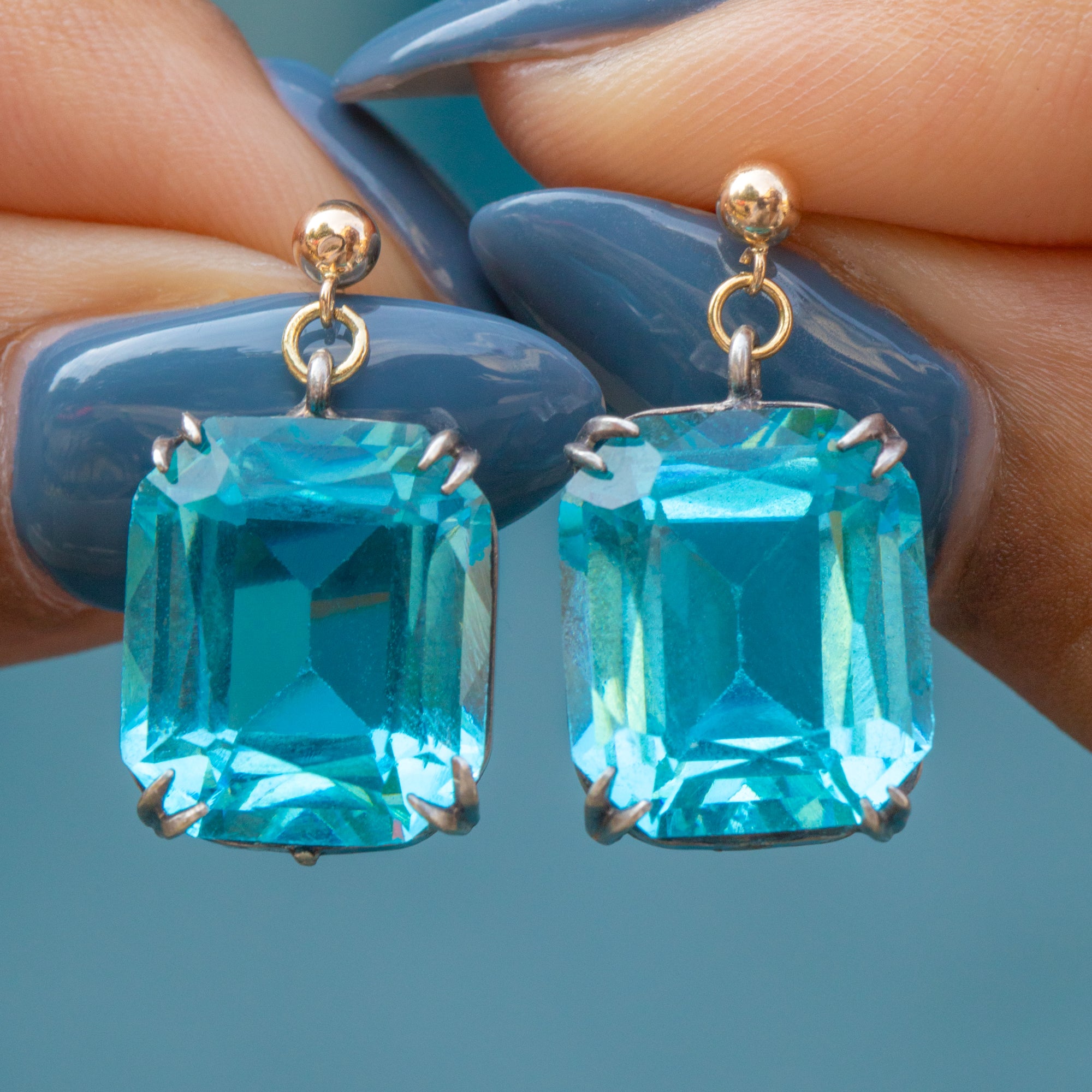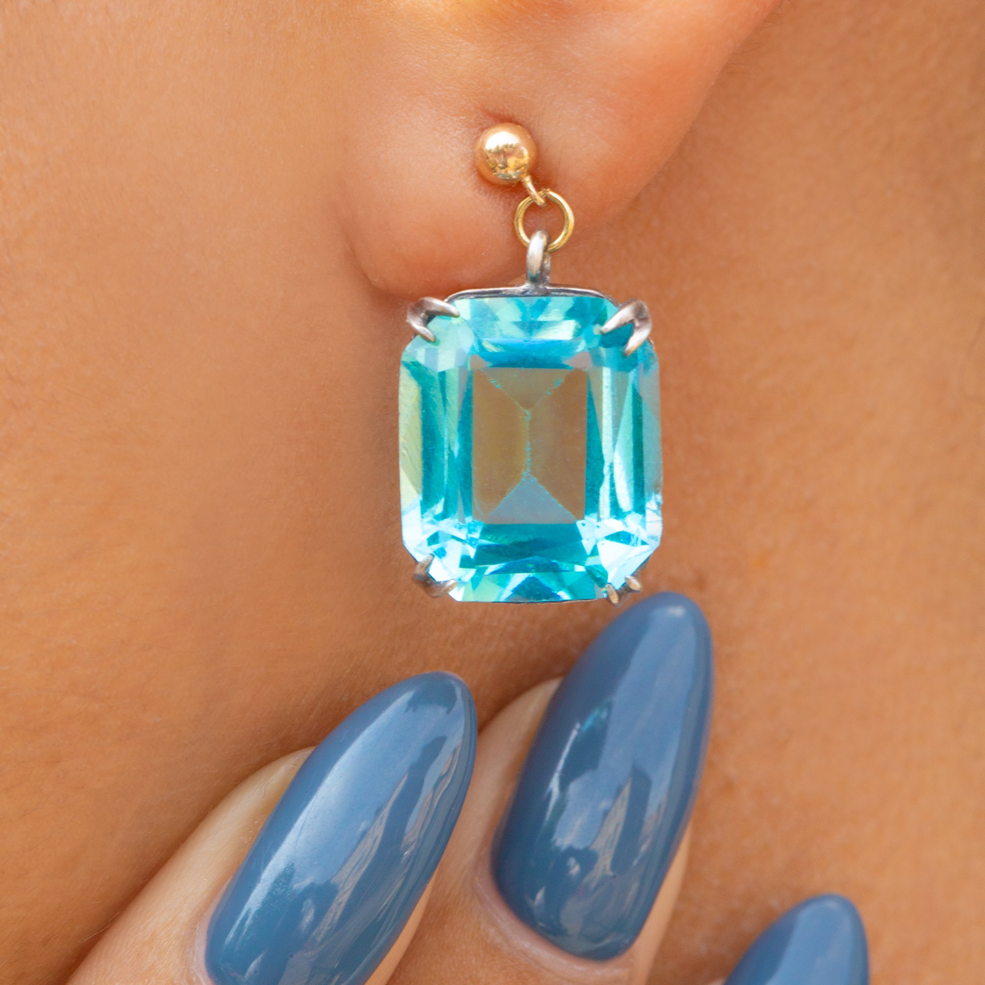 These antique earrings give the illusion of authentic blue Topaz gemstones, little will anyone know they are a high-quality Paste gem! Complete with 9ct Gold posts that slot into the ear beautifully, these Art Deco earrings will add a welcome pop of colour to your lobes!