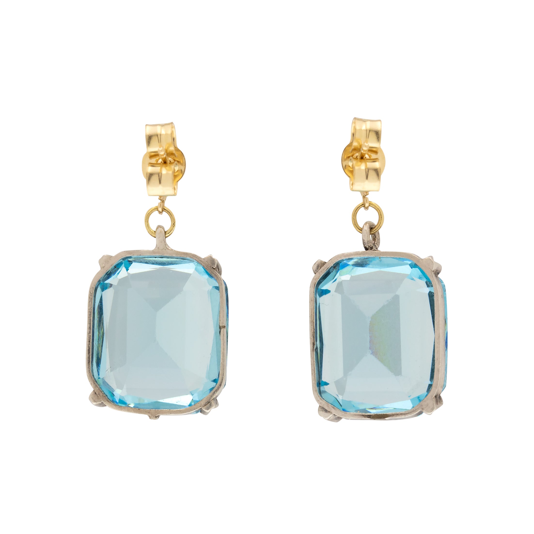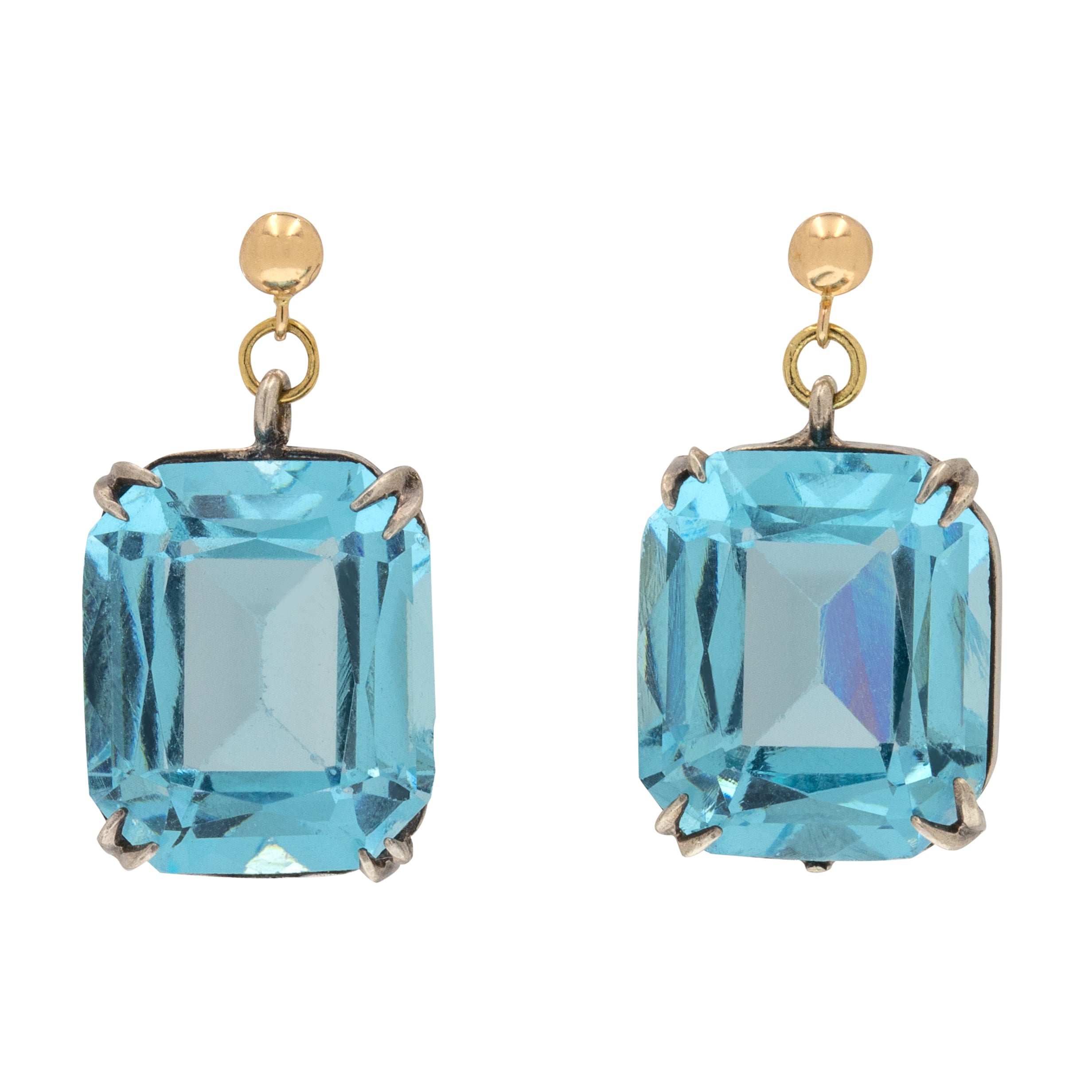 EXCELLENT. These Art Deco blue Paste earrings are in excellent condition! The Paste gems are securely set into Silver, with 9ct Gold posts that allow you to wear them comfortably. The Paste gems are crisp and free from chips or abrasions. There are some marks on the base of each earring from a previous conversion, but these aren't noticeable while the earrings are worn.