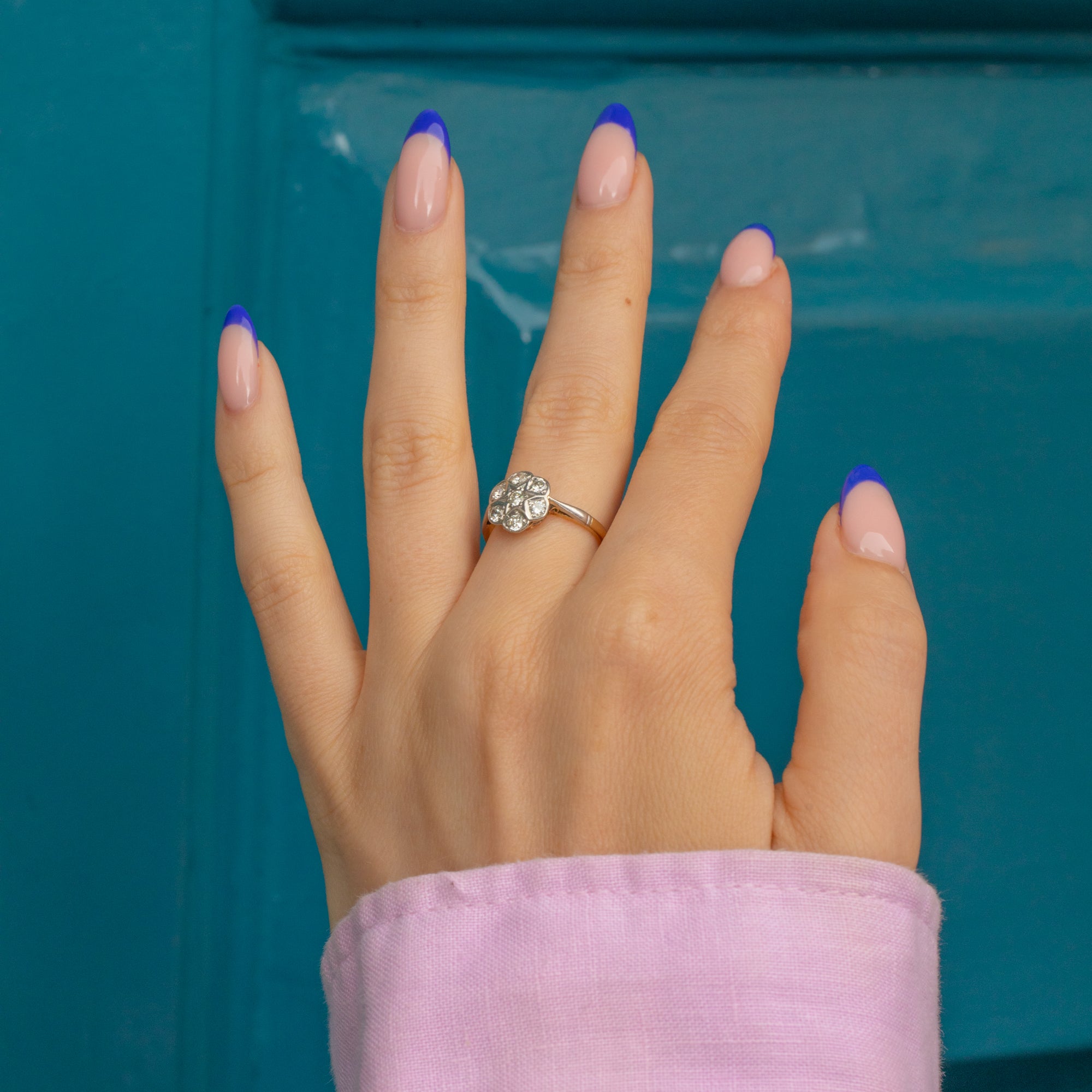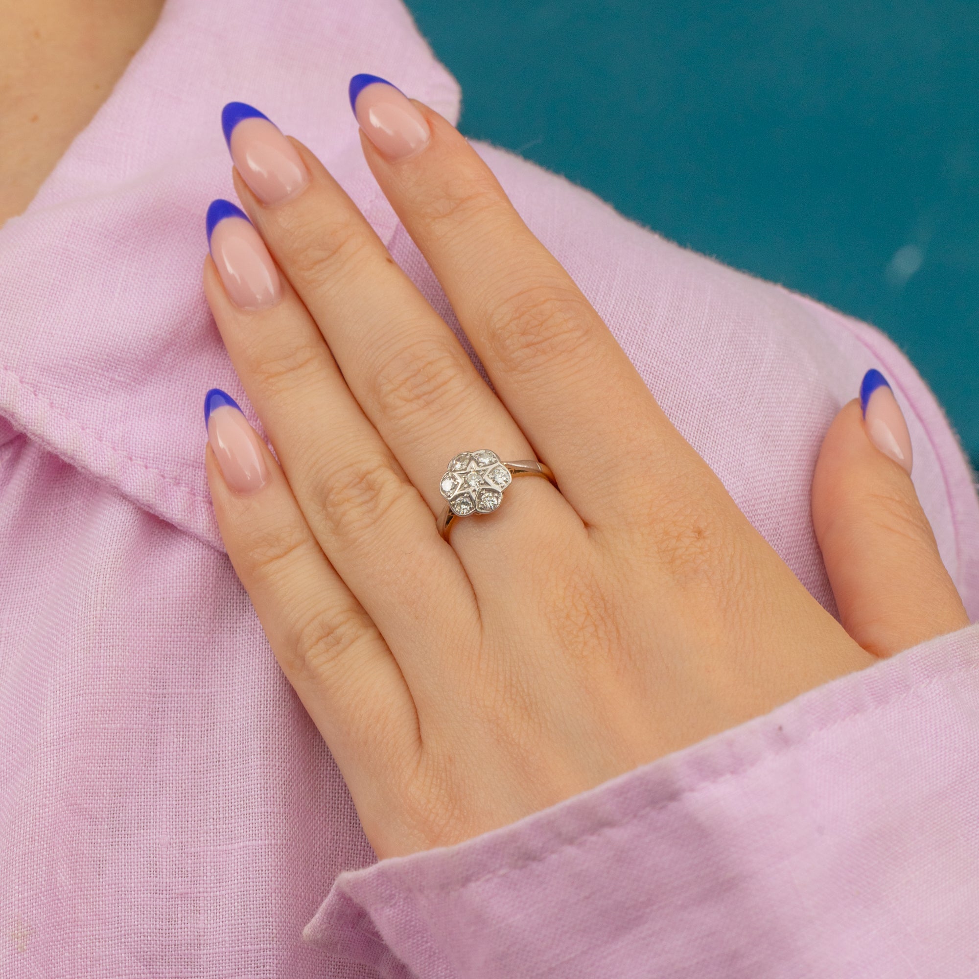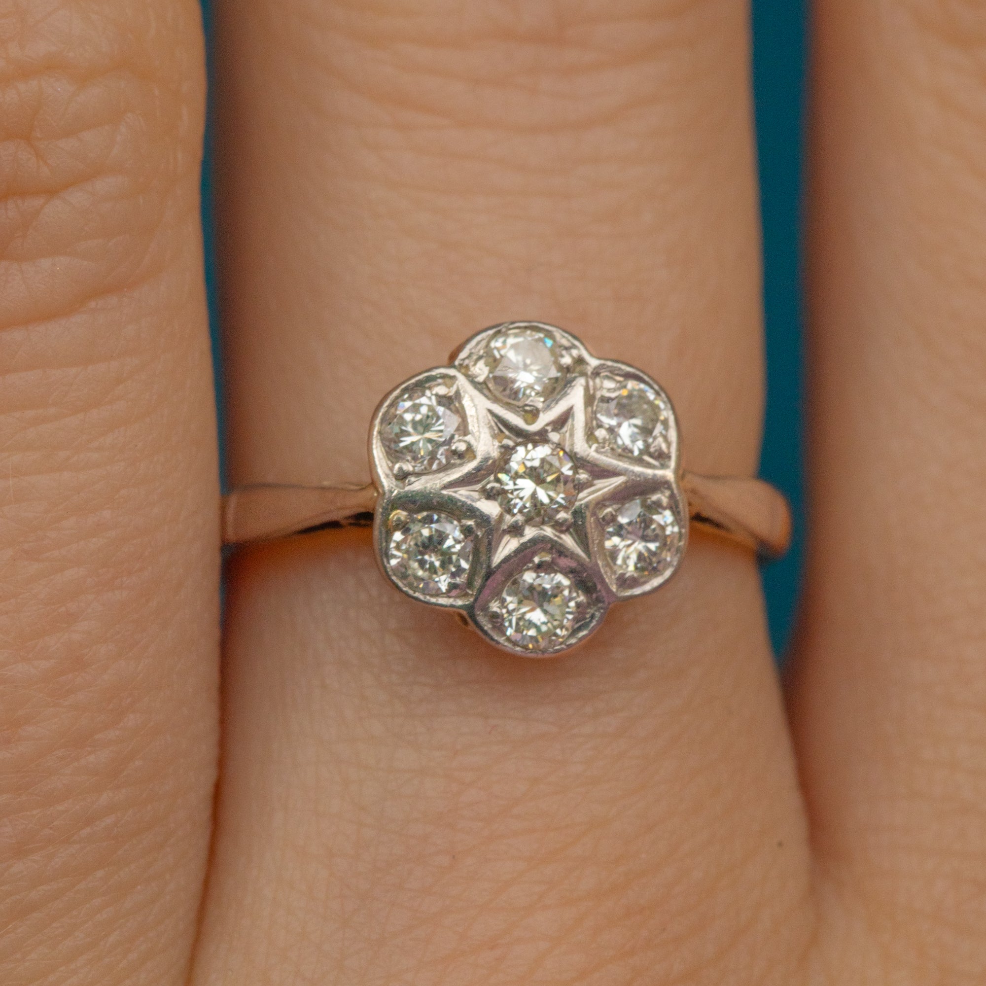 This 18ct Gold Art Deco Diamond daisy cluster ring is feminine and timeless. A pretty Diamond ring like this would be the perfect choice for a unique engagement ring, taking on a form of which you could never tire- a beautiful flower whose bloom will be everlasting!