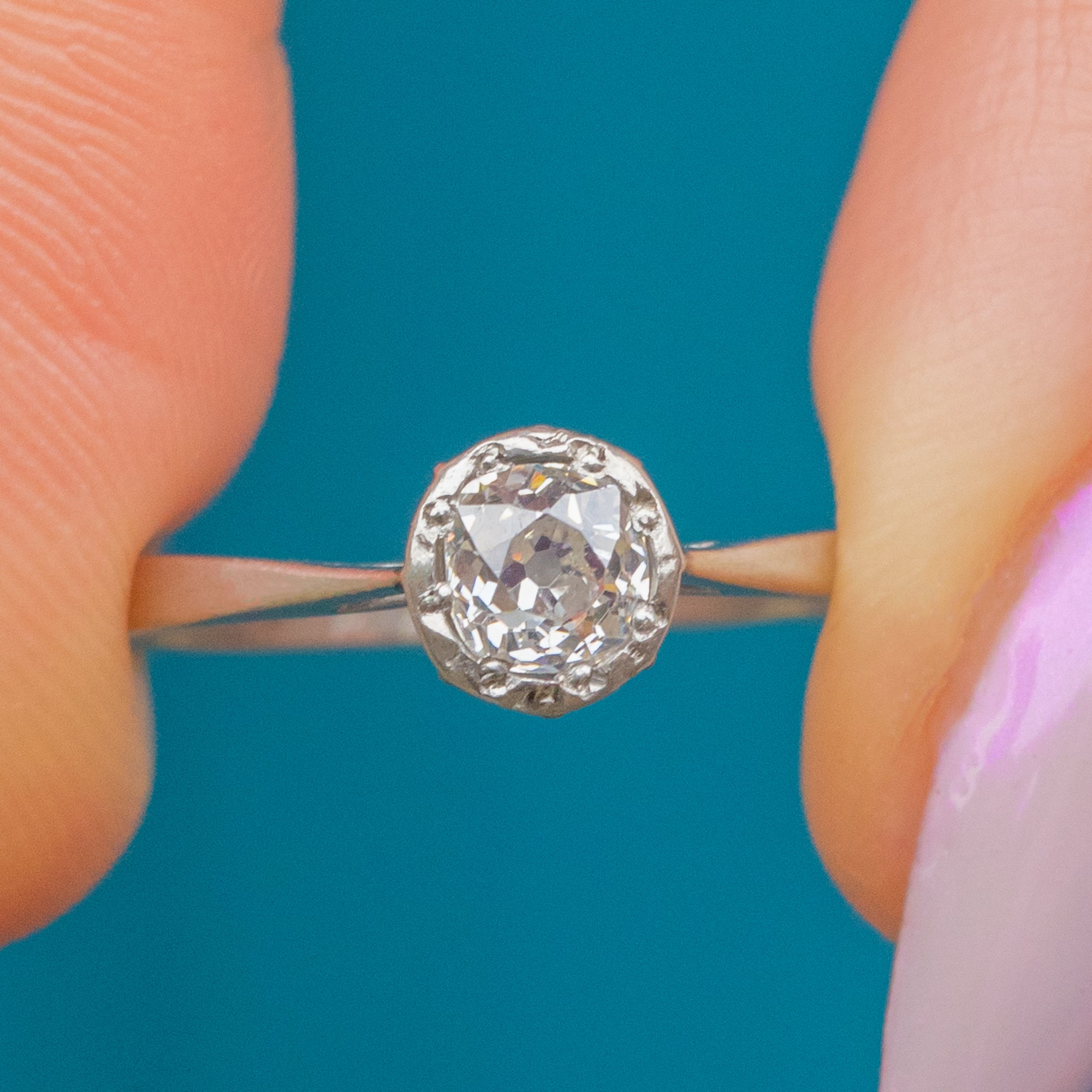 Stamped “PLATINUM” inside the band, this classic engagement ring exudes understated sophistication. Its cool, silvery tone and enduring design make it an ideal choice for those who appreciate vintage craftsmanship and everlasting style.