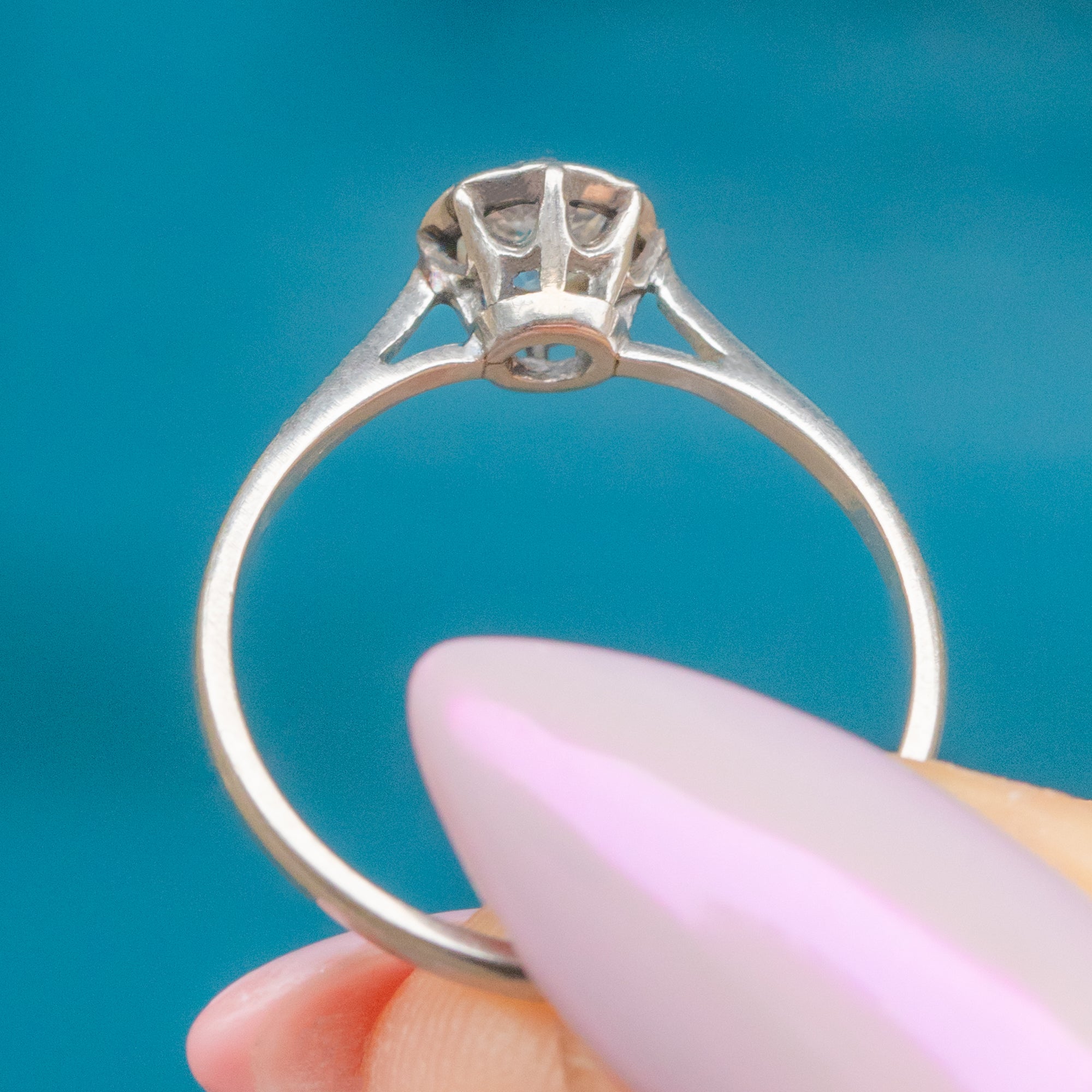 A timeless Art Deco Platinum solitaire ring set with a sparkling 0.40ct Diamond, full of life and fire. The clean, minimal lines and elegant proportions perfectly capture the refined simplicity of the 1920s, allowing the beautiful old-cut Diamond to take centre stage.