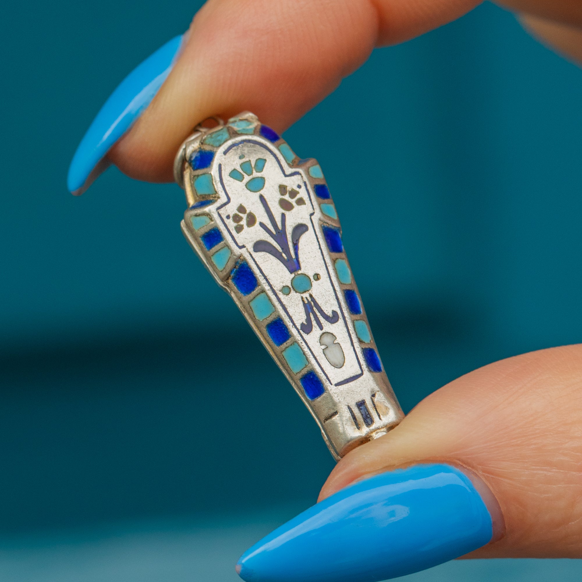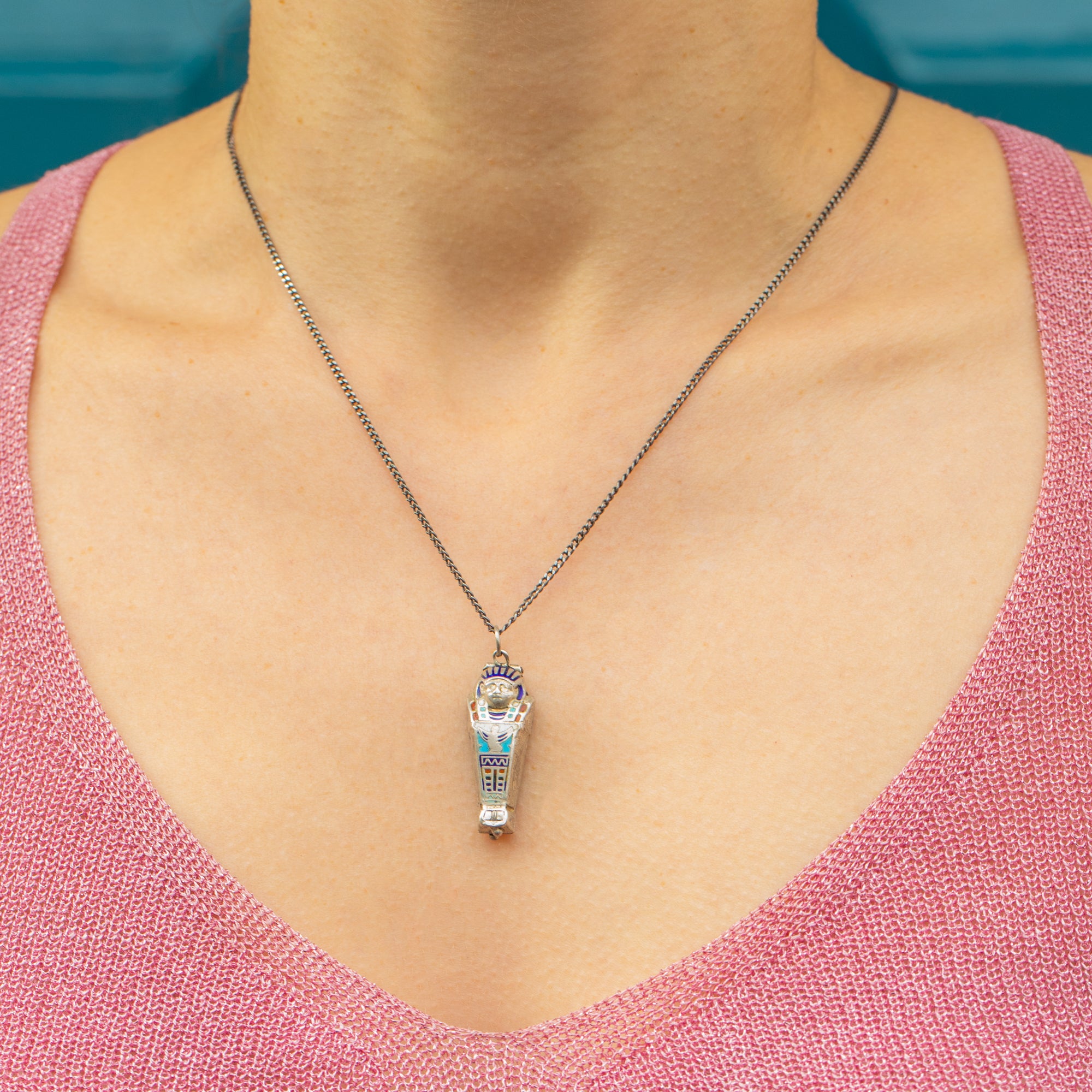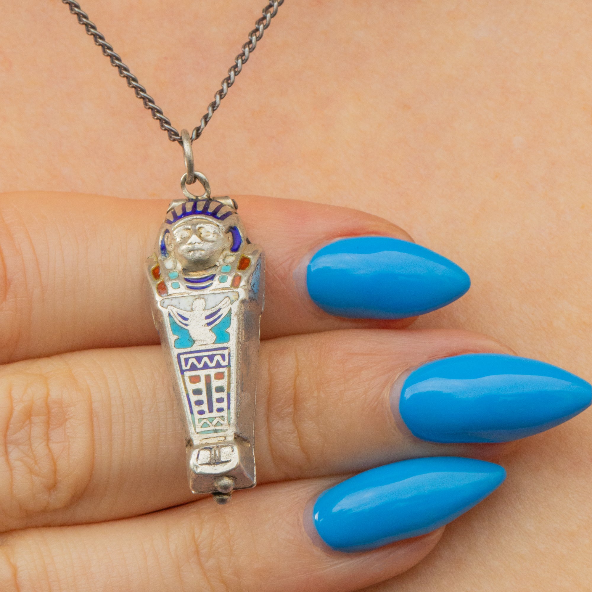 EXCELLENT. This Art Deco Egyptian Revival Silver Sarcophagus pendant is in excellent condition. The sarcophagus pendant has a stunning Enamel exterior and a mummy on the inside, which a lot of these revival pieces don't retain! We think this is a gorgeous piece, and quirky at that, which your collection needs.