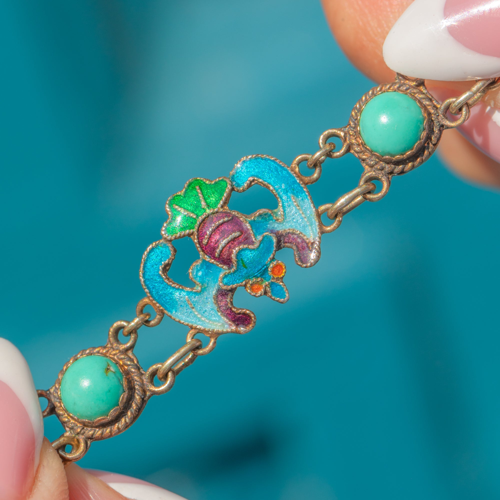 This charming Art Deco bracelet features a series of enamel bat motifs, accented by vivid turquoise cabochons.