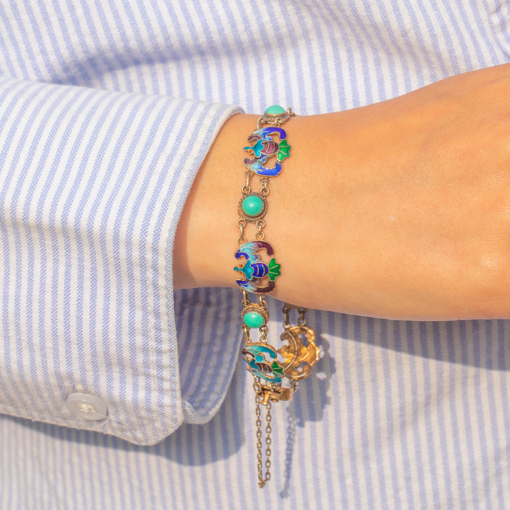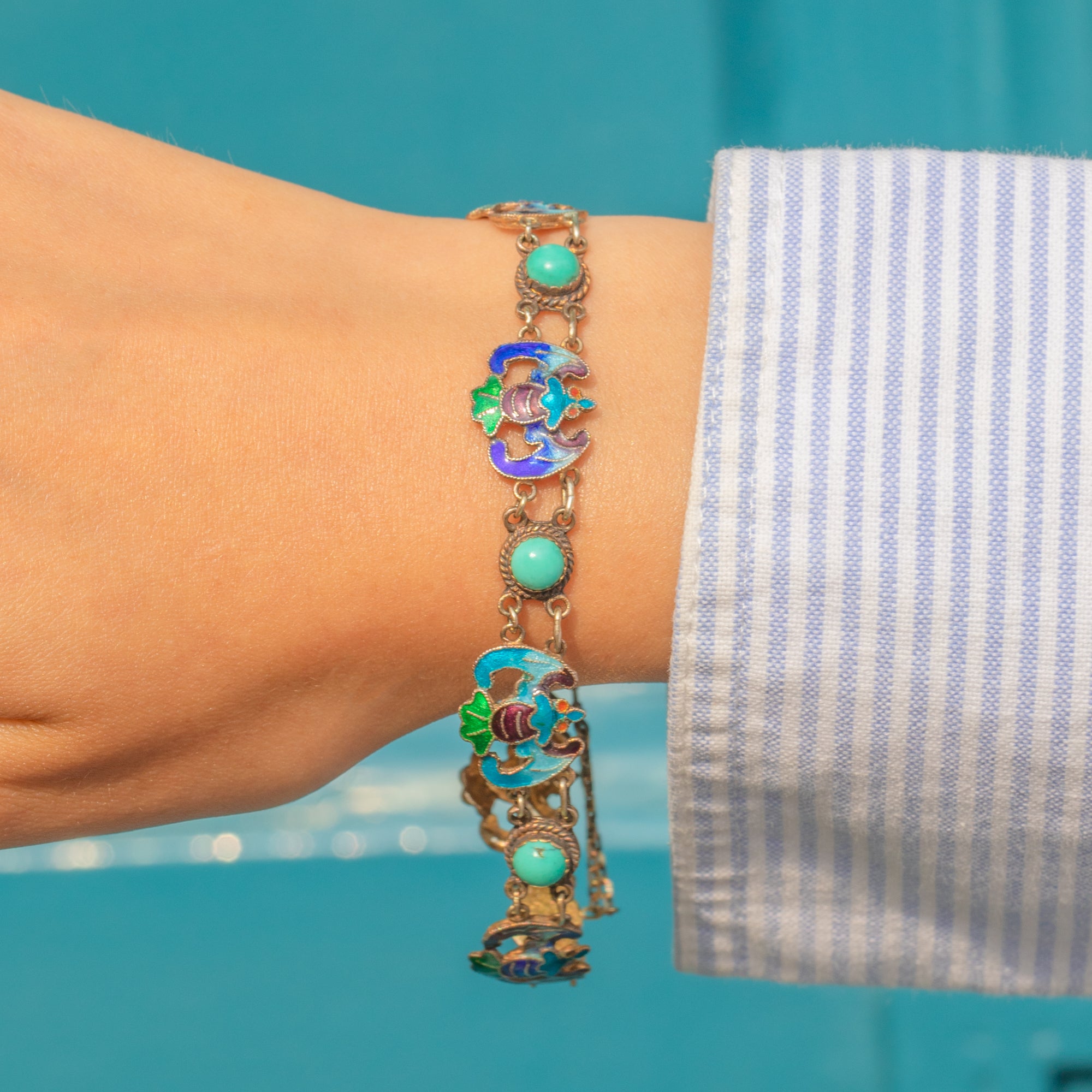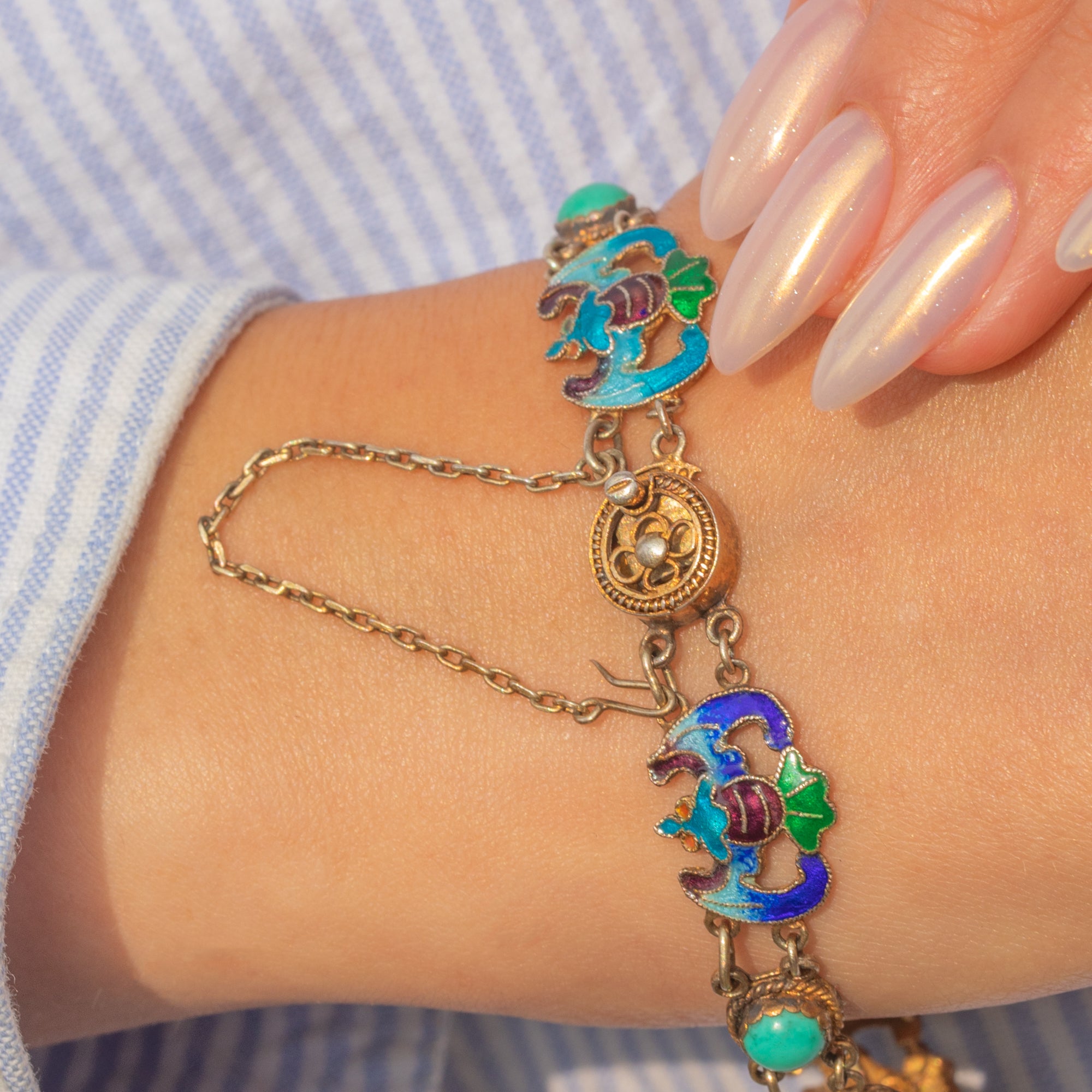 EXCELLENT: The enamel and Turquoise stones are perfect with no visible chips or damage. The gilding has worn slightly over the years but retains a warm golden tone, and the bracelet has been well cared for, presenting beautifully overall.