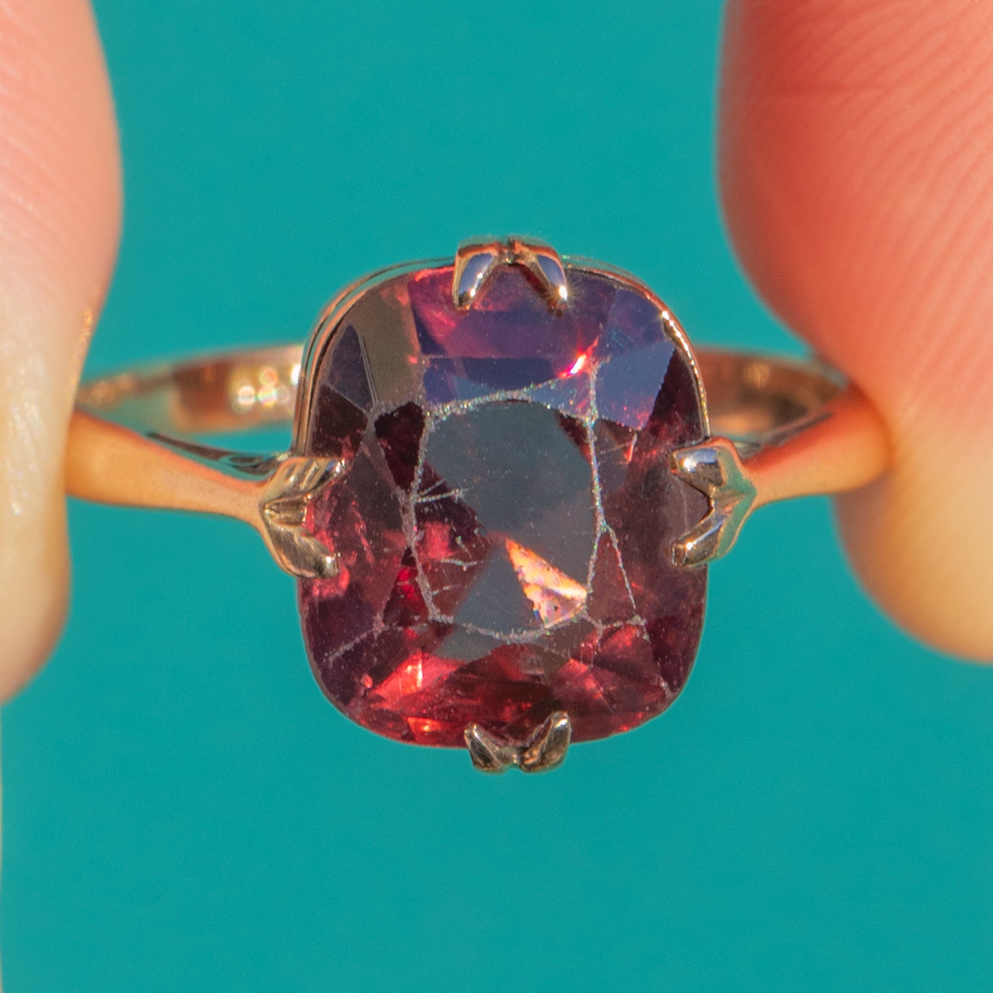 Art Deco Era 9ct Gold Garnet Cushion Solitaire Ring 3.40ct