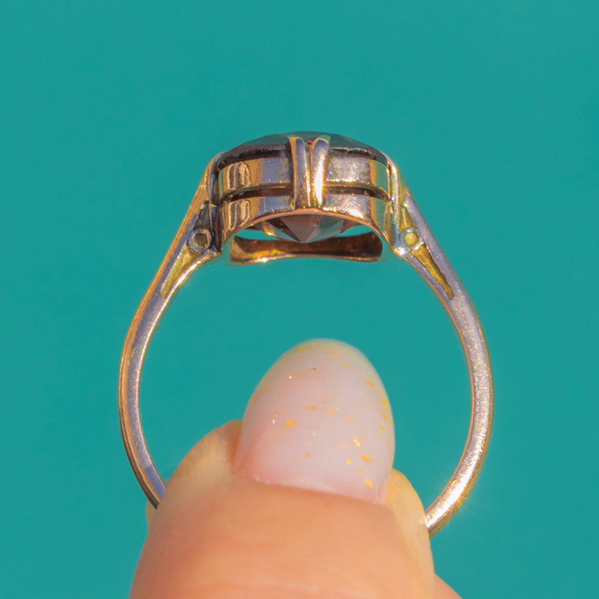 A classic Art Deco solitaire, this 9ct Gold ring showcases a sumptuous deep purple/ Madeira wine coloured cushion-shaped Garnet in a clean and open claw basket. The minimalist silhouette  and pretty double-claw settings let the gemstone take centre stage, its rich hue glowing beautifully against the warm Gold.