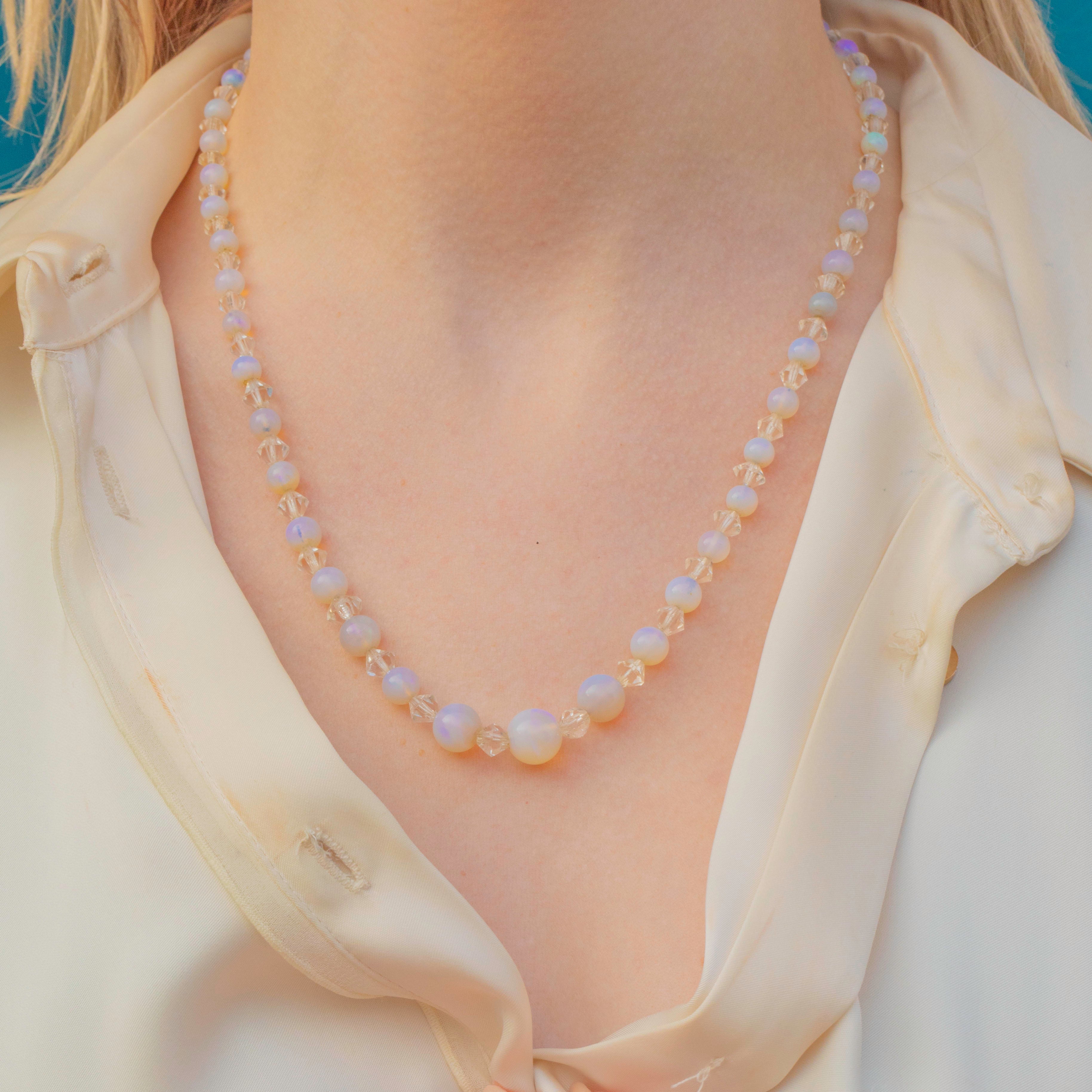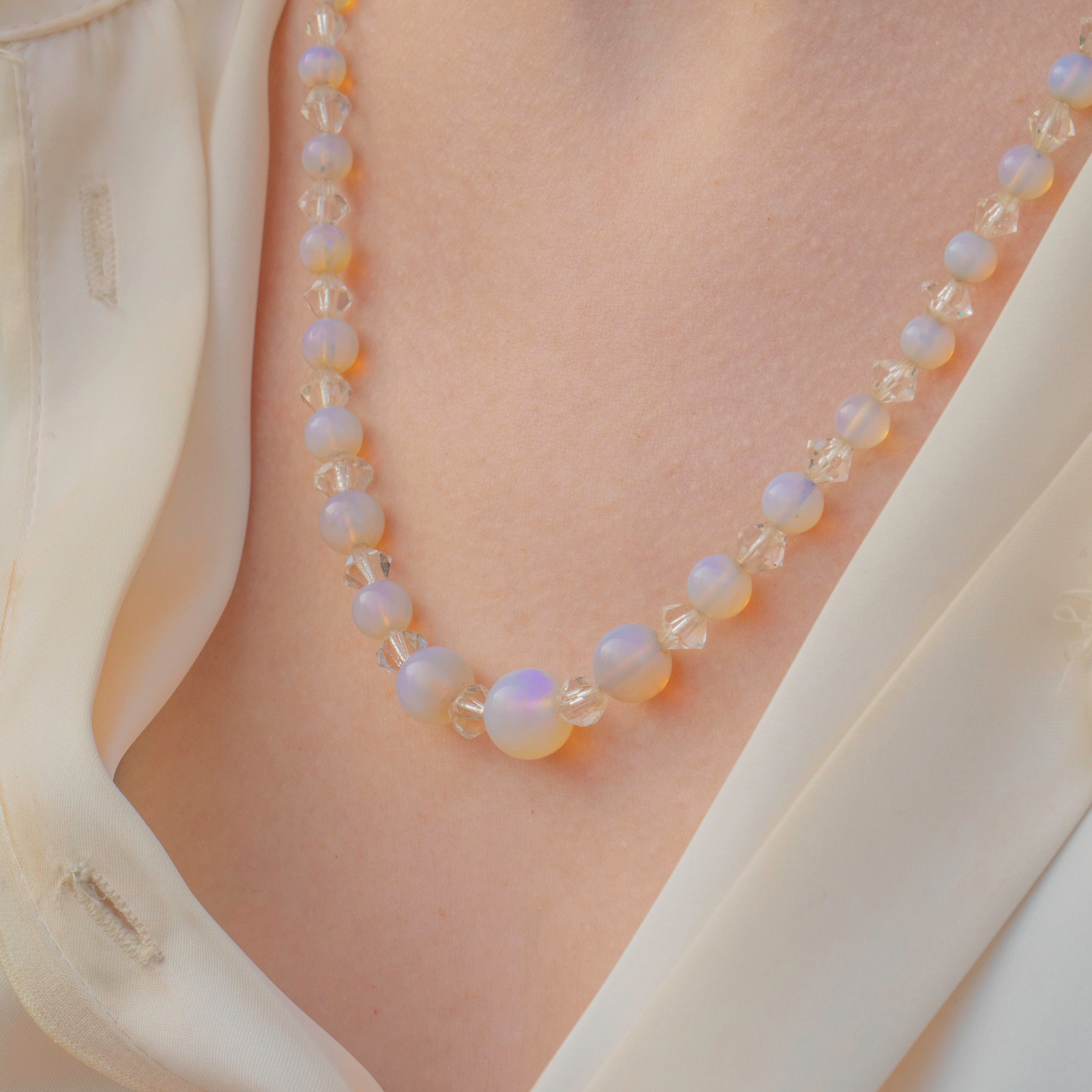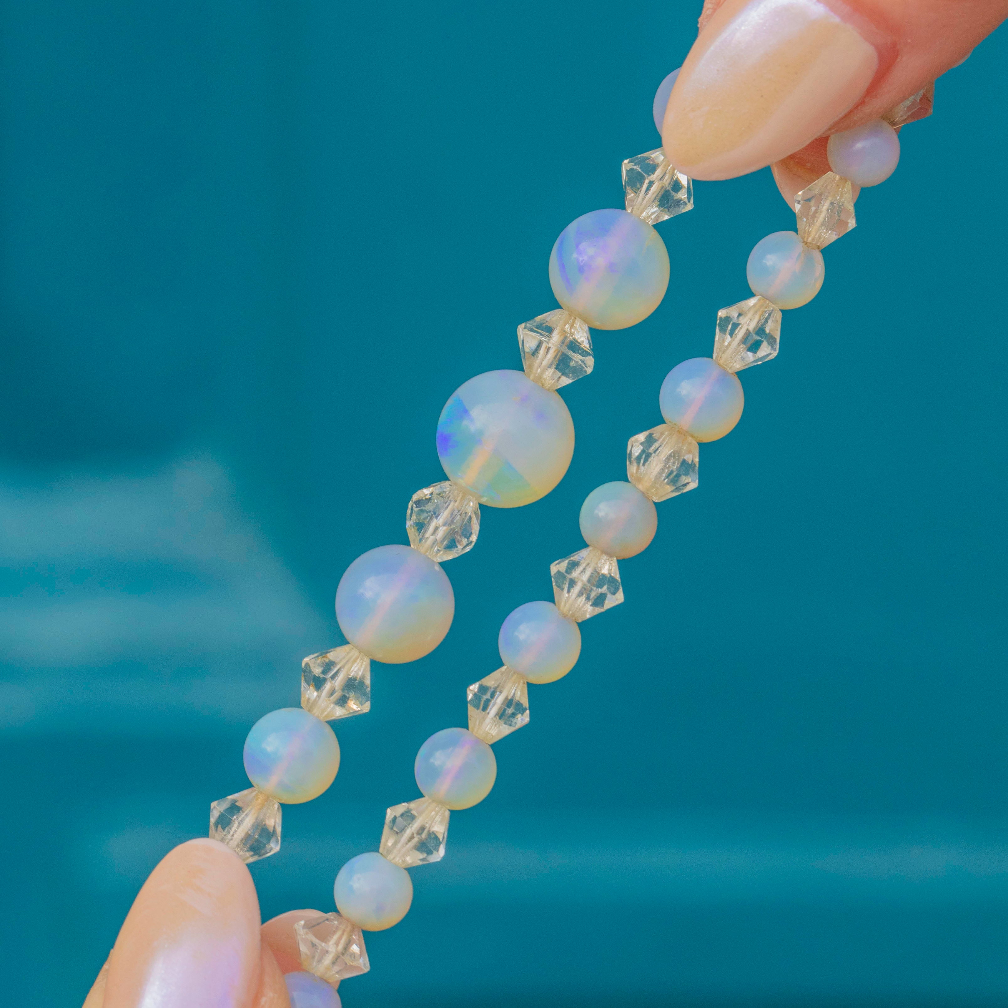 We simply adore this Art Deco graduated Opal beaded necklace! As though plucked from outer space, her spherical Opal beads flash with electric blues and peachy pinks, with alternating faceted Paste gemstones for an extra touch of glamour.