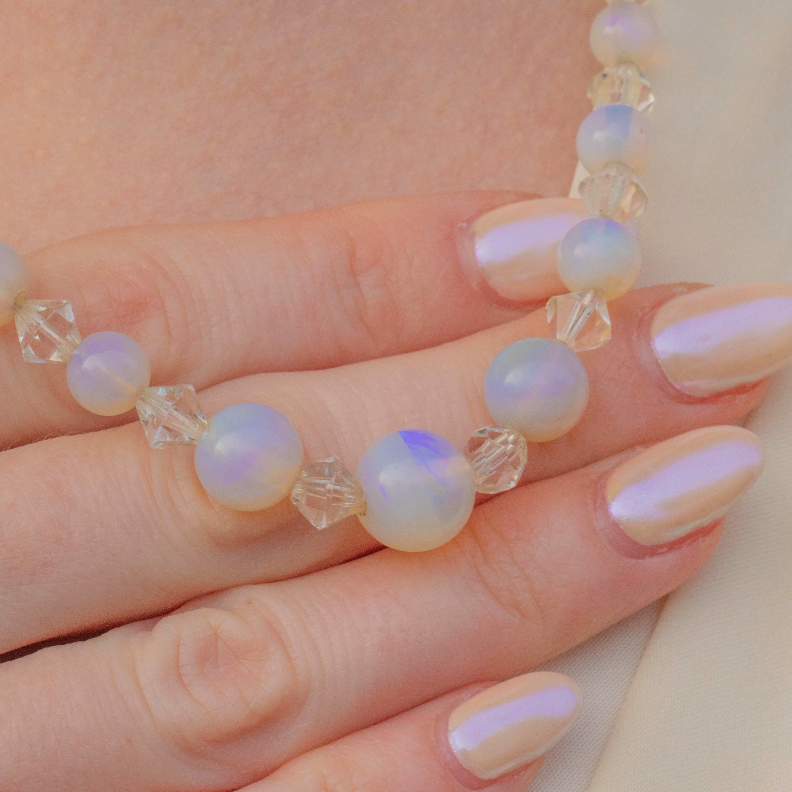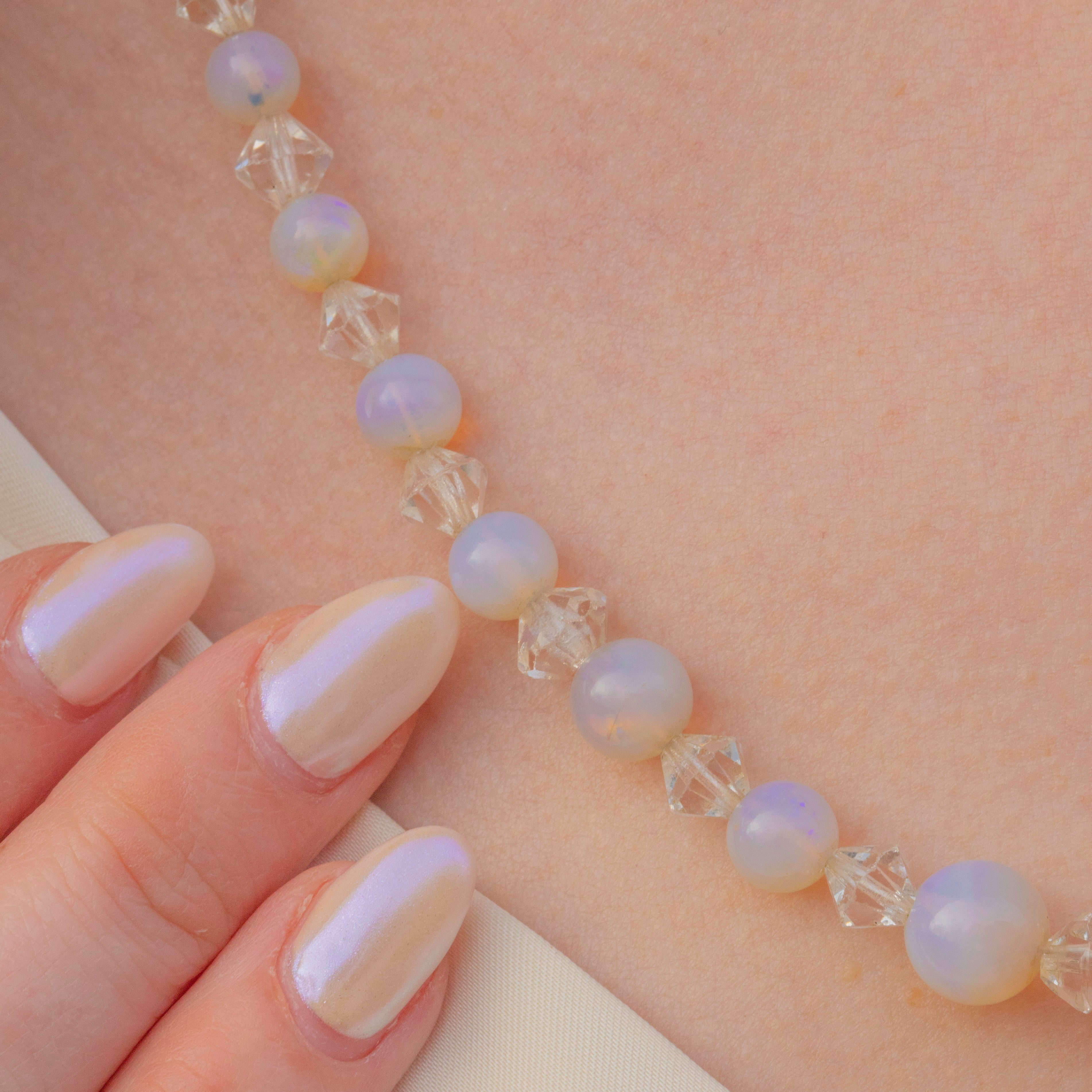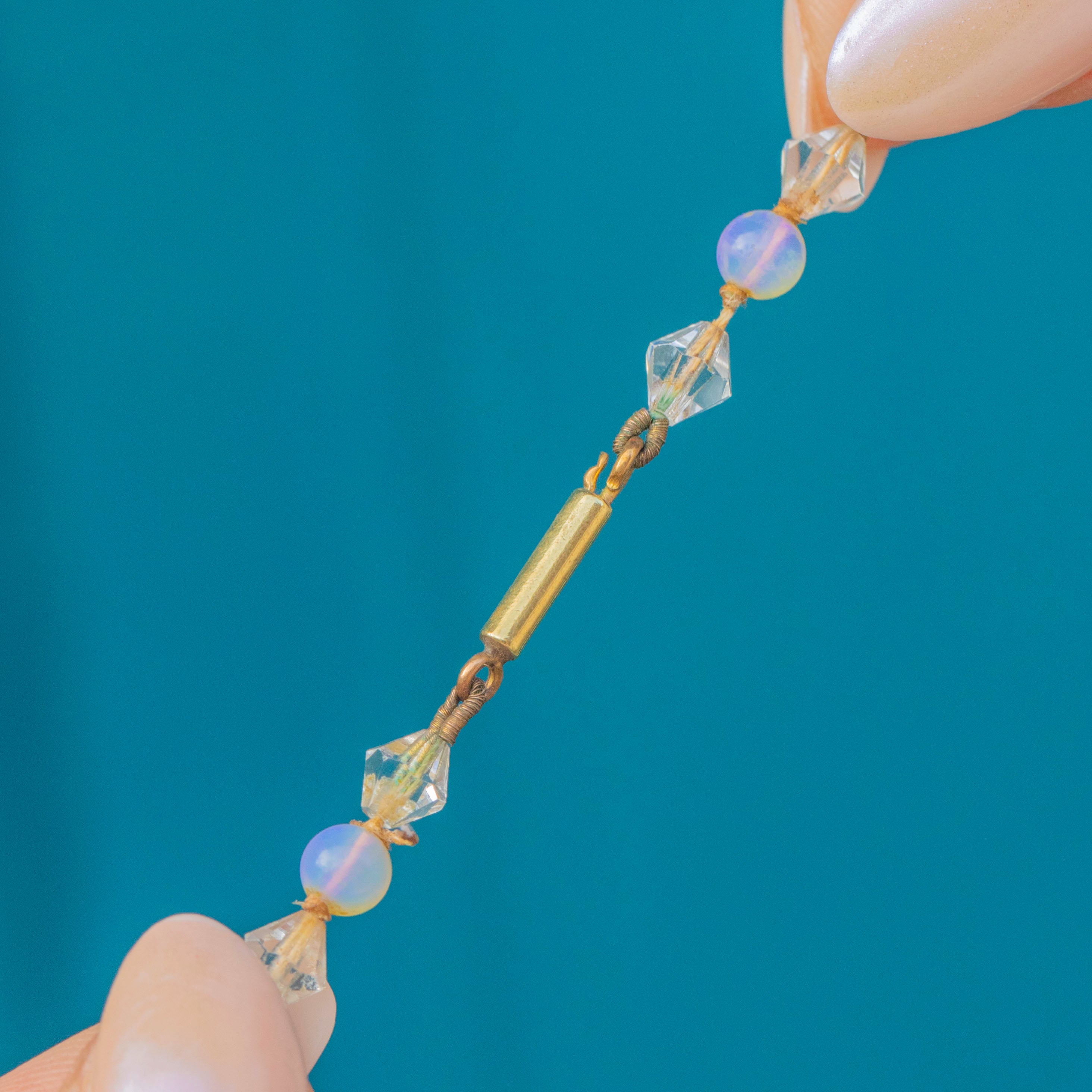 We simply adore this Art Deco graduated Opal beaded necklace! As though plucked from outer space, her spherical Opal beads flash with electric blues and peachy pinks, with alternating faceted Paste gemstones for an extra touch of glamour.