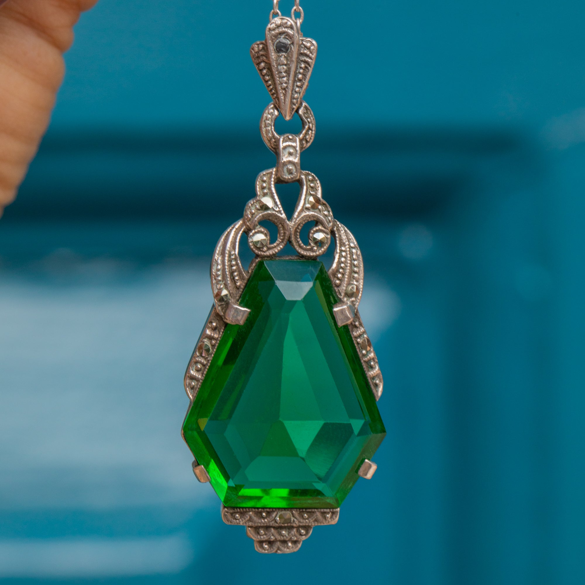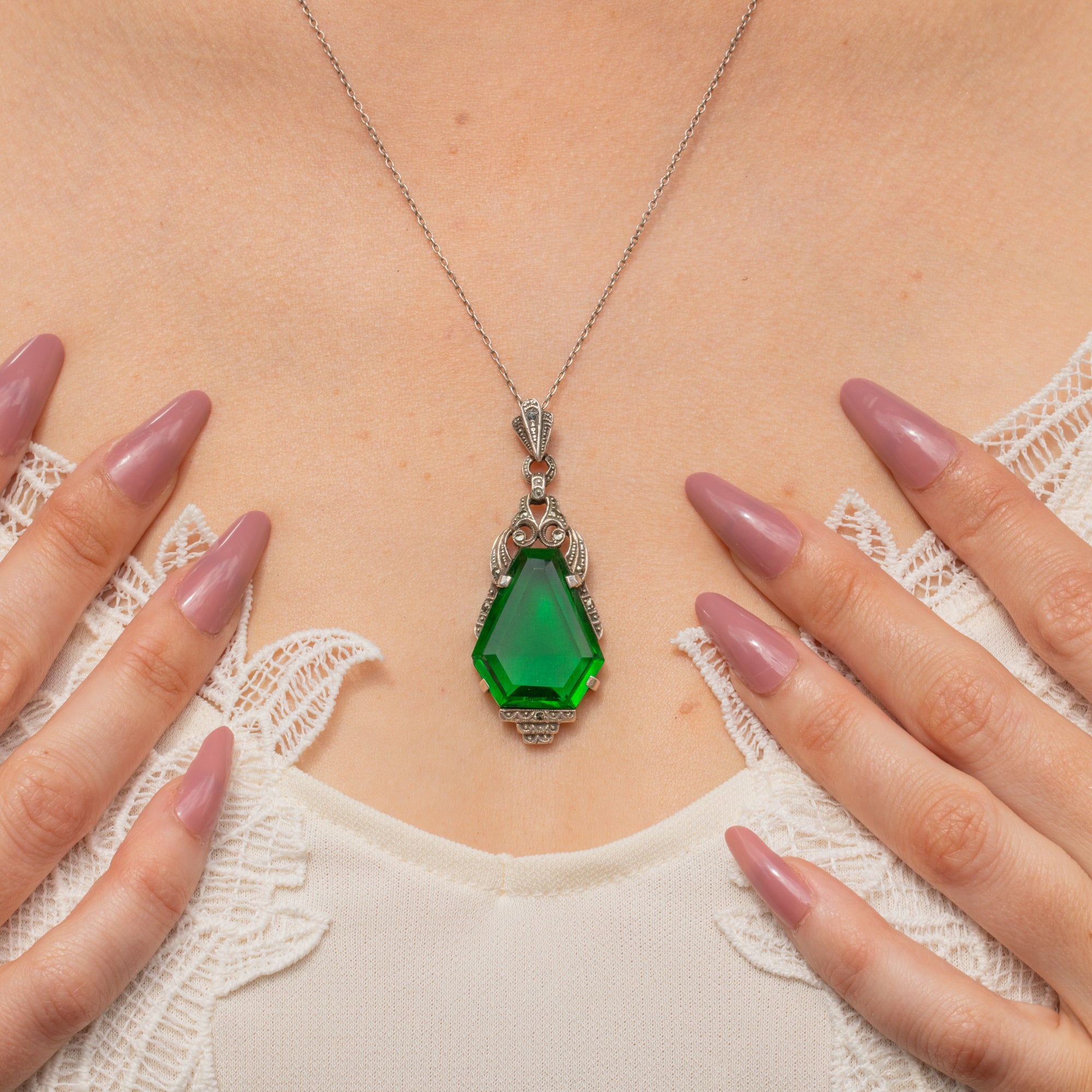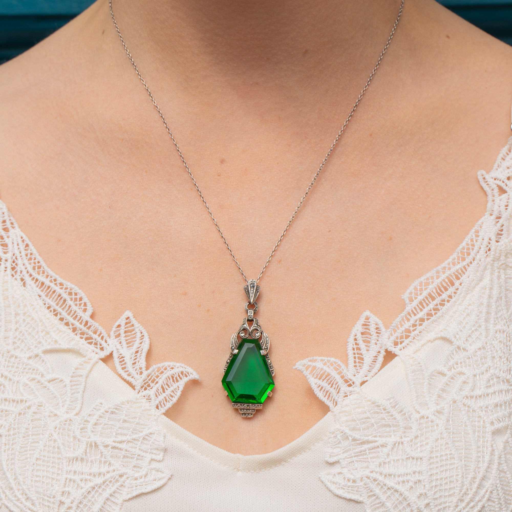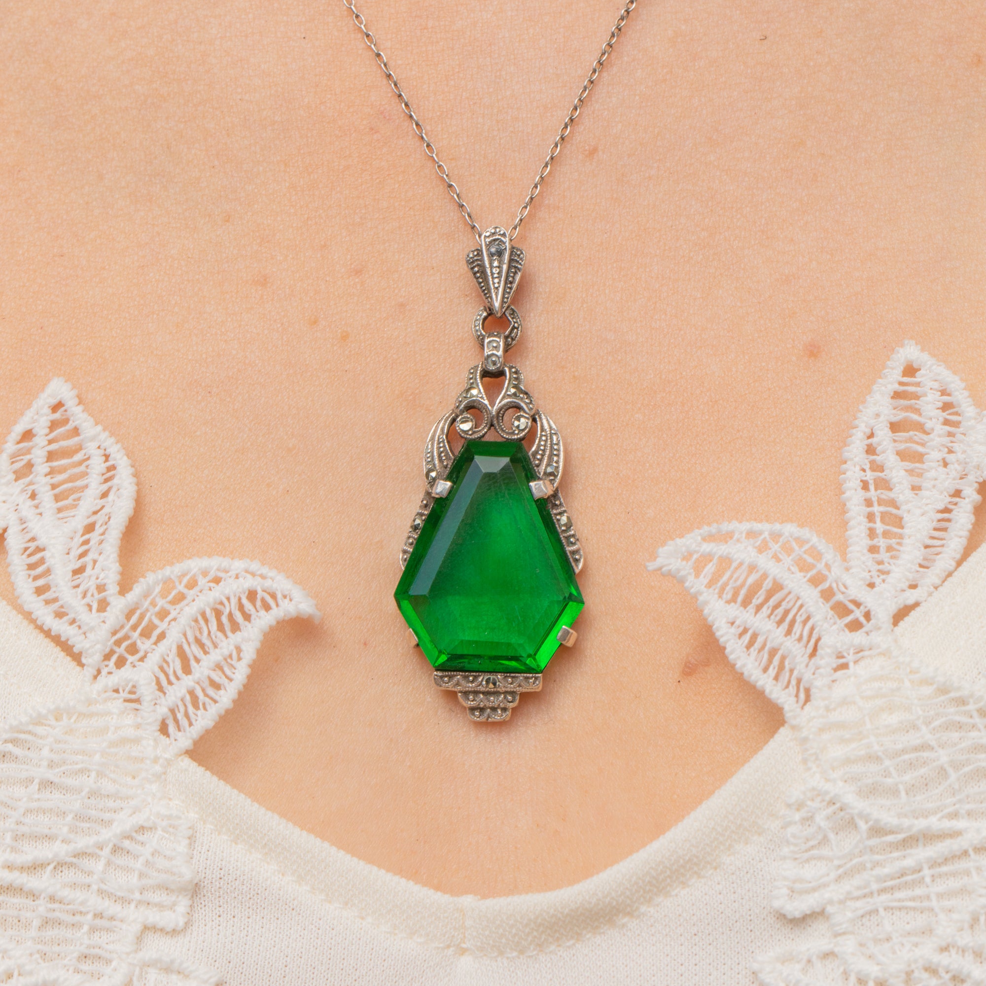 Art Deco Green Paste Marcasite Drop Pendant, with 18.5" Chain