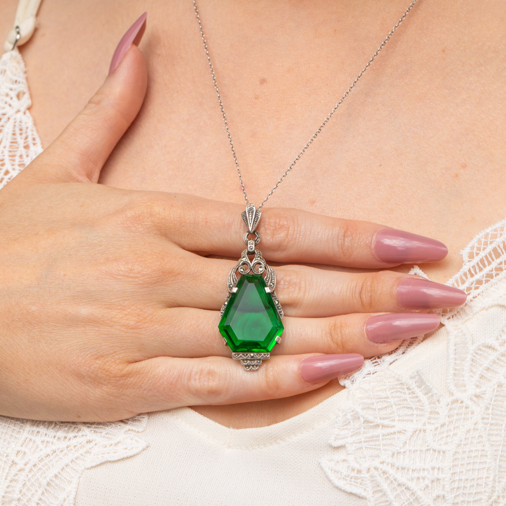 This Art Deco Silver green Paste & Marcasite drop pendant is an eye-catching piece and will make a statement wherever she goes, with the sleek forest green Paste gemstone as the focal point!