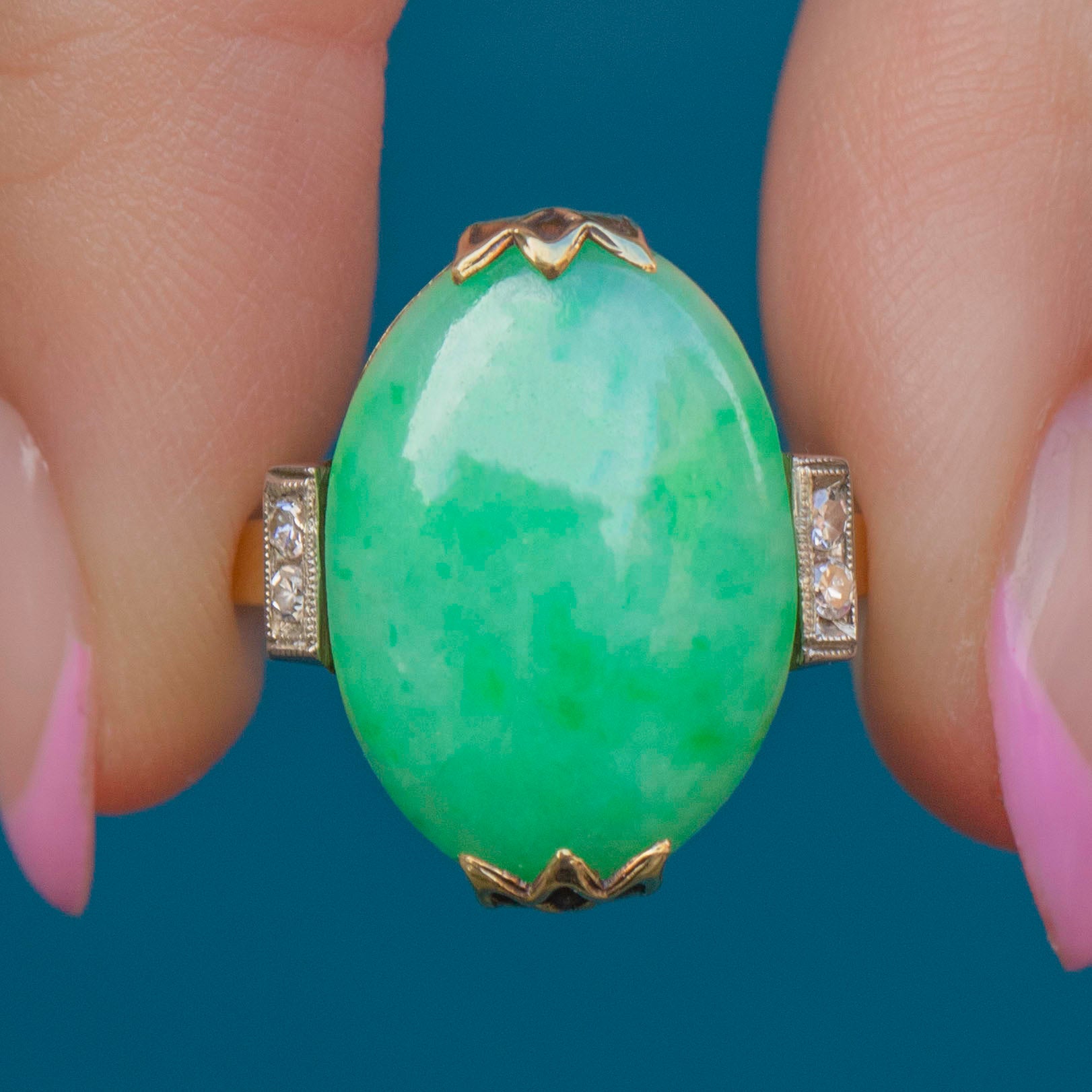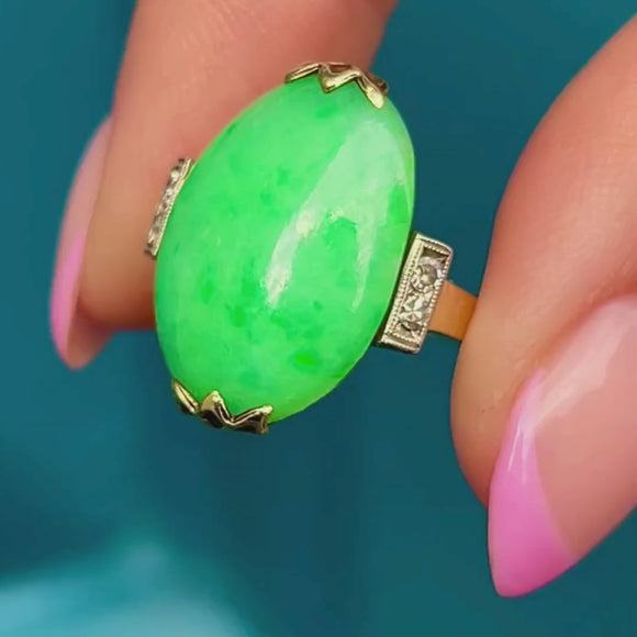We think this Art Deco Jade cabochon Diamond cocktail ring is a gorgeous piece. The Jade has that classic fresh and minty green tone, with a wonderful mottled effect filled with fern hues, as well as two sparkly Diamond accents on either side!