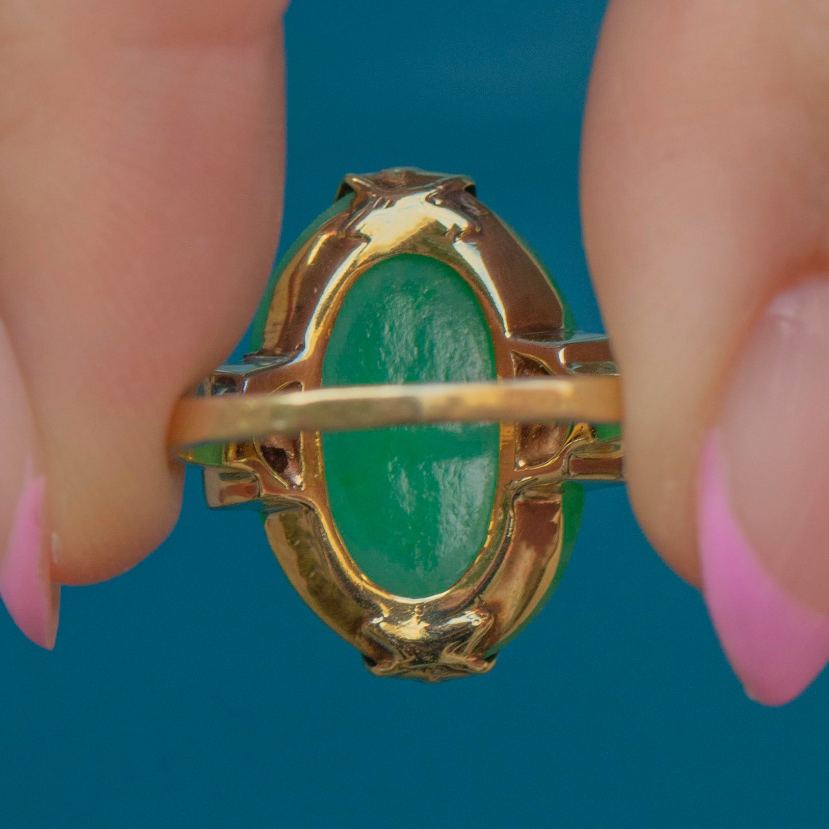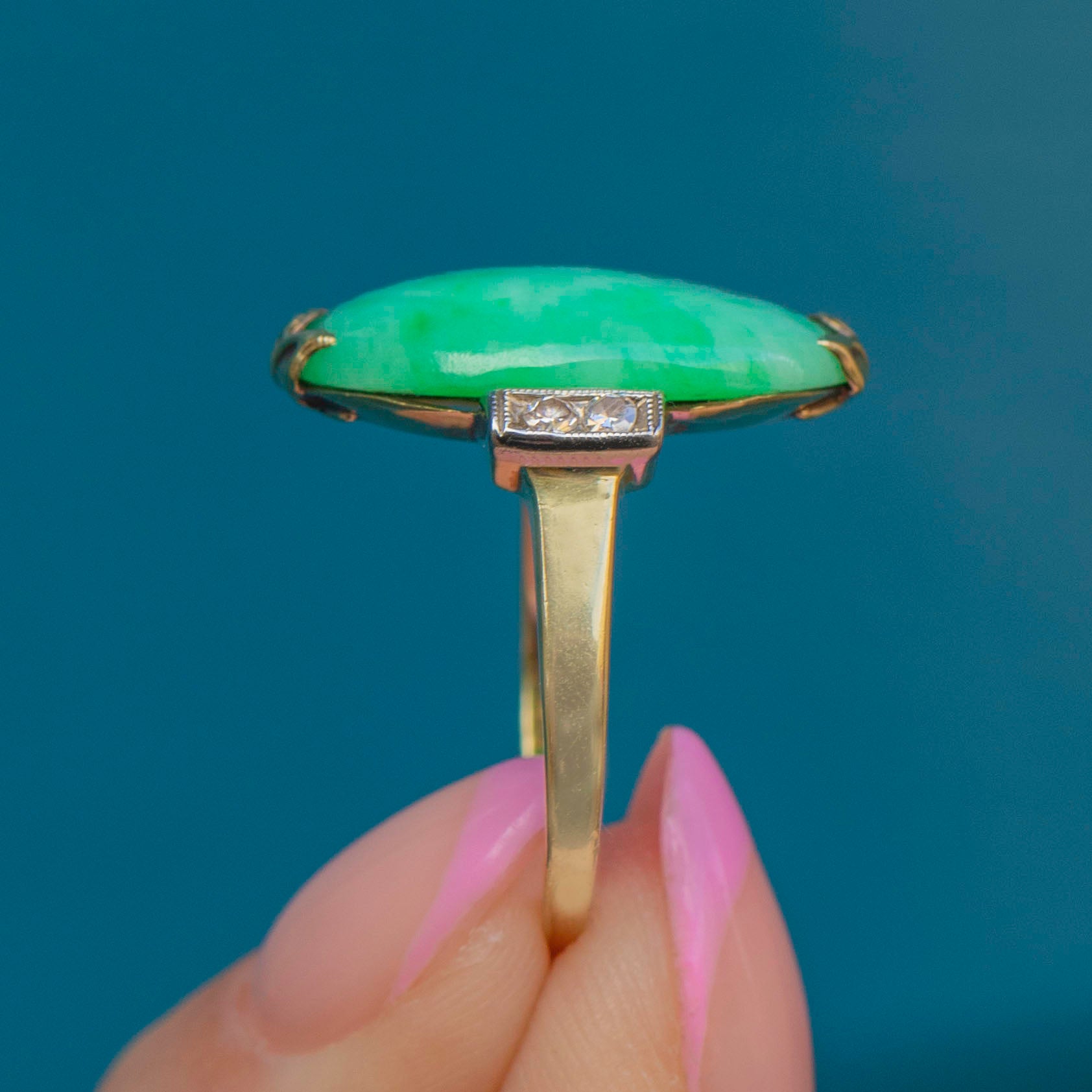 Complete with a sleek and slender 14ct Gold shank, she emanates elegance from all angles. Providing ample finger coverage, this Jade ring will bring a perfect pop of colour to every outfit!