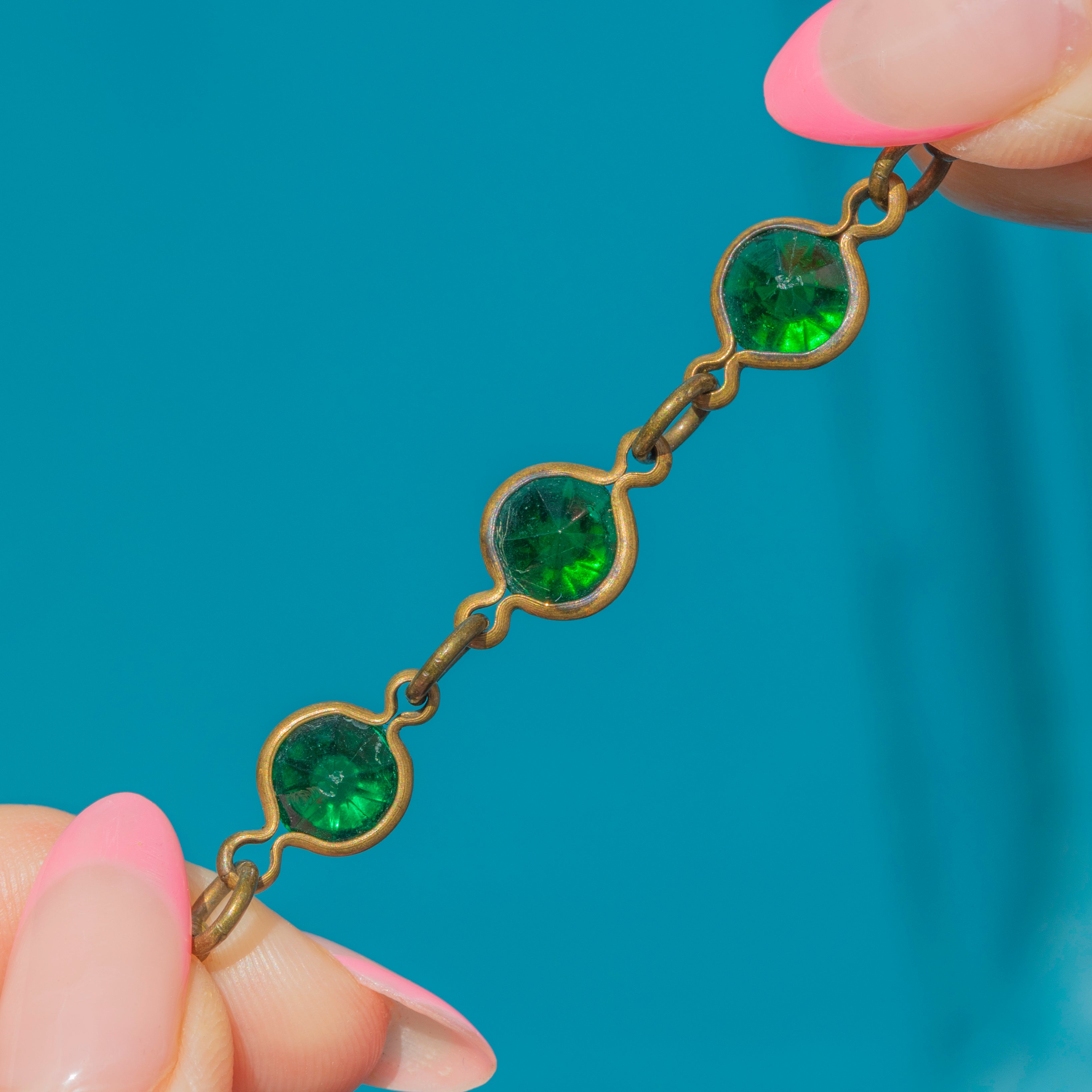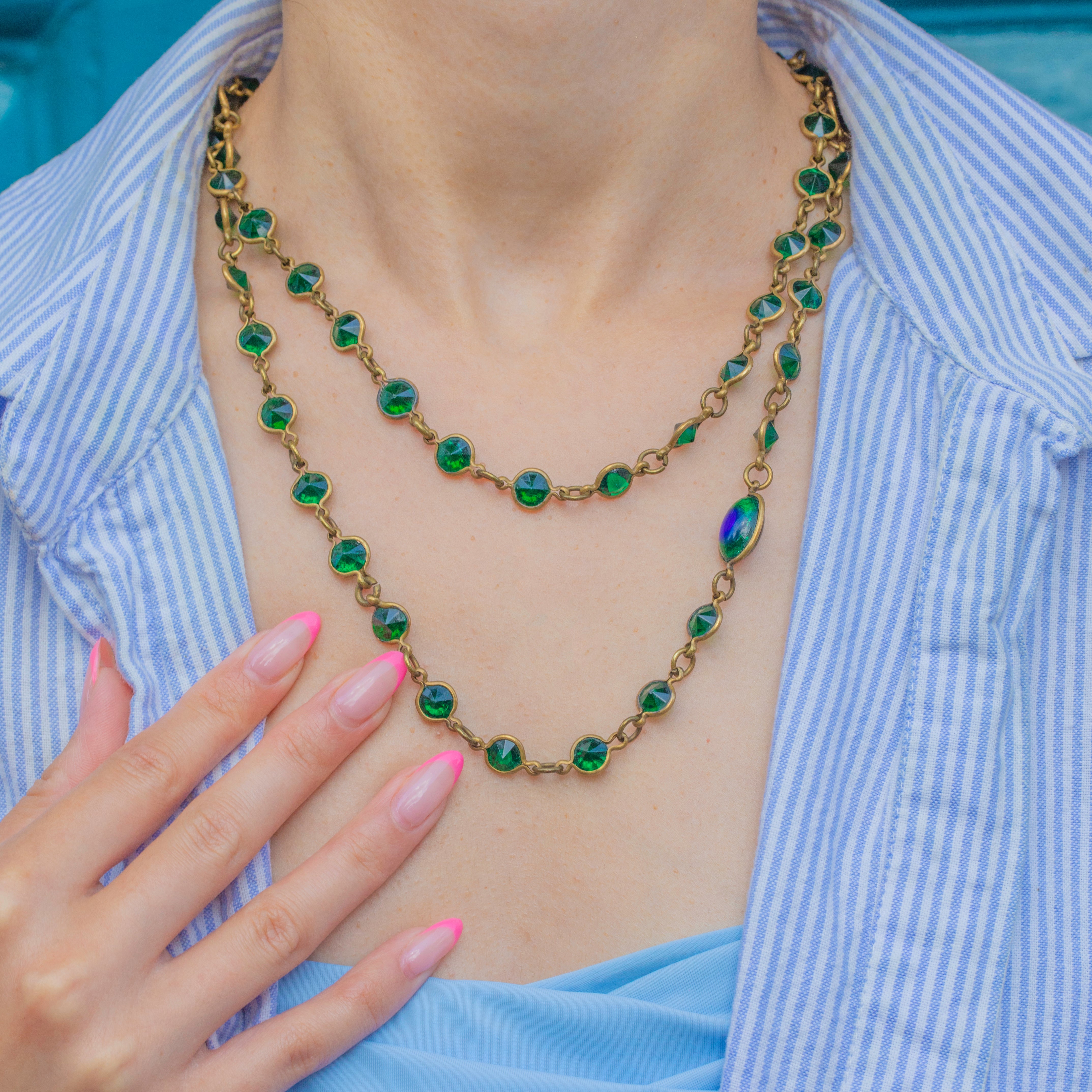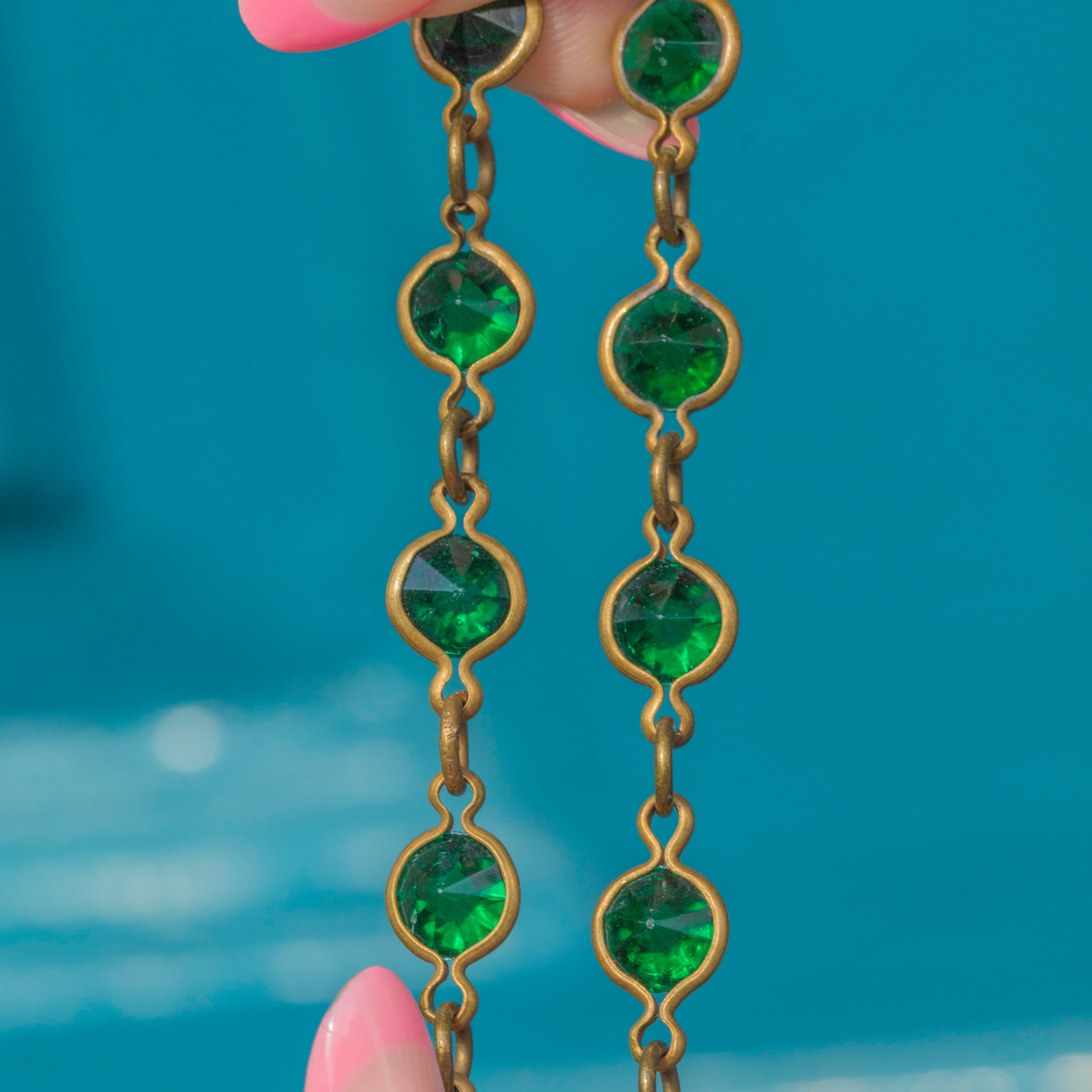 We love the bright tones coming from this Arts & Crafts Paste peacock eye longuard necklace! Made using a Gold toned metal and vibrant green Paste gems, this necklace will instantly add some life into your collection