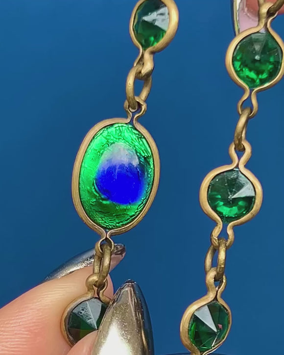 EXCELLENT. This Arts & Crafts green Paste peacock eye longuard necklace is in excellent condition. The necklace is so striking, each bright Paste gem is present and there is only minor surface wear commensurate with age!