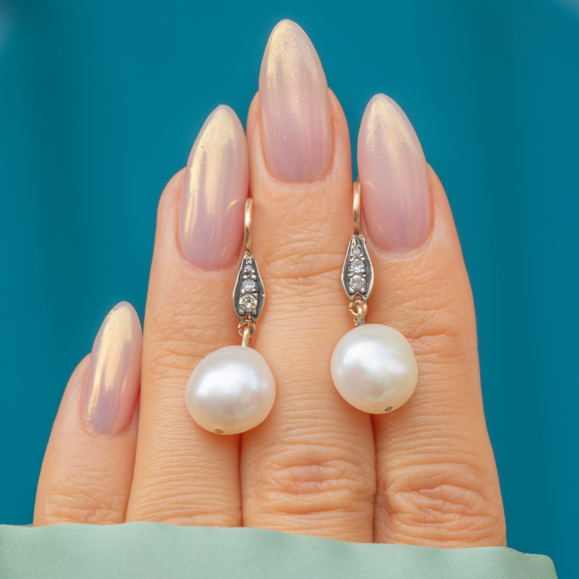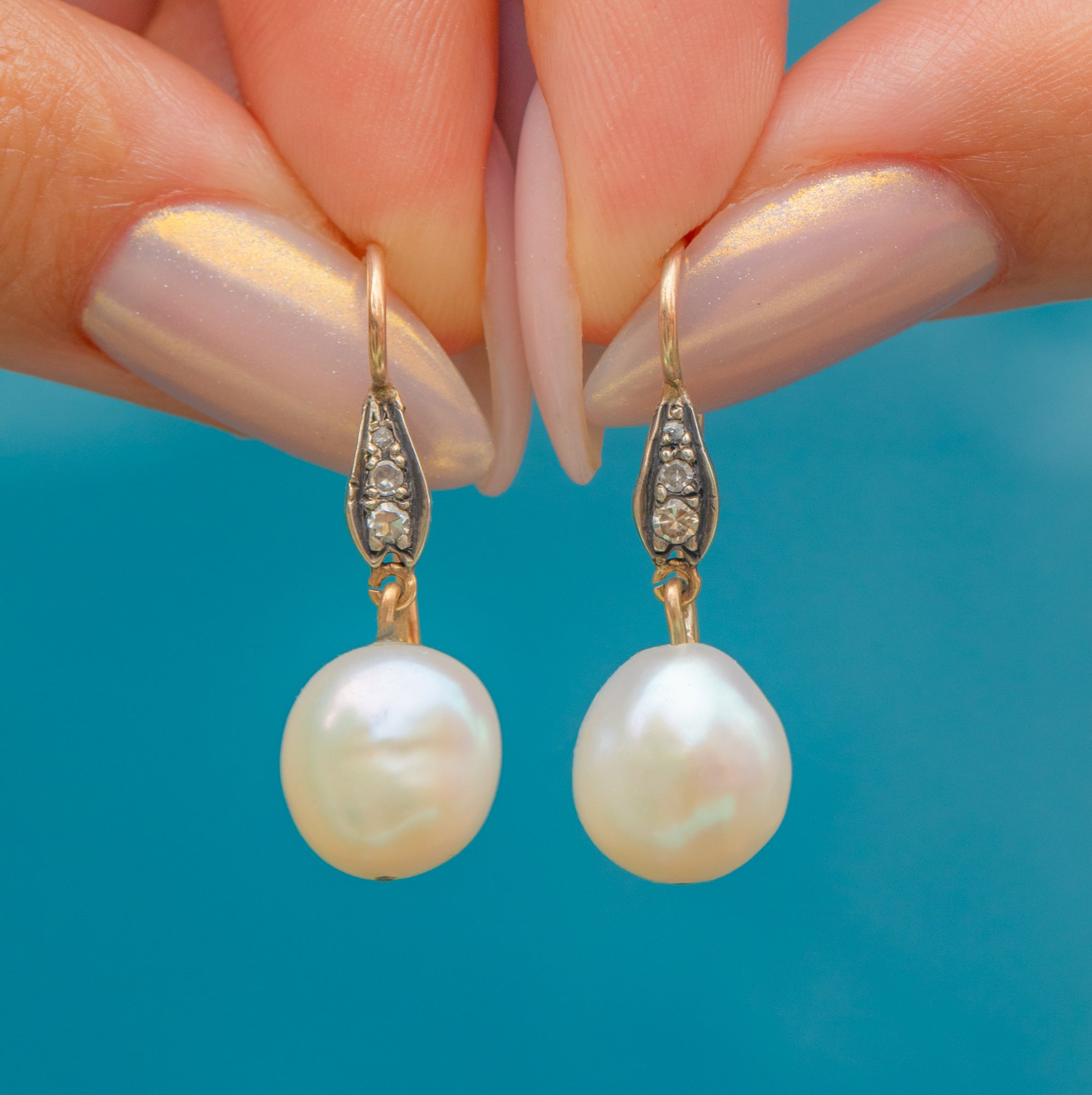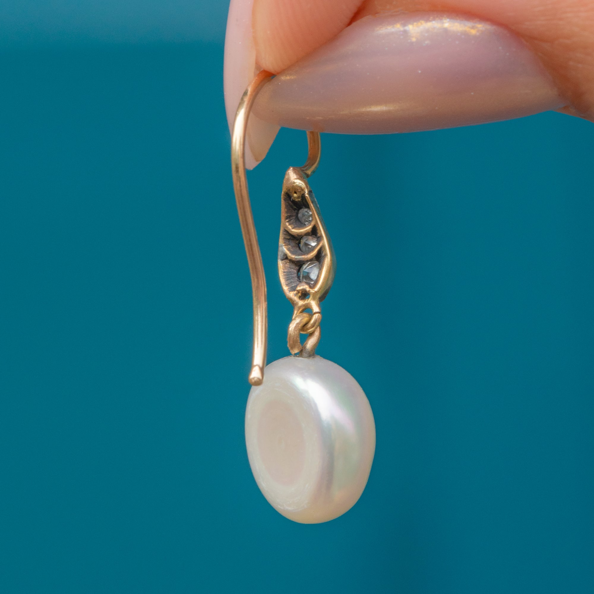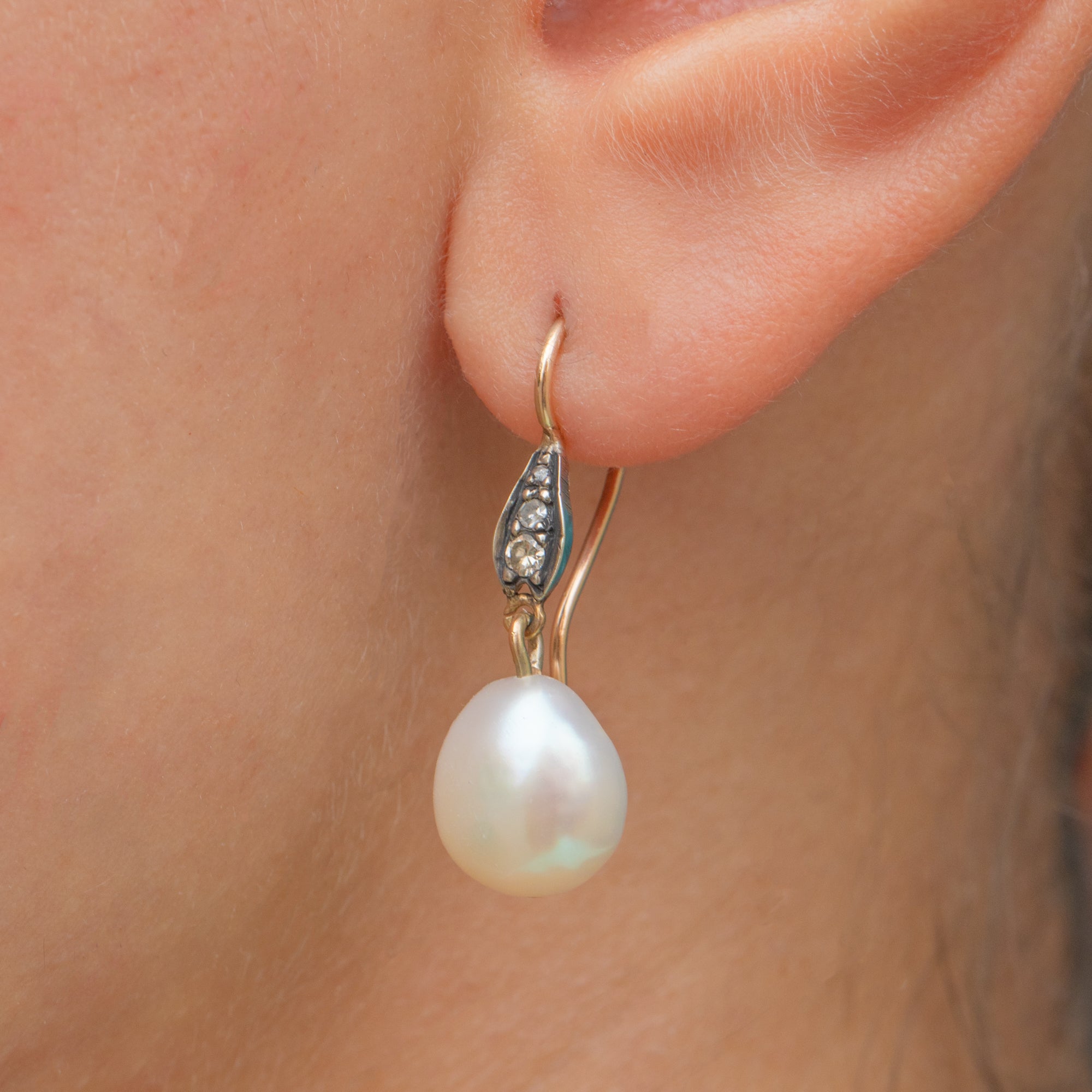 MATERIALS: Tests as 18ct Gold body & settings, 9ct Gold hooks, Pearls, Diamonds.