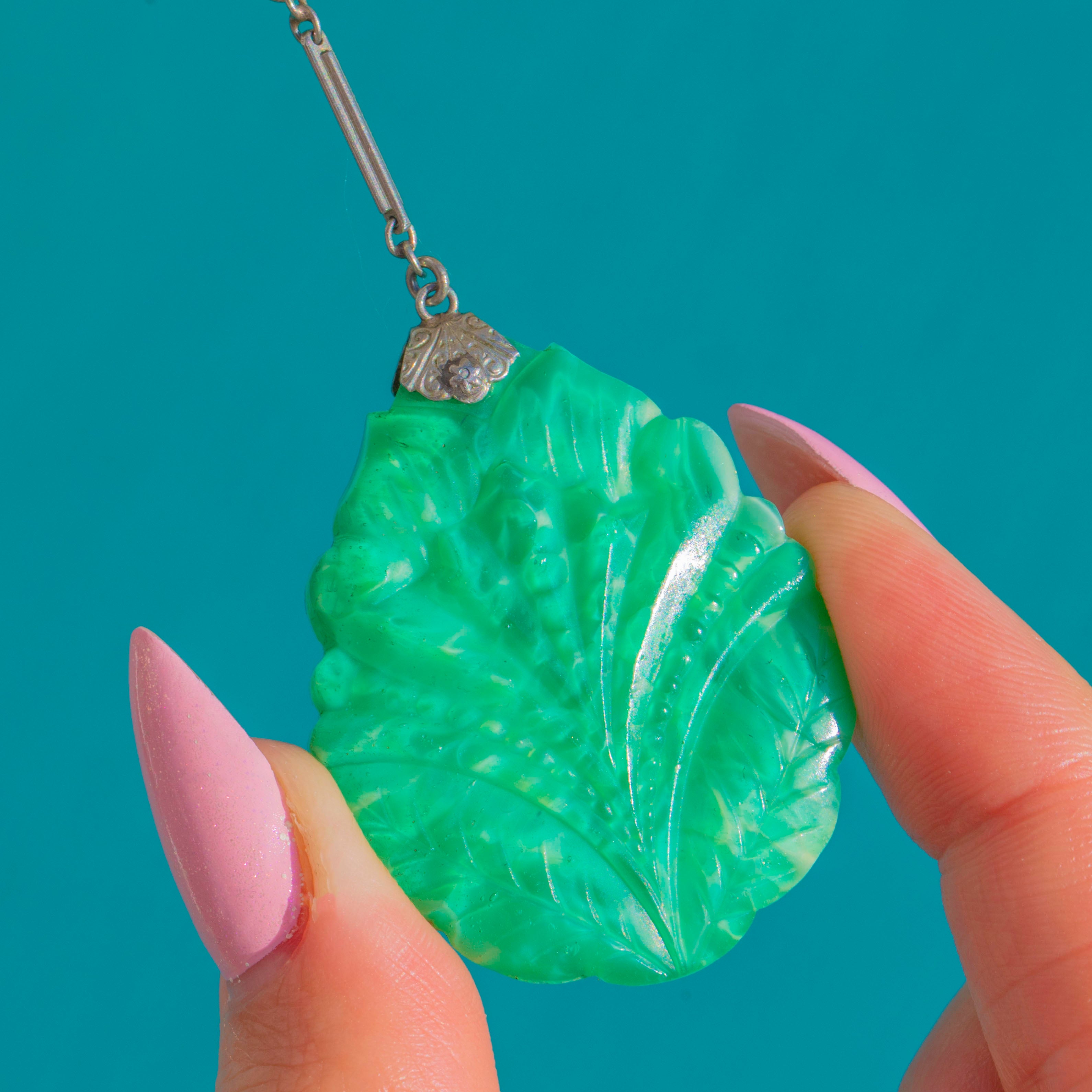 A rare Art Deco flapper necklace in vivid carved green Glass Jade, elegantly strung on a sleek Platinon bar-link chain. The bright, sculptural drops dance along the neckline and gather into a graceful foliate pendant, creating a fluid, elongated Y-line that epitomises Jazz Age glamour.