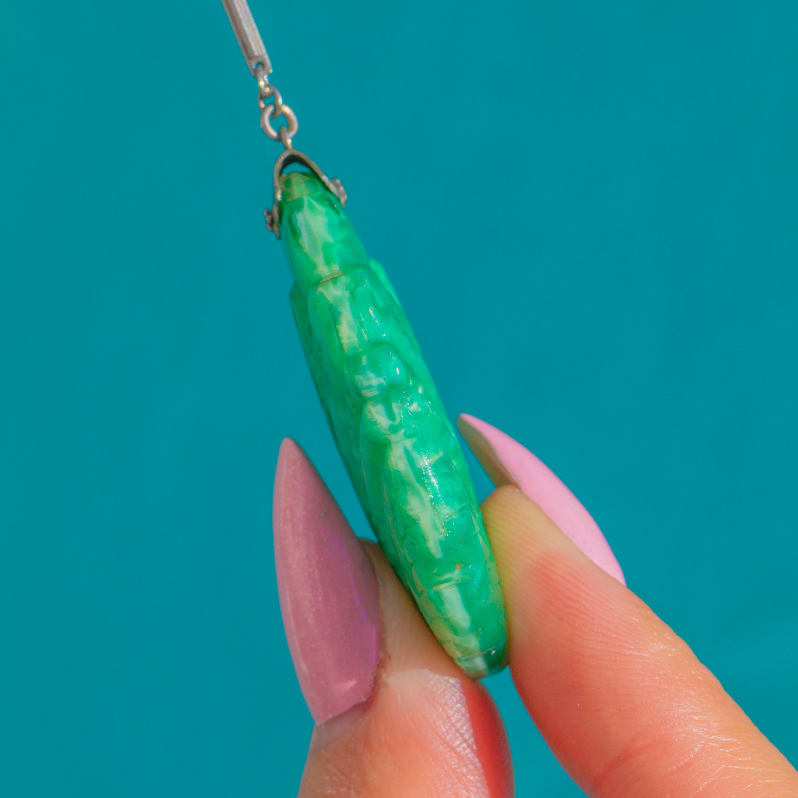 Art Deco Platinon Carved Green Glass Jade Flapper Necklace