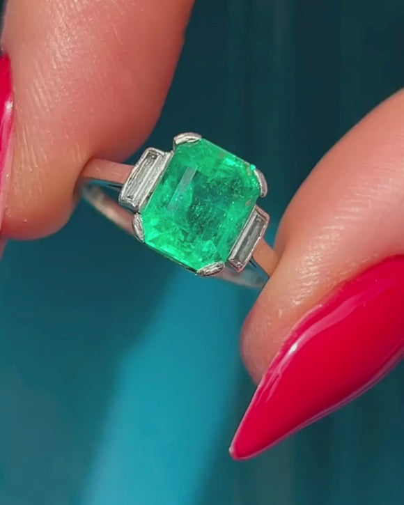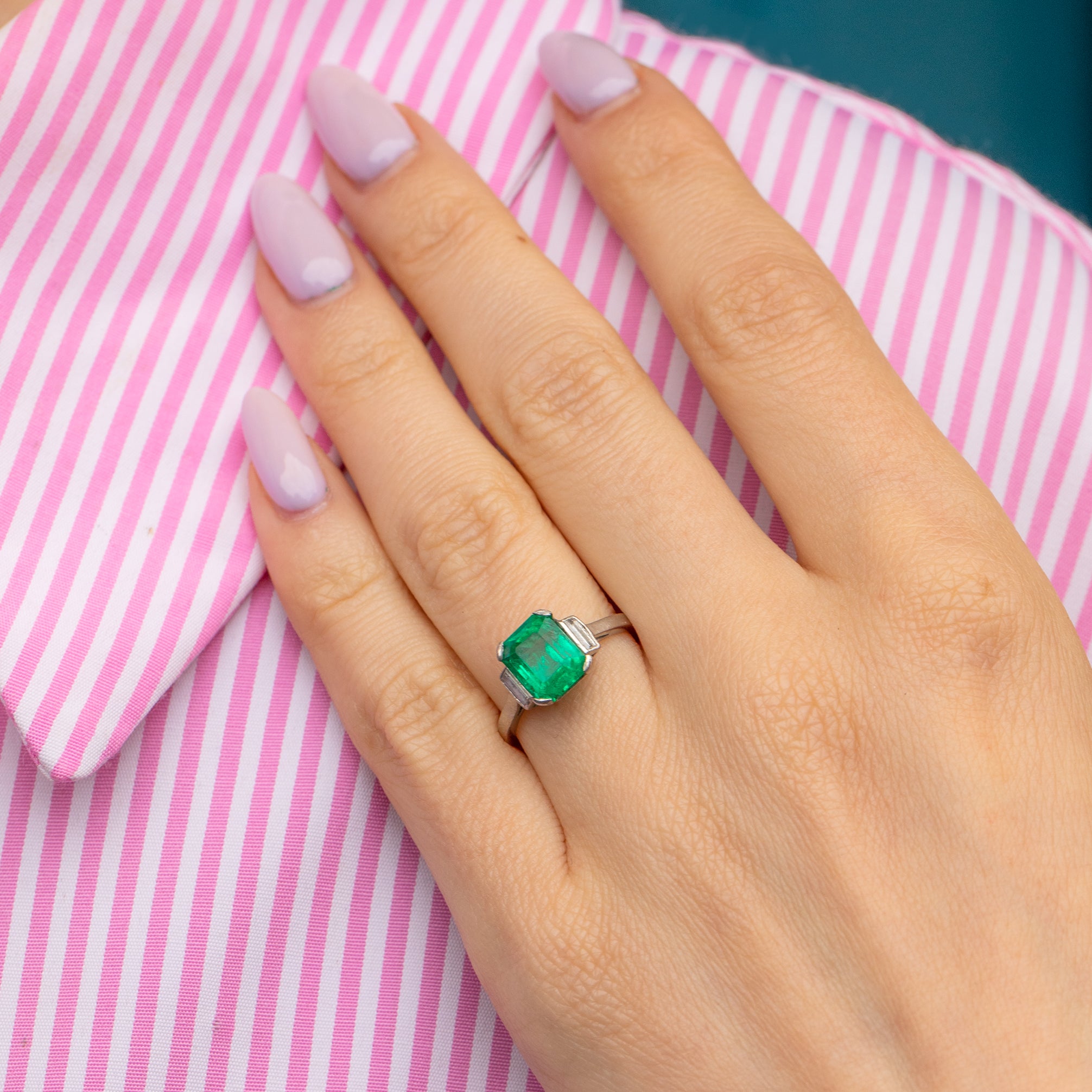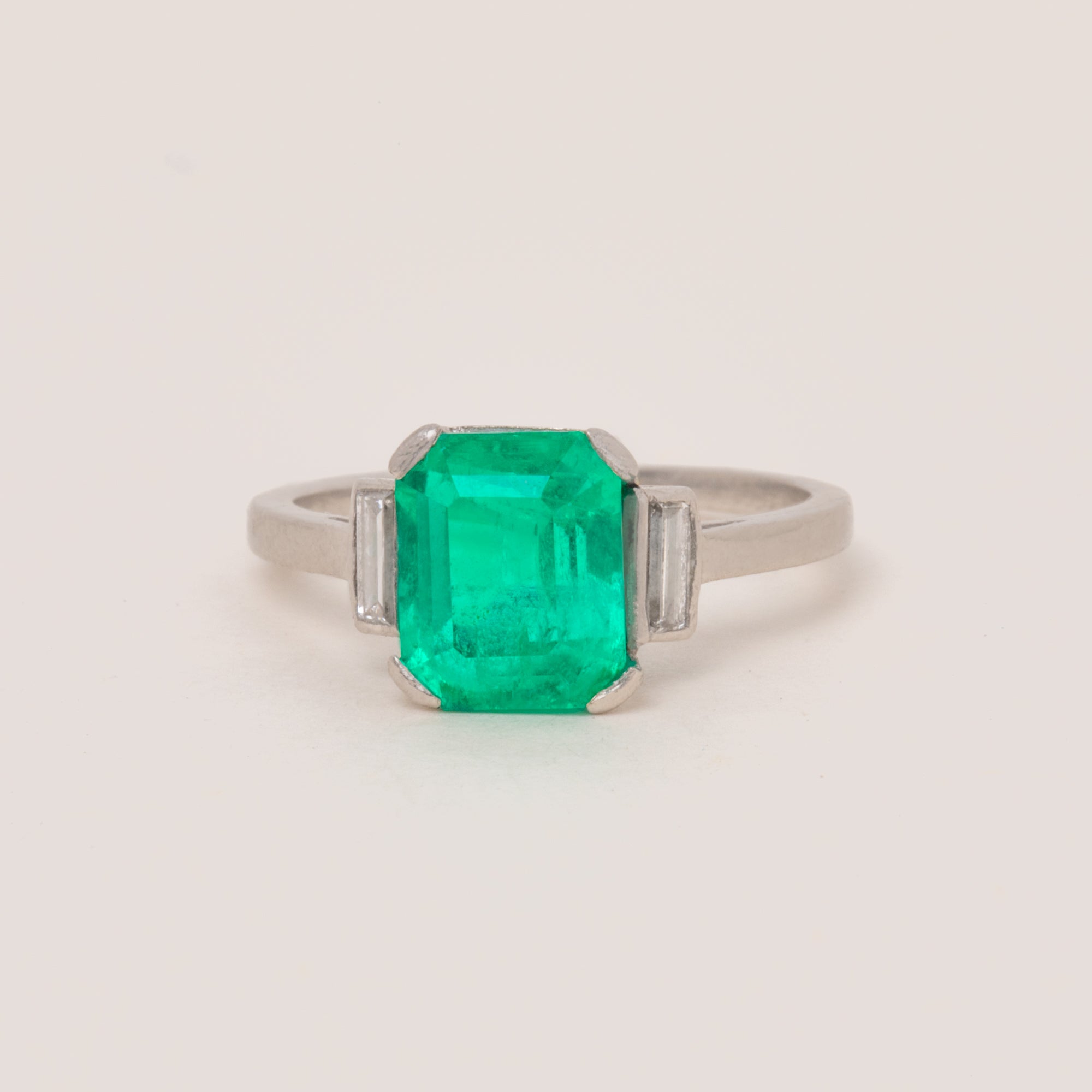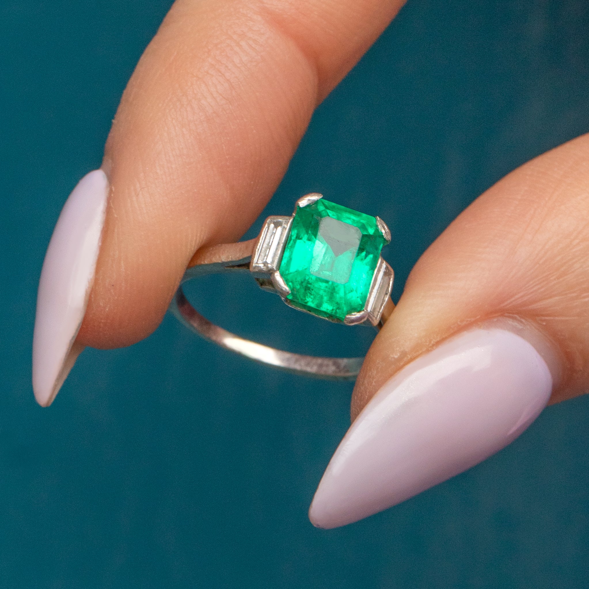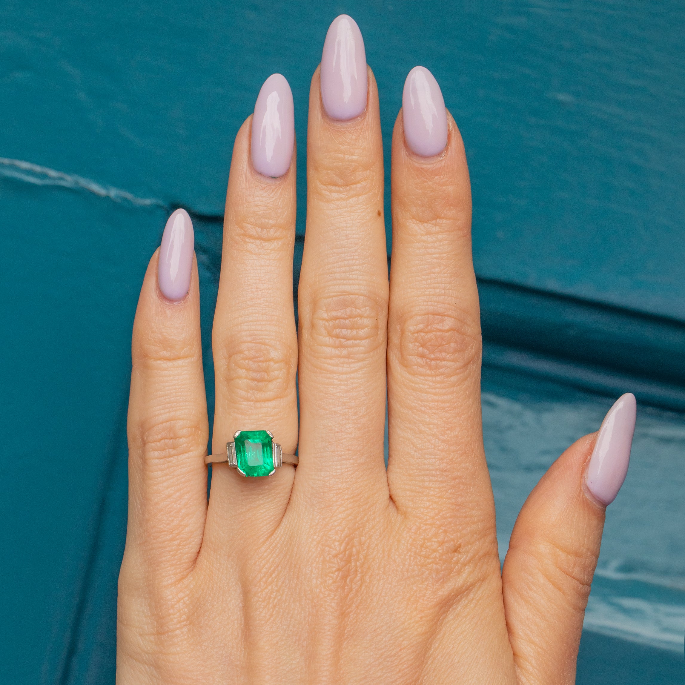 Nestled on either side of her Emerald are two baguette-cut Diamonds, adding an extra touch of splendour. The design of this Art Deco ring is effortless and will no doubt be a showstopper as she adorns your hand. Bringing you only the best with this Emerald Diamond ring, she bound together by solid Platinum providing a lifetime of luxury!